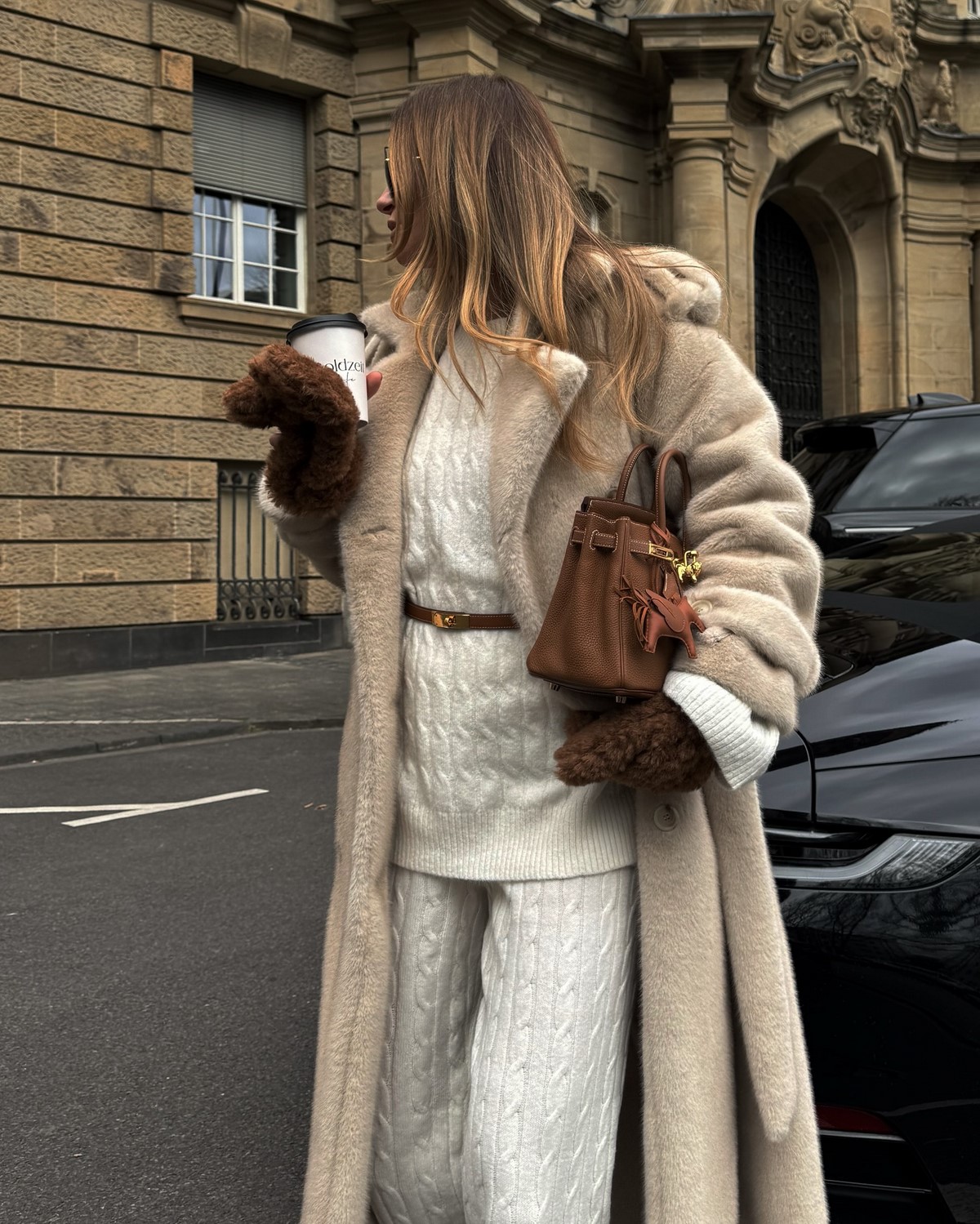 Трикотажные тотал-луки — один из самых уютных трендов зимы 2025-2026. Комплекты из вязаного свитера и юбки, мягкого платья или брюк из кашемира делают образ максимально комфортным и стильным. Важно выбирать модели с интересной фактурой — крупной вязкой, асимметричными деталями или объемными рукавами. Такие комплекты легко дополняются пальто или дубленкой, создавая гармоничный образ.