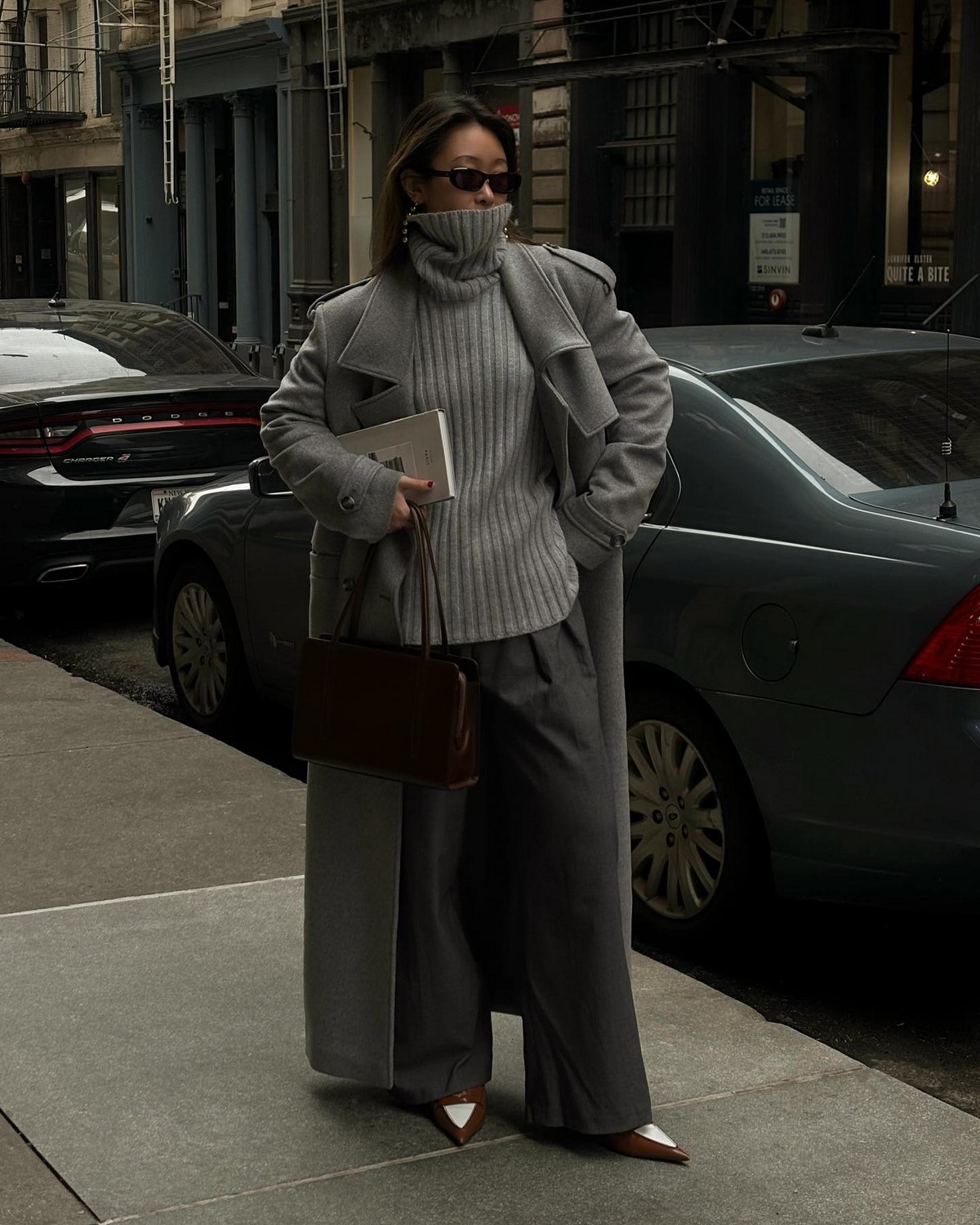 Водолазки, свитеры и платья с высоким горлом становятся обязательным элементом зимнего гардероба. Они не только согревают, но и делают образ изысканным. Высокий ворот прекрасно сочетается с акцентными украшениями, большими серьгами и шарфами. В 2025-2026 дизайнеры экспериментируют с объемными воротами и мягкими драпировками.