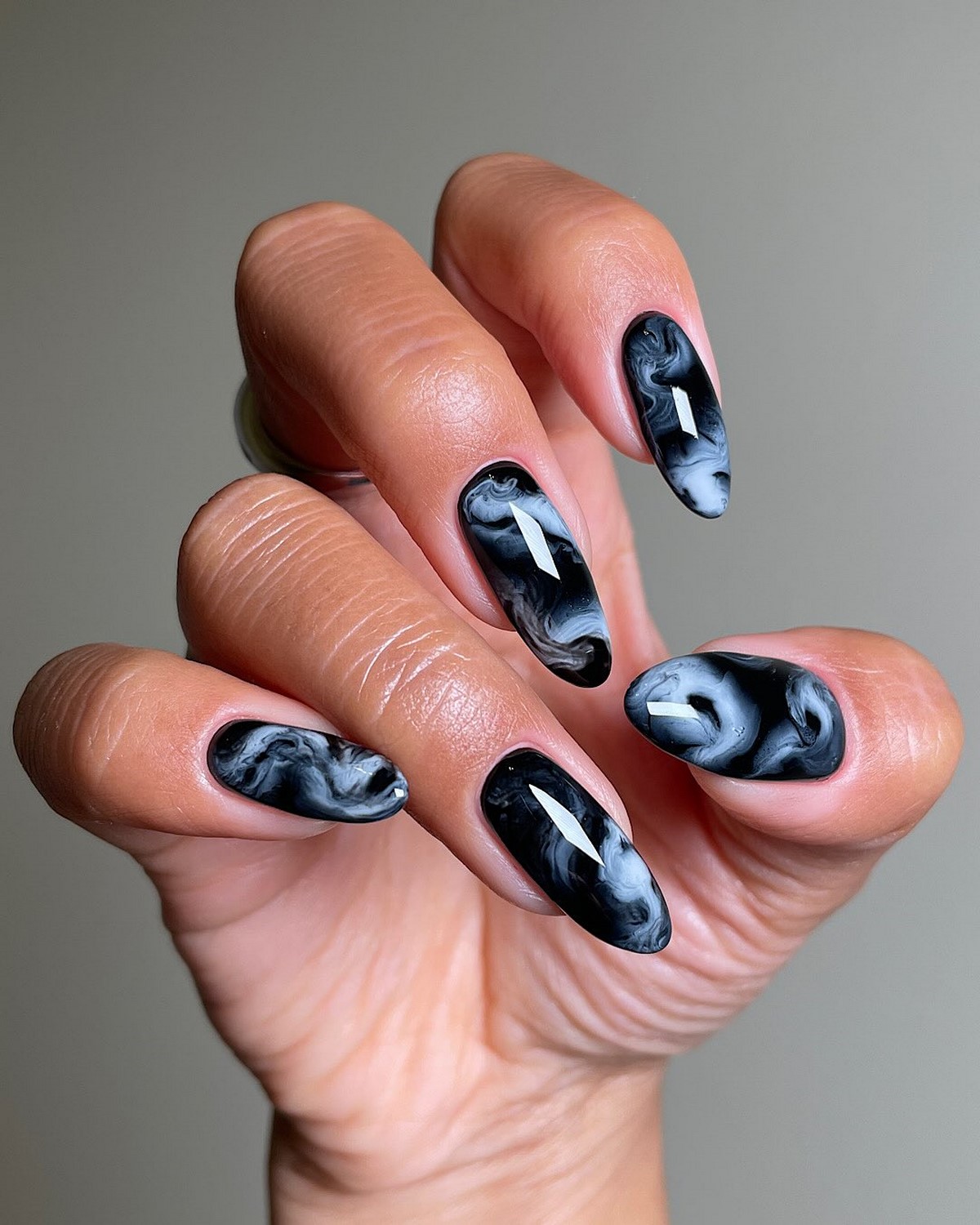 Полупрозрачные серые и черные тона, растушеванные как туман, создают загадочную атмосферу. Такой маникюр выглядит элегантно и современно, особенно с матовым топом. Подходит для тех, кто любит минимализм с налетом мистики.