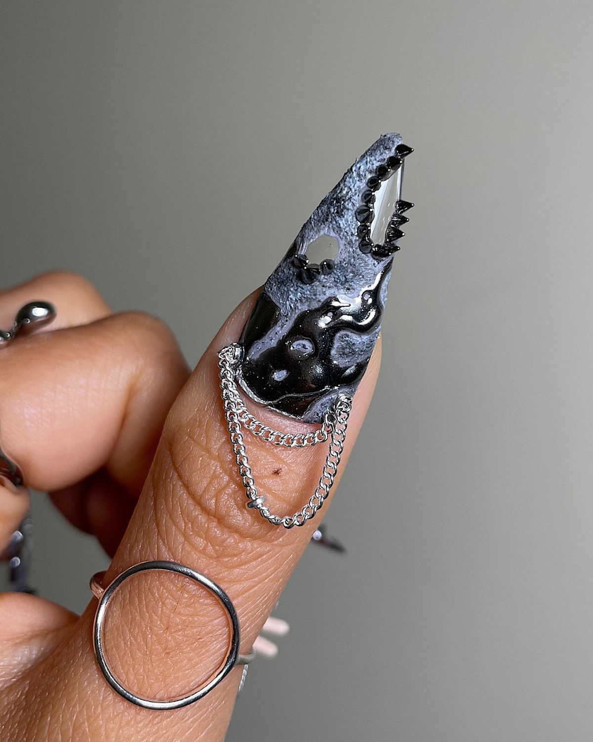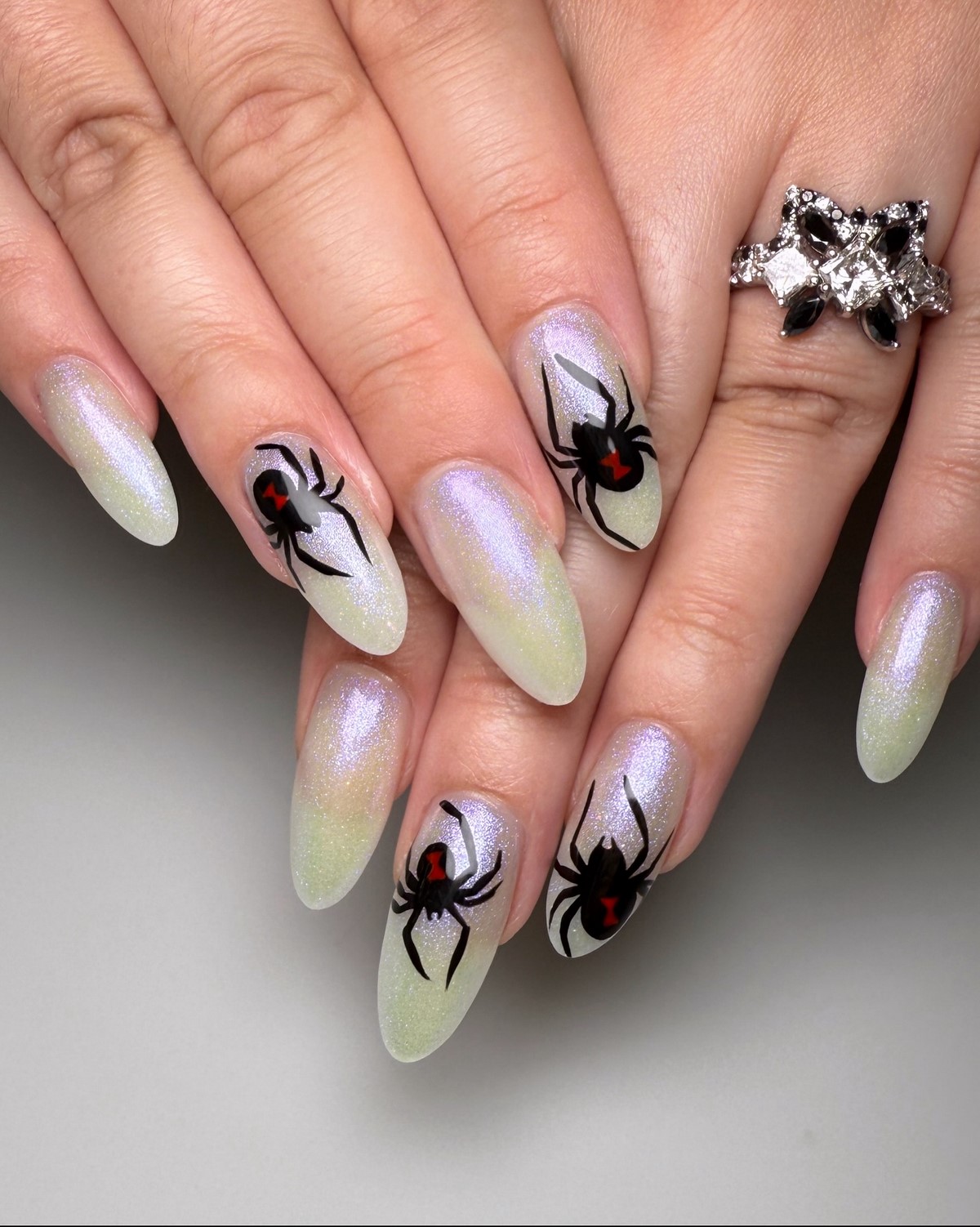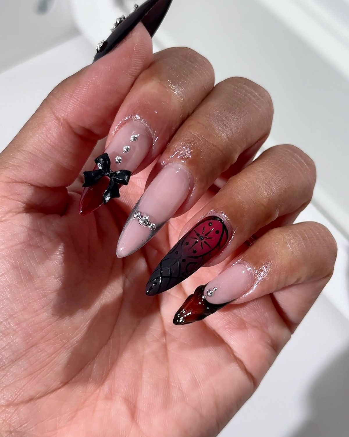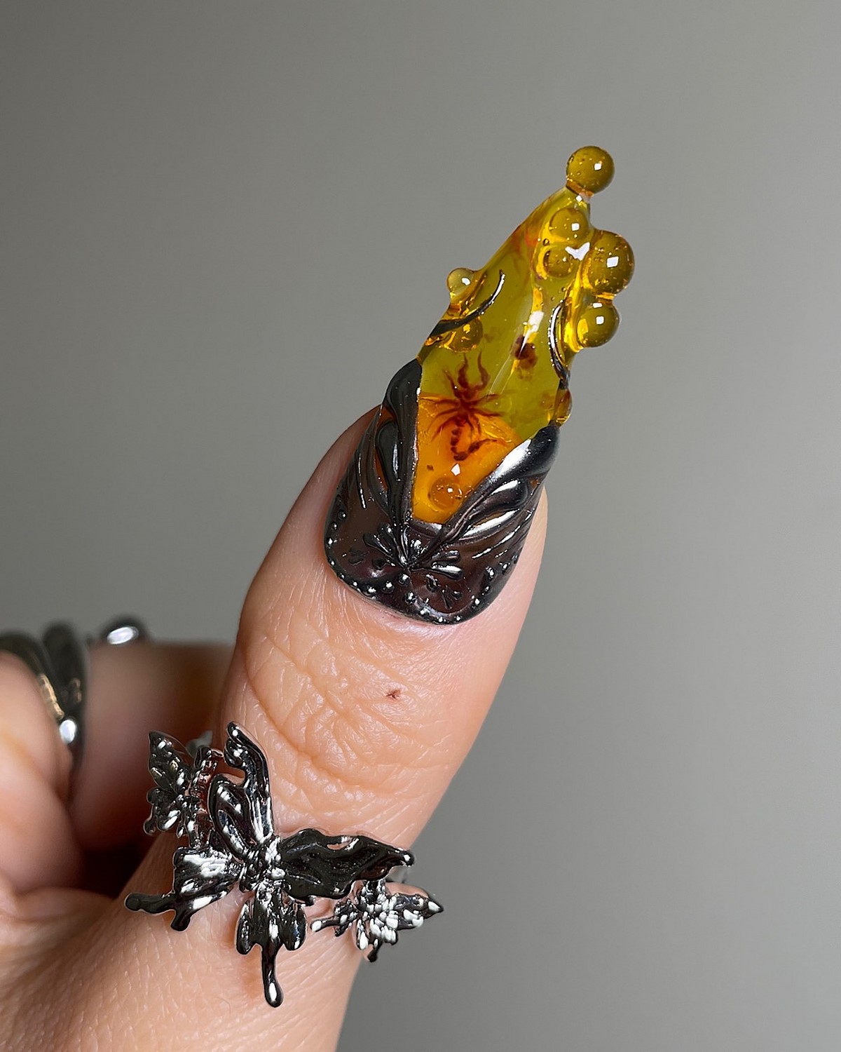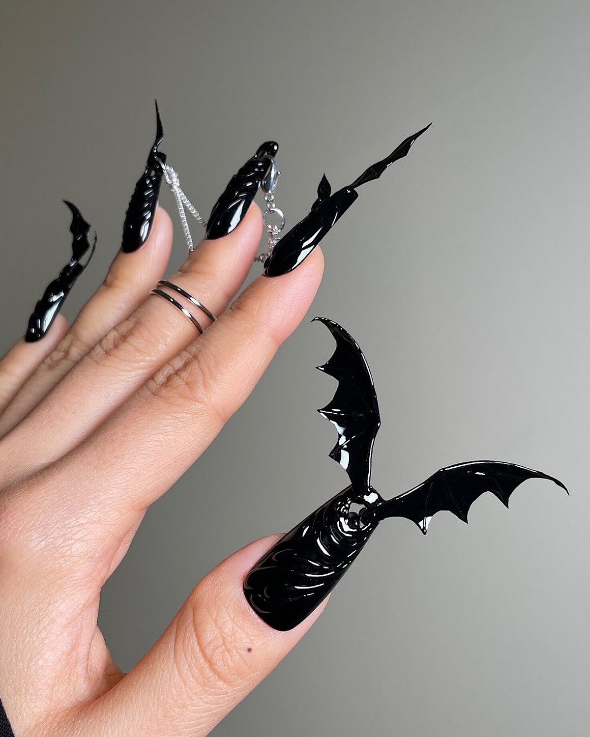 Объемные элементы в виде черепков, пауков или мини-глаз — для смелых и креативных. В 2025 году такие дизайны создаются в утонченной форме: стразы, текстуры, акриловые элементы не перегружают образ, а добавляют арт-декоративность.