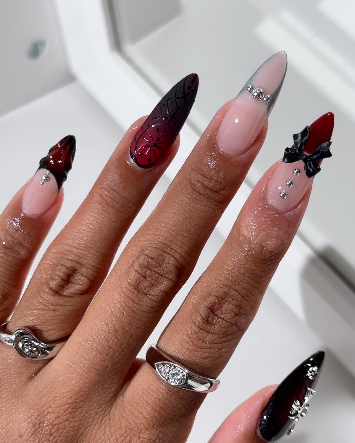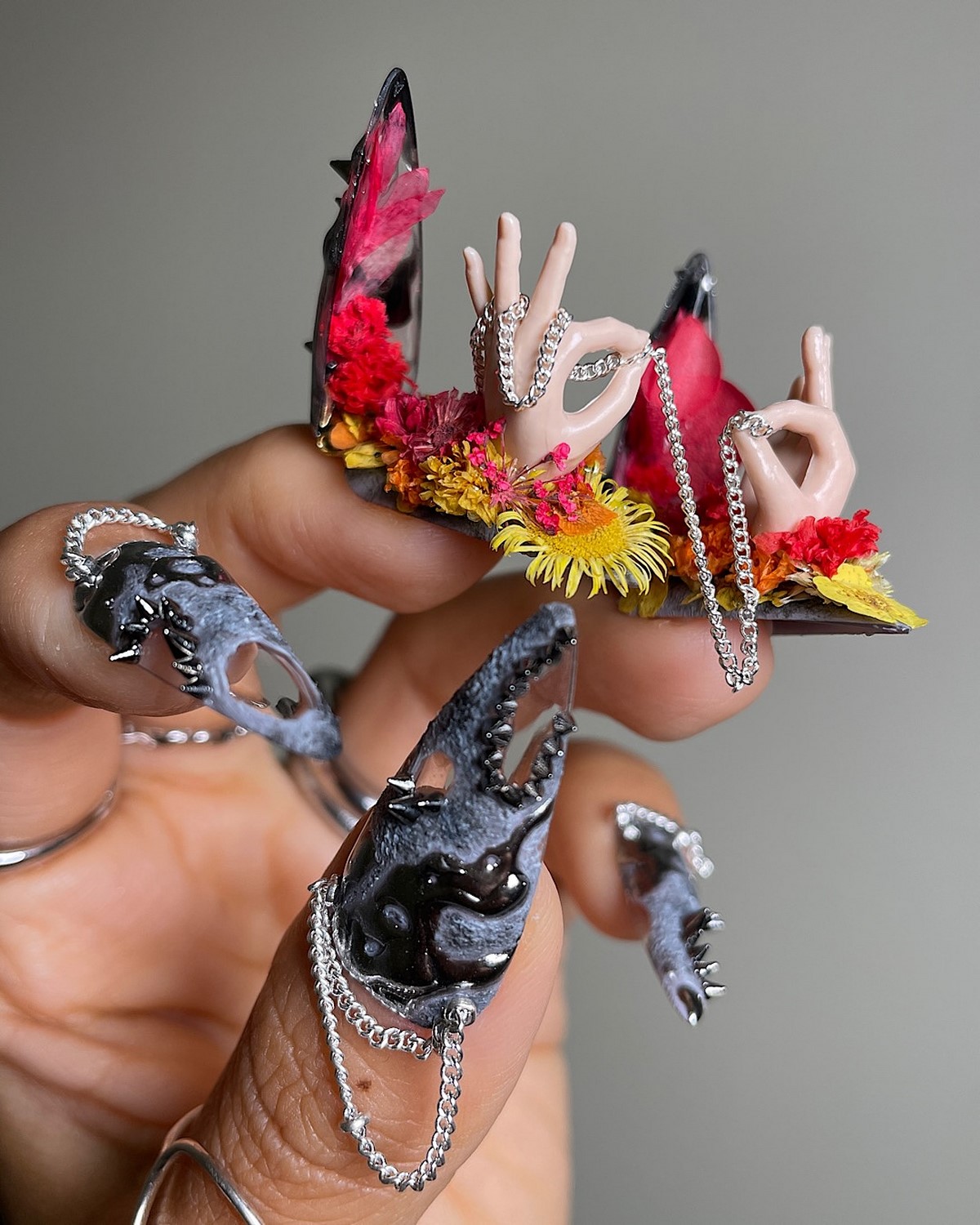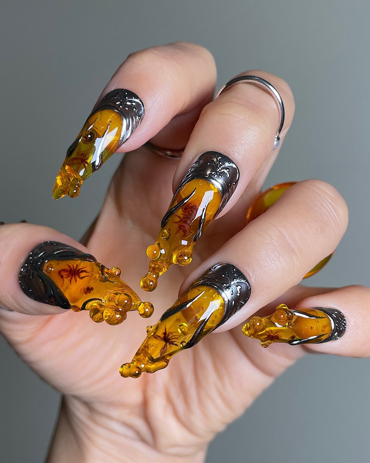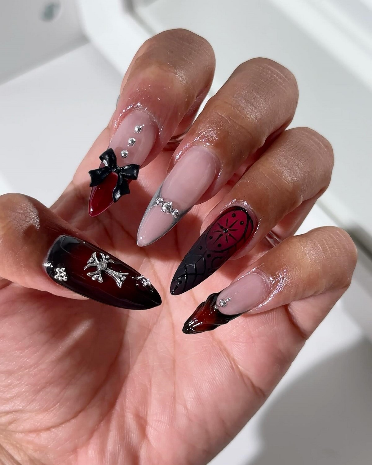 Объемные элементы в виде черепков, пауков или мини-глаз — для смелых и креативных. В 2025 году такие дизайны создаются в утонченной форме: стразы, текстуры, акриловые элементы не перегружают образ, а добавляют арт-декоративность.