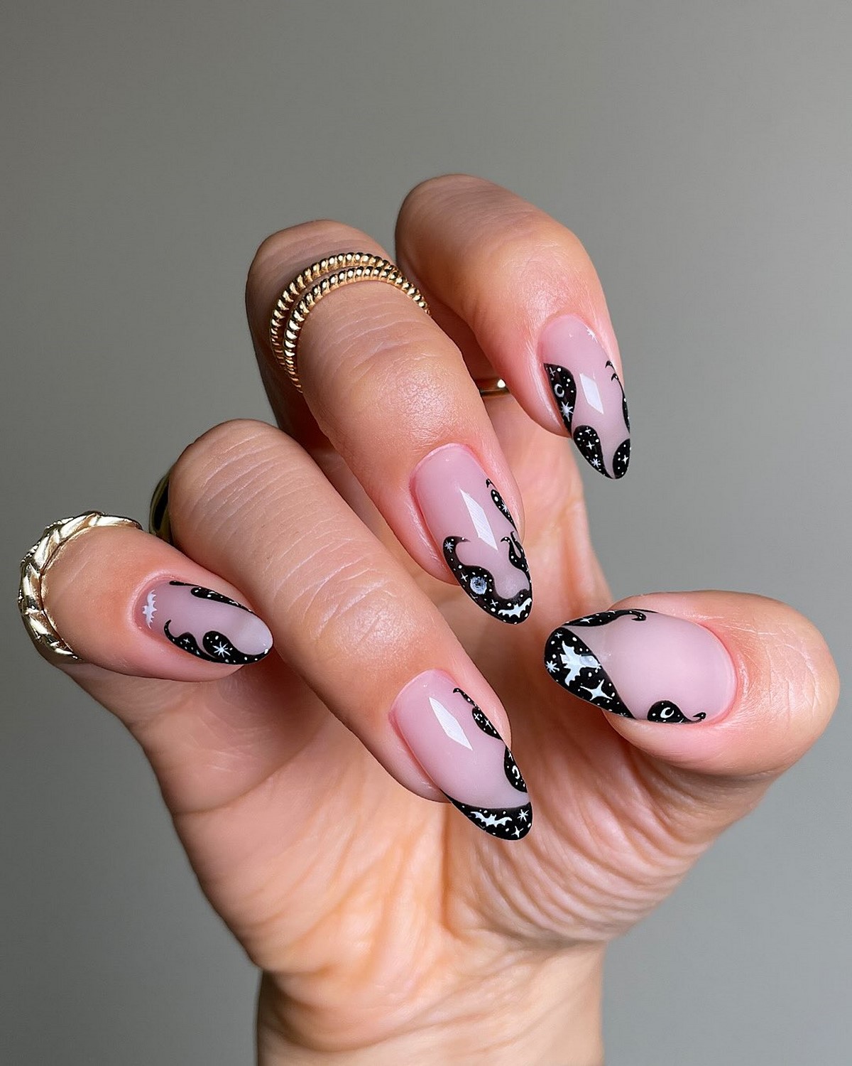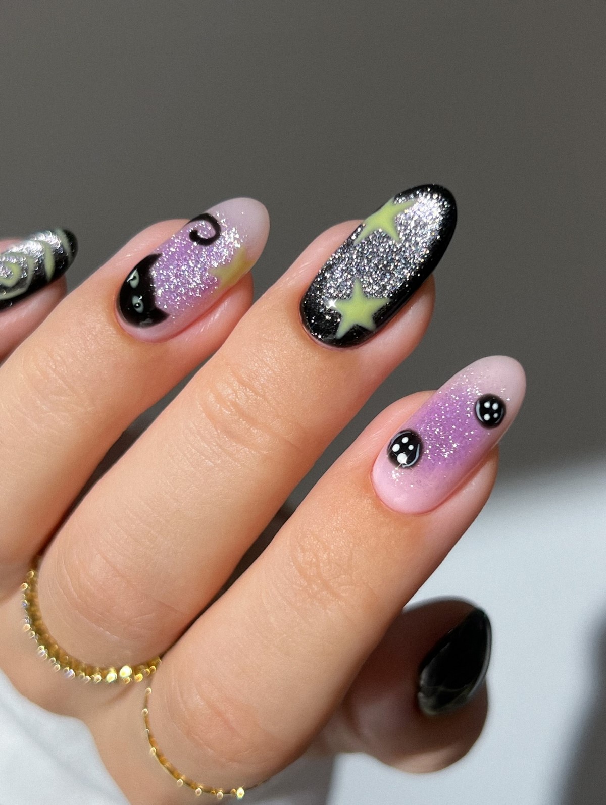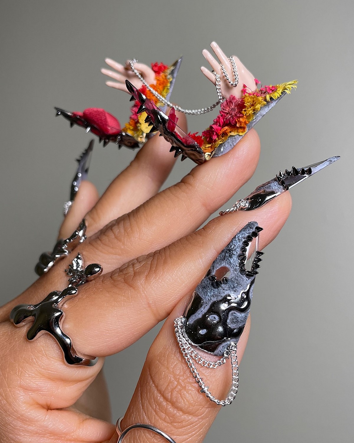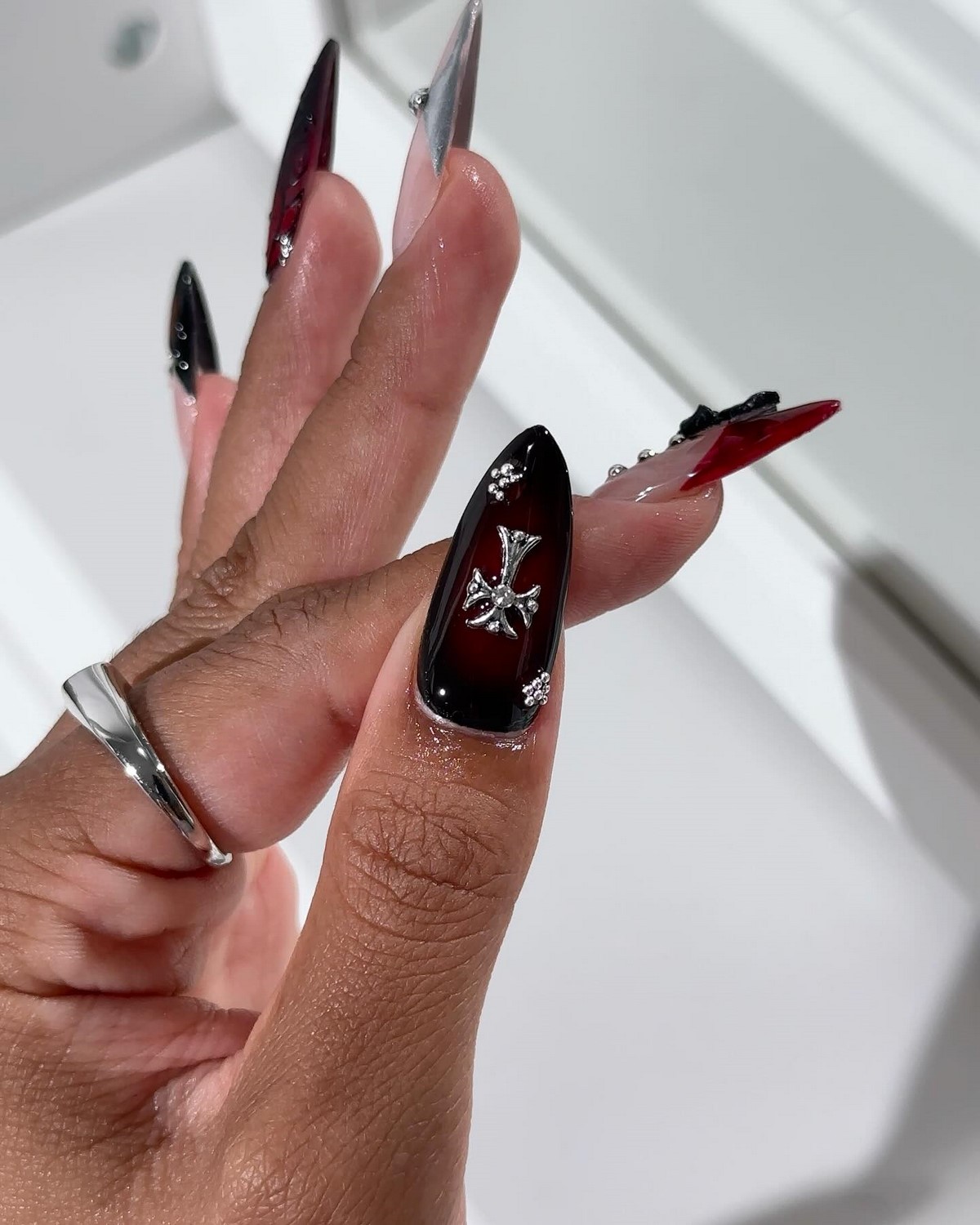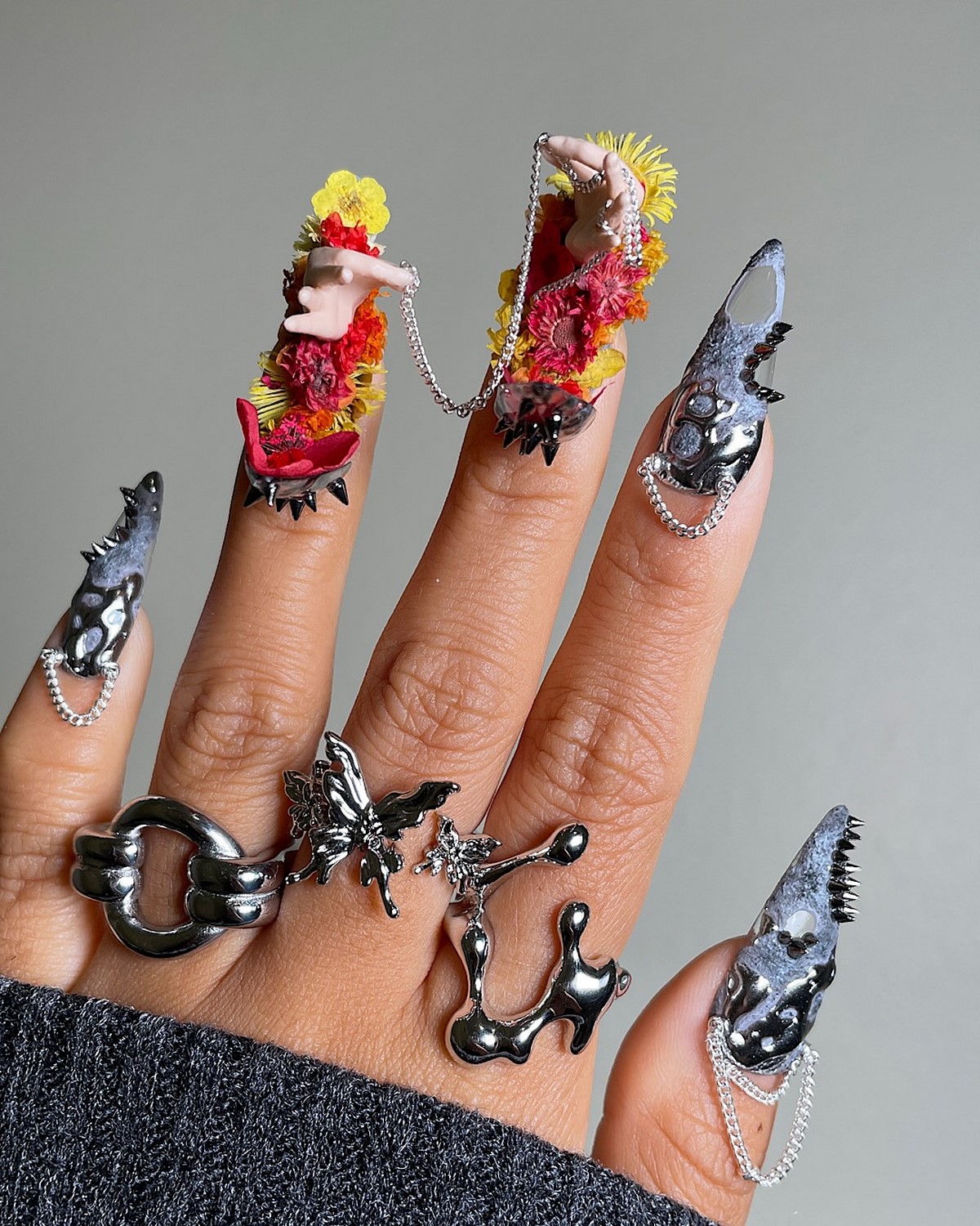 Объемные элементы в виде черепков, пауков или мини-глаз — для смелых и креативных. В 2025 году такие дизайны создаются в утонченной форме: стразы, текстуры, акриловые элементы не перегружают образ, а добавляют арт-декоративность.