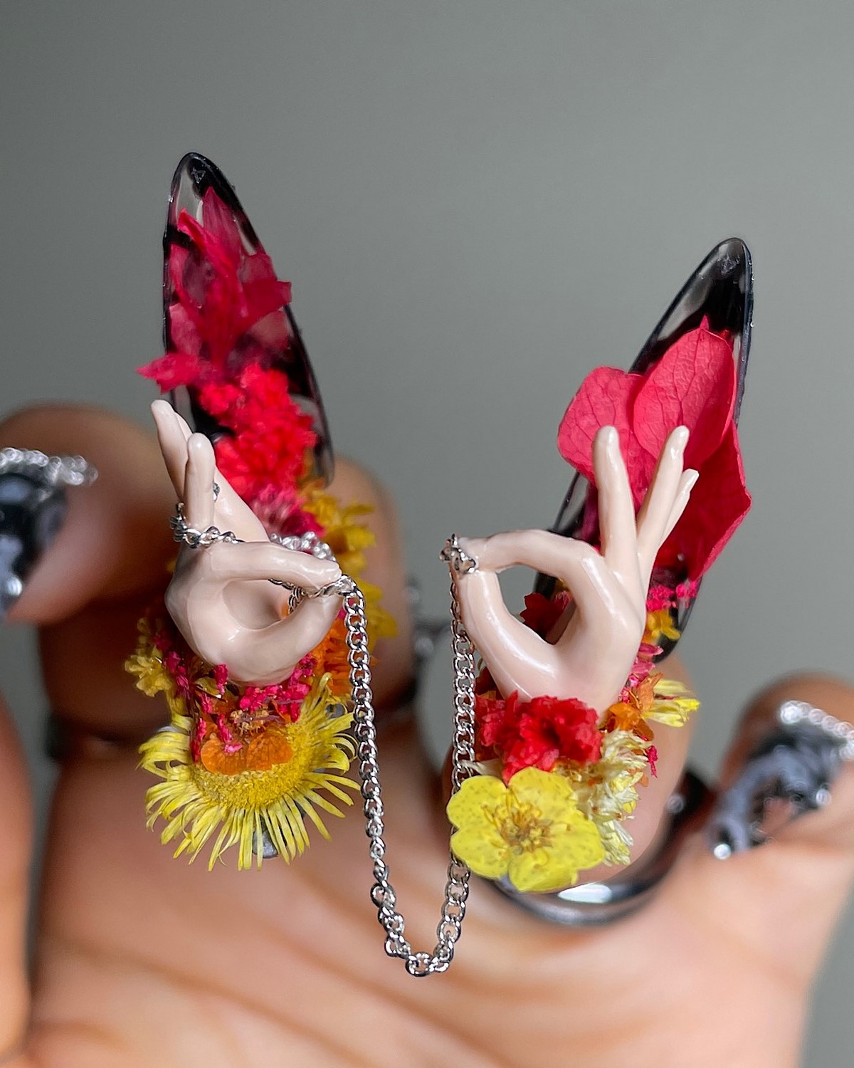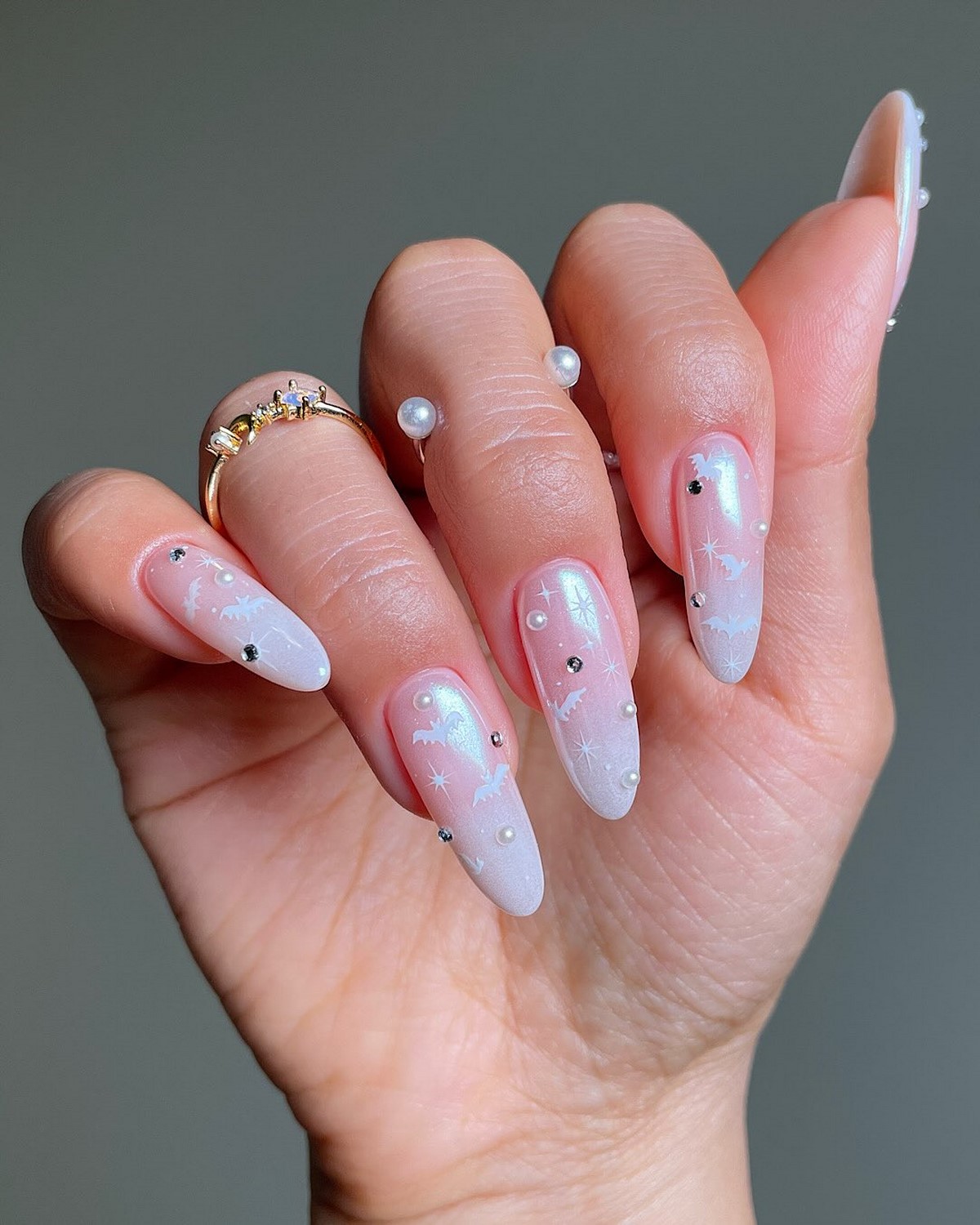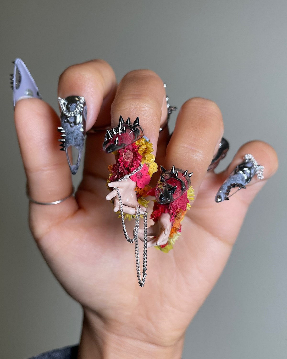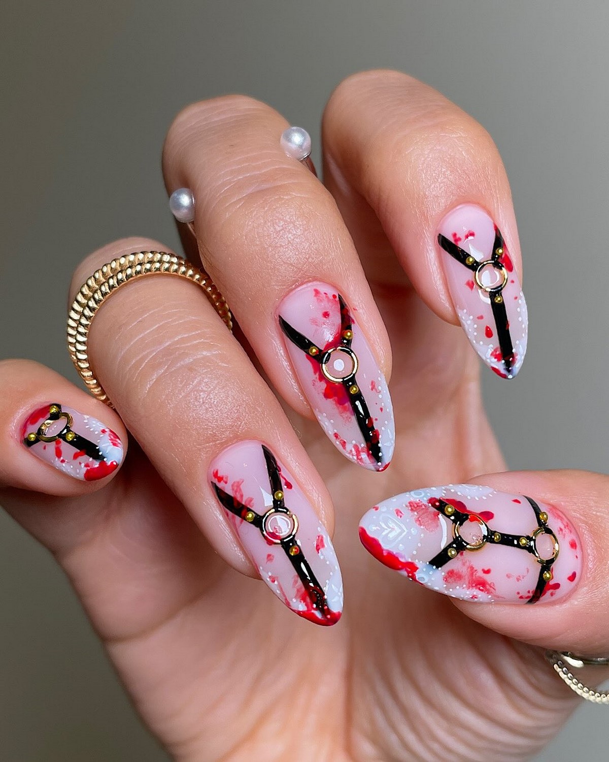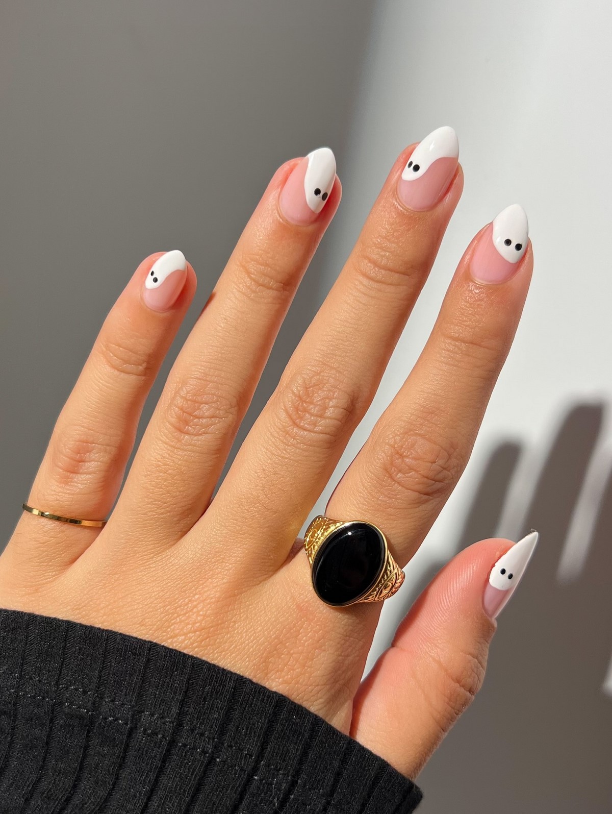 Объемные элементы в виде черепков, пауков или мини-глаз — для смелых и креативных. В 2025 году такие дизайны создаются в утонченной форме: стразы, текстуры, акриловые элементы не перегружают образ, а добавляют арт-декоративность.