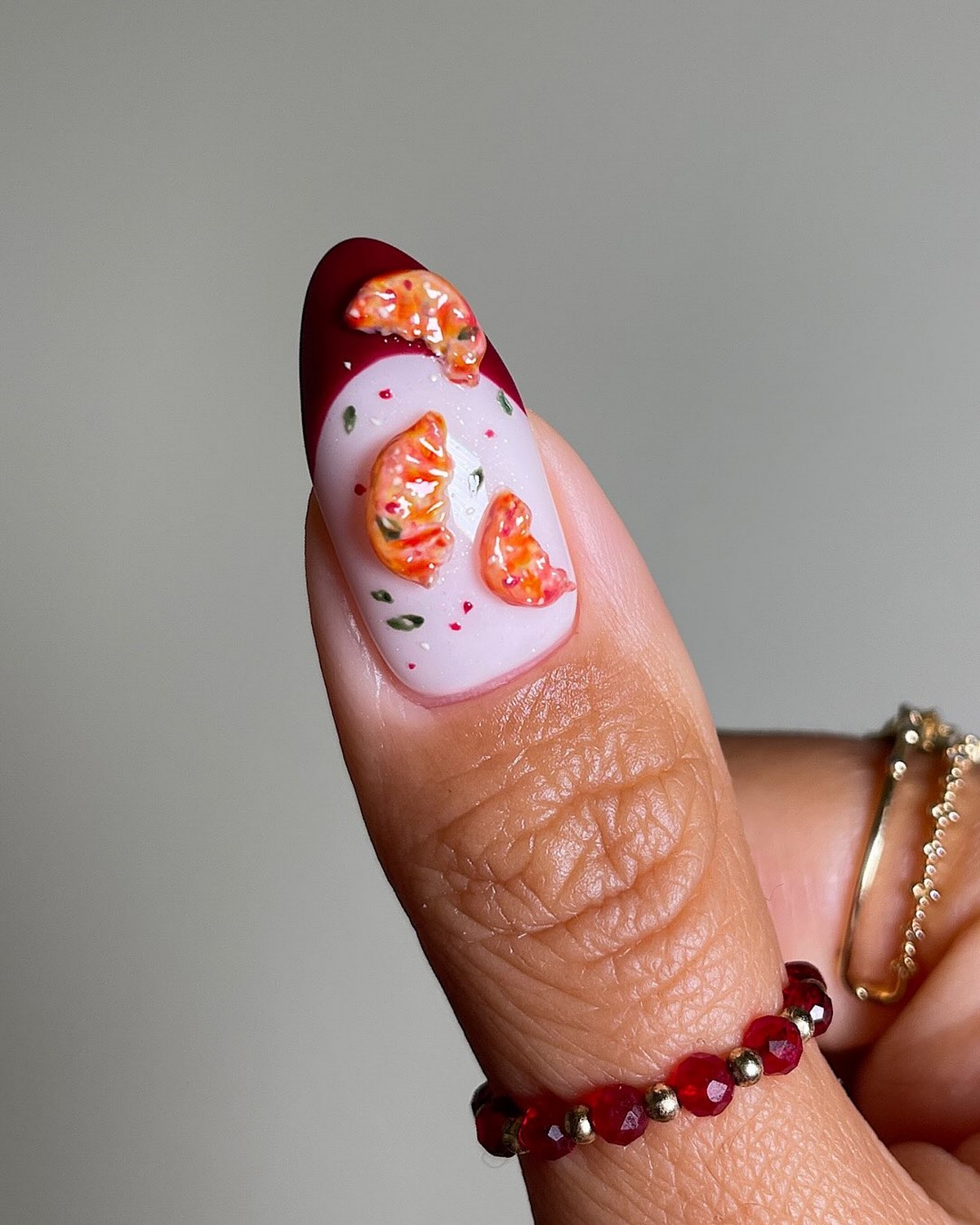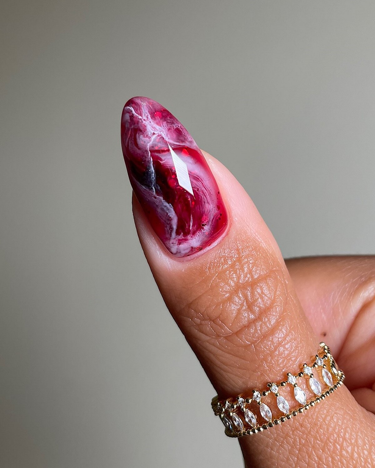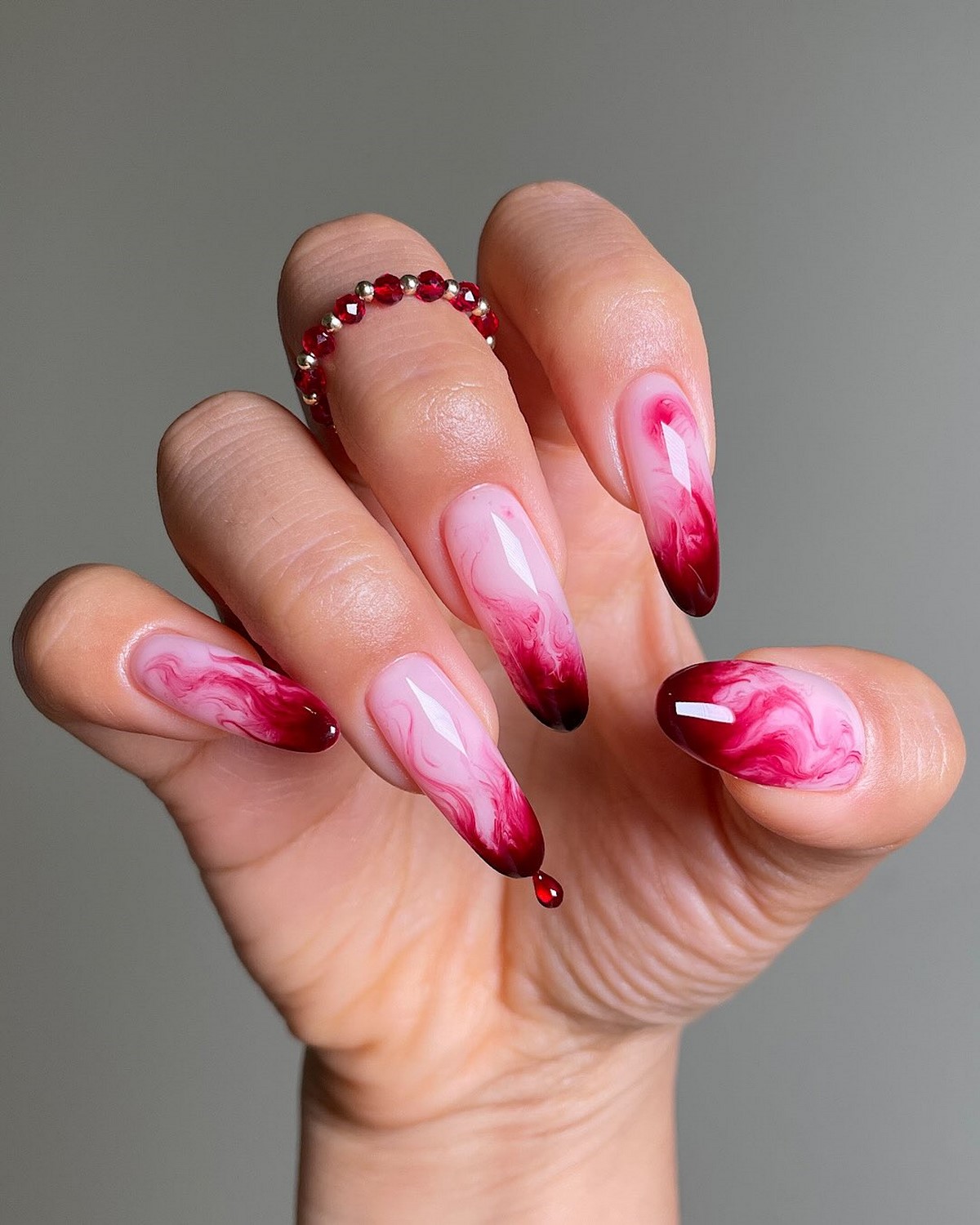 Сочный бордовый или красный лак с эффектом капель или стекания — идеальный выбор для вечеринки. Глянцевое покрытие придает дизайну глубину, делая ногти словно лакированными. Этот стиль сочетает дерзость и чувственность.