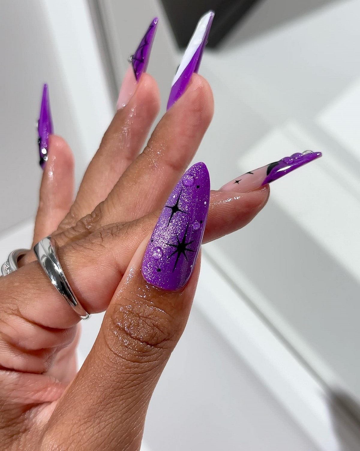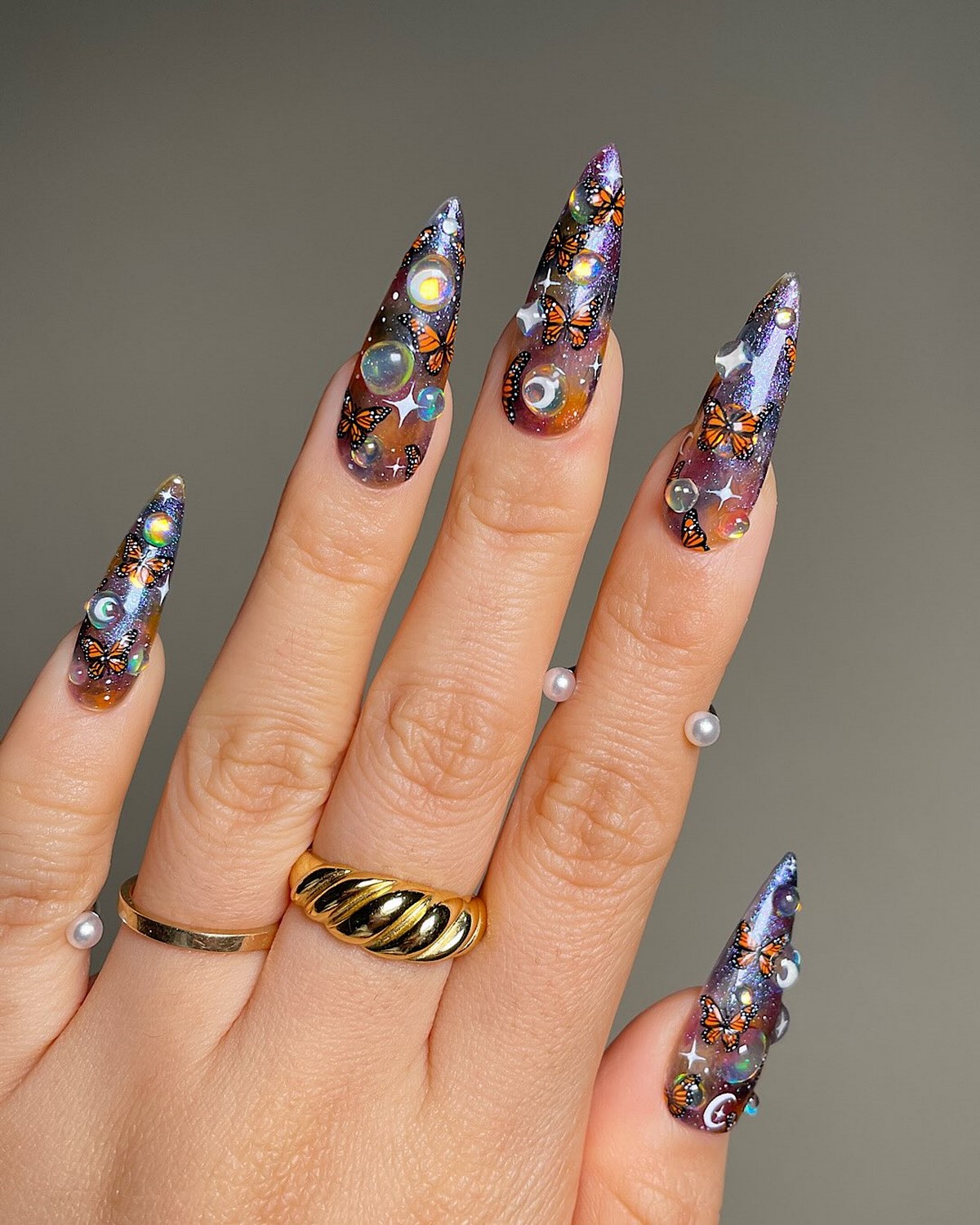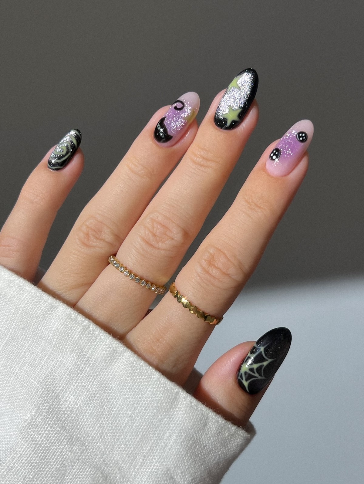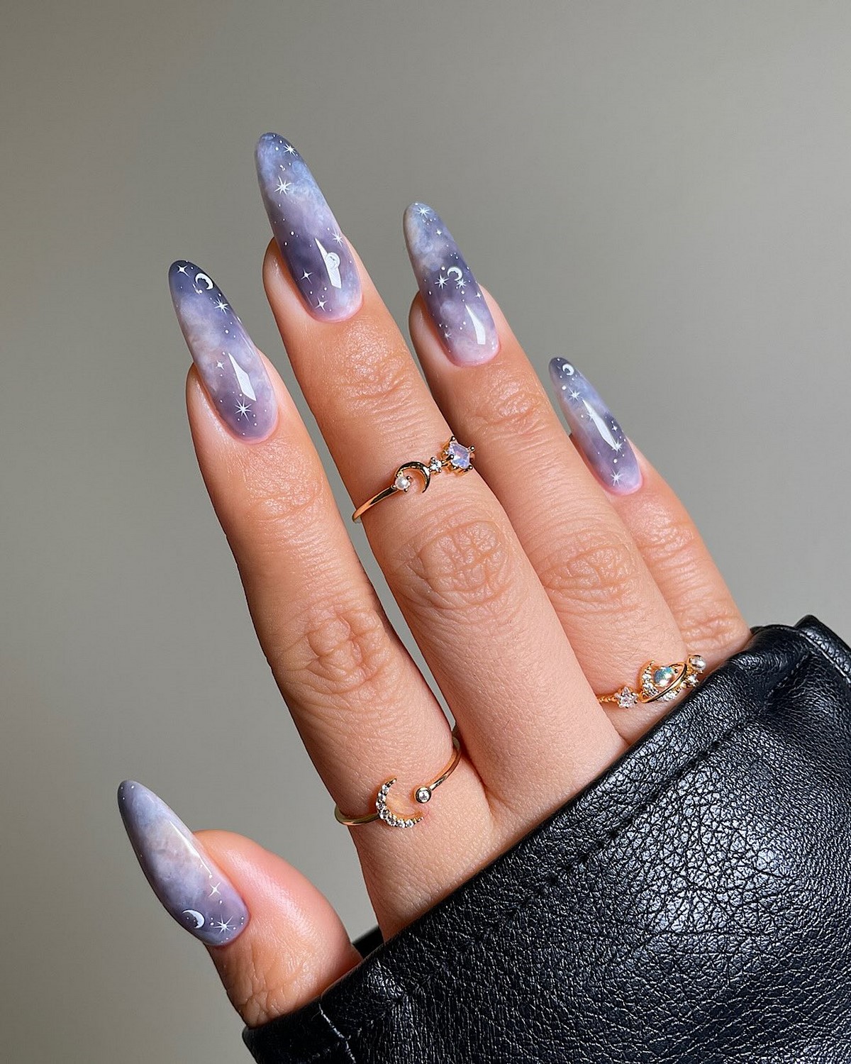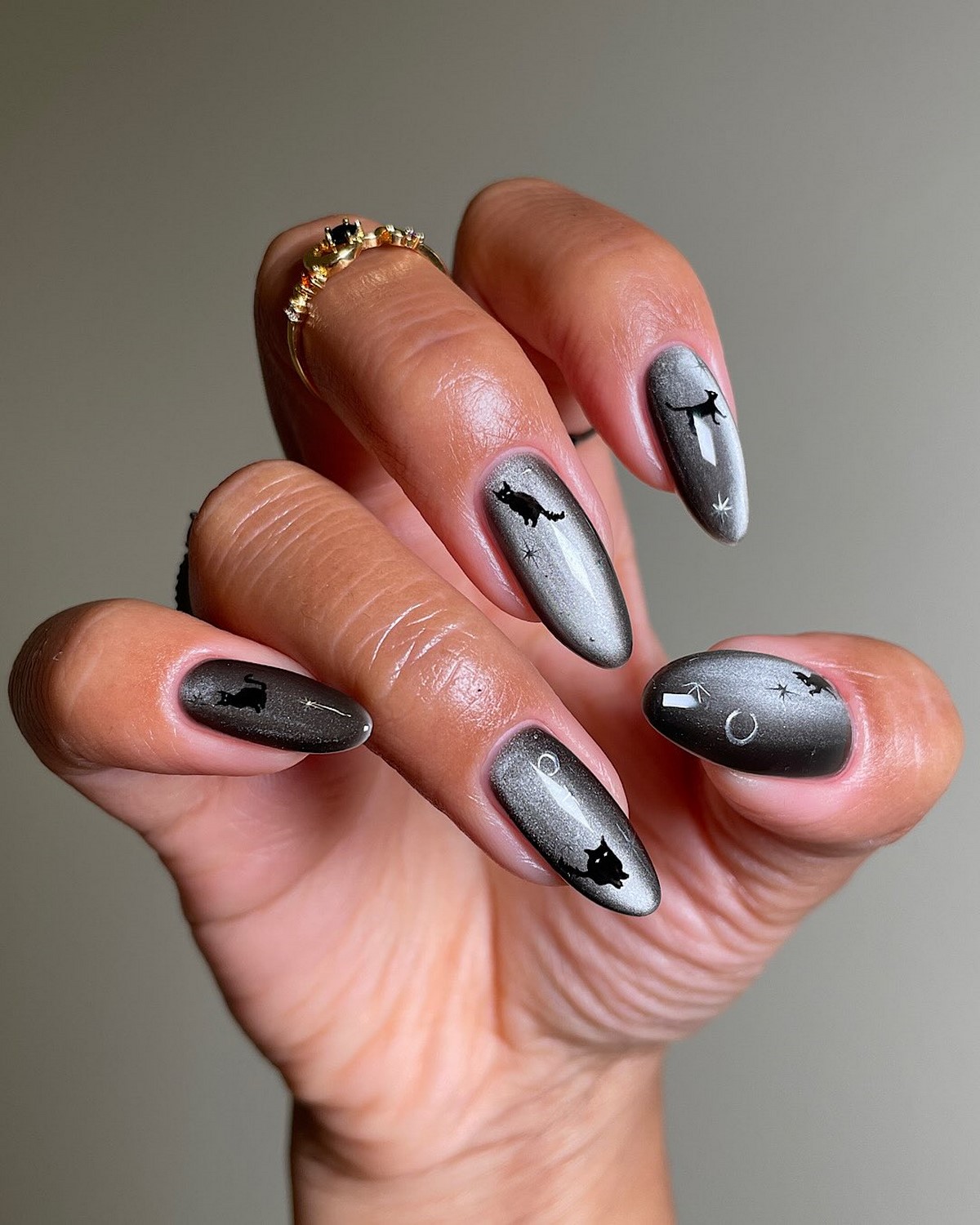 Лунные фазы, звезды, планеты и астрологические знаки в нейл-дизайне — хит сезона. На темном фоне серебристые узоры выглядят волшебно, создавая ощущение ночного неба. Такой дизайн подойдет не только для Хэллоуина, но и для любительниц астрологии.