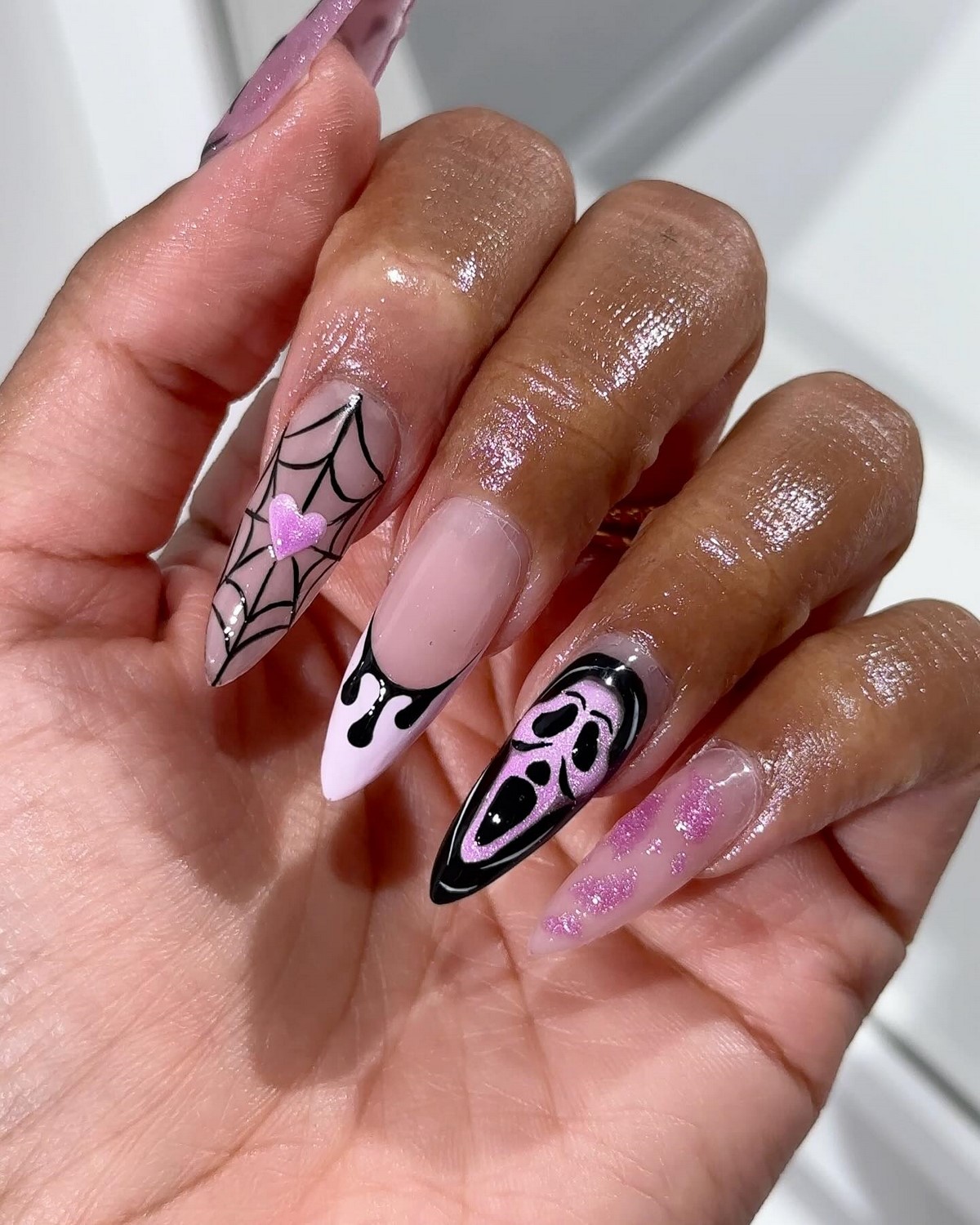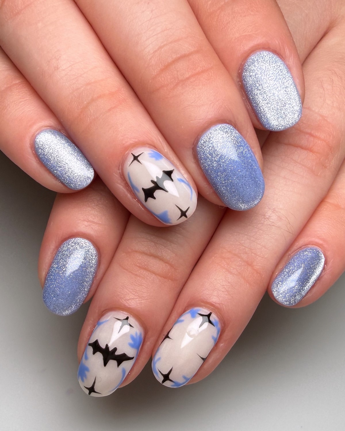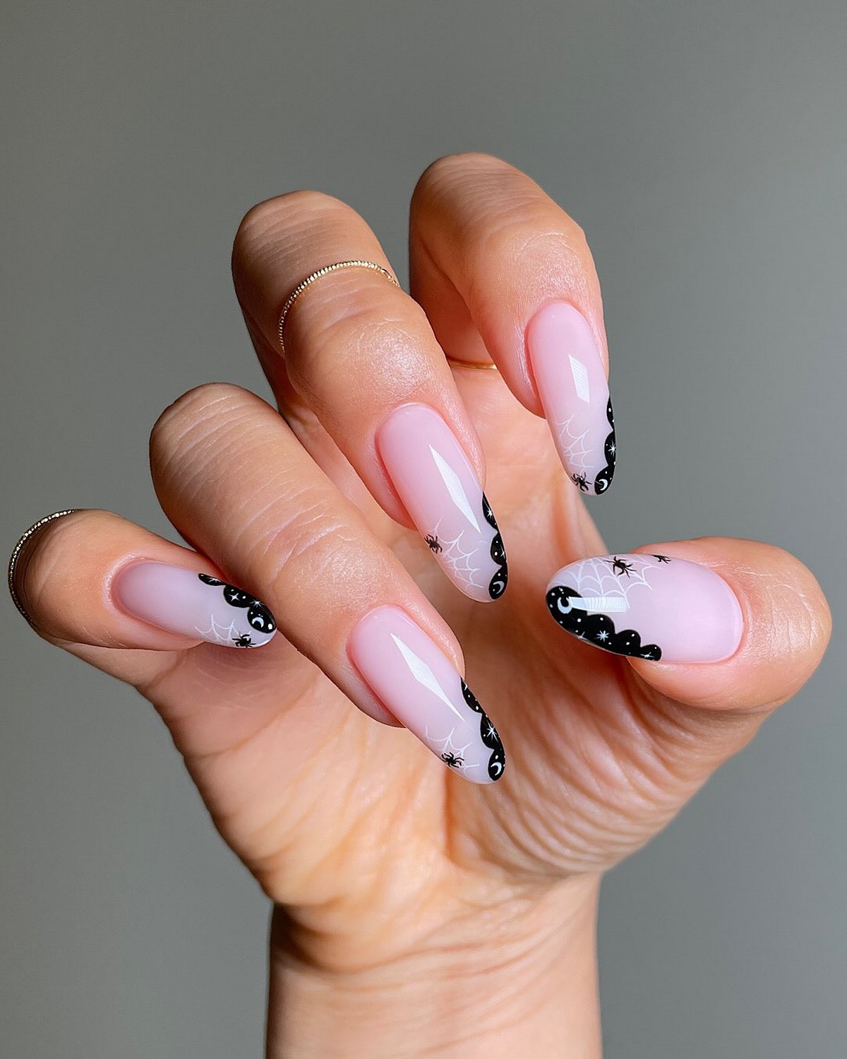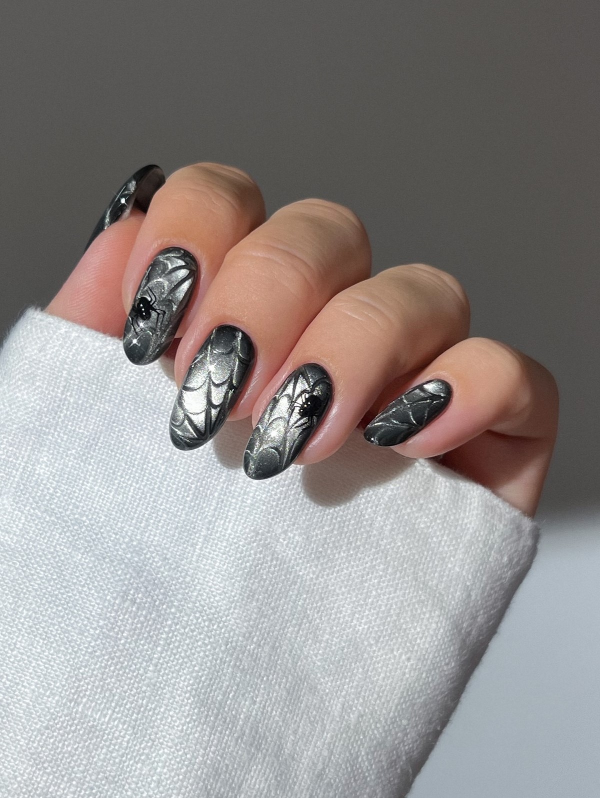 Один из самых узнаваемых символов Хэллоуина получает обновление: вместо ярко-белых линий — тонкая паутинка, нанесенная глянцем поверх матового черного покрытия. В некоторых вариантах добавляют капли серебряного лака или стразы.