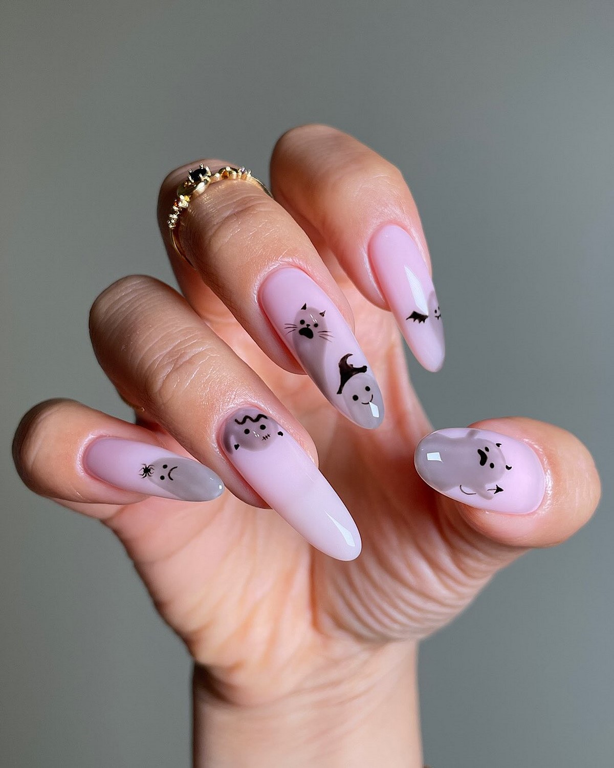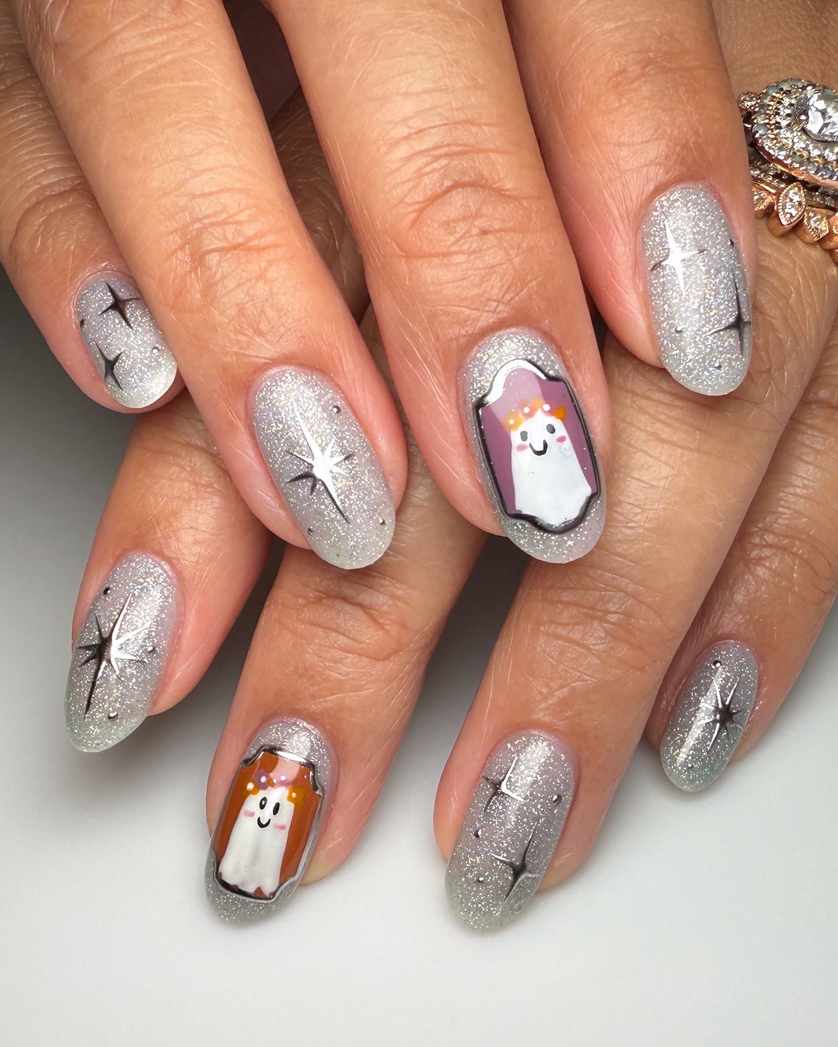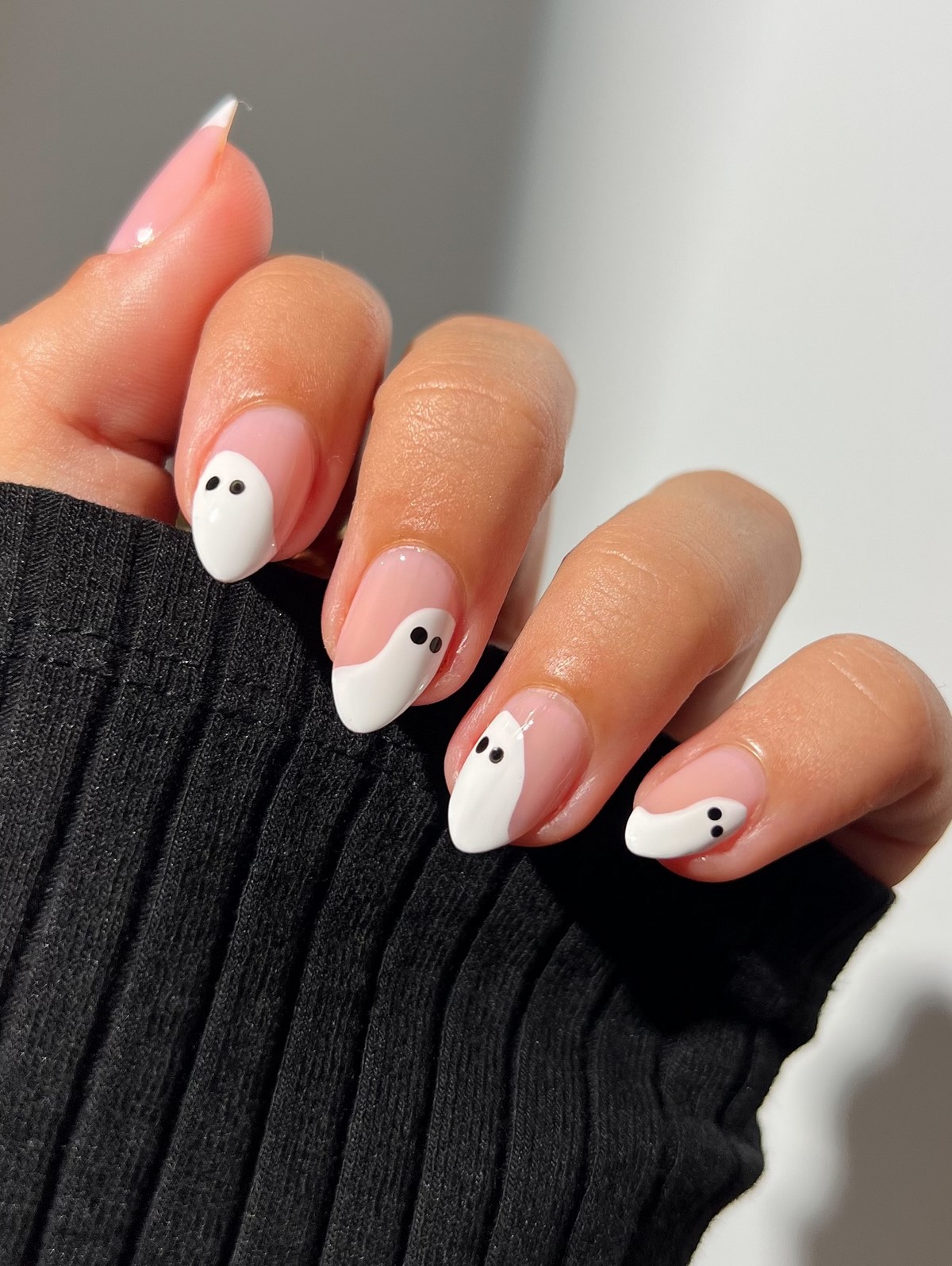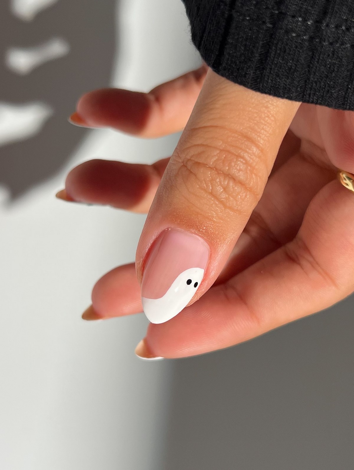 Трехмерный нейл-дизайн, где милые привидения с забавными выражениями лиц создаются с помощью объемного геля или акрила, поднимаясь над поверхностью ногтя. Фон выполняется в пастельных оттенках — нежно-голубом или светло-фиолетовом, что смягчает хэллоуинскую тему и делает дизайн более игривым. Такой маникюр особенно нравится молодежи и тем, кто ценит творчество в нейл-арте.