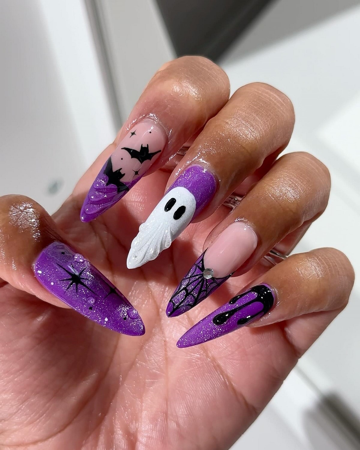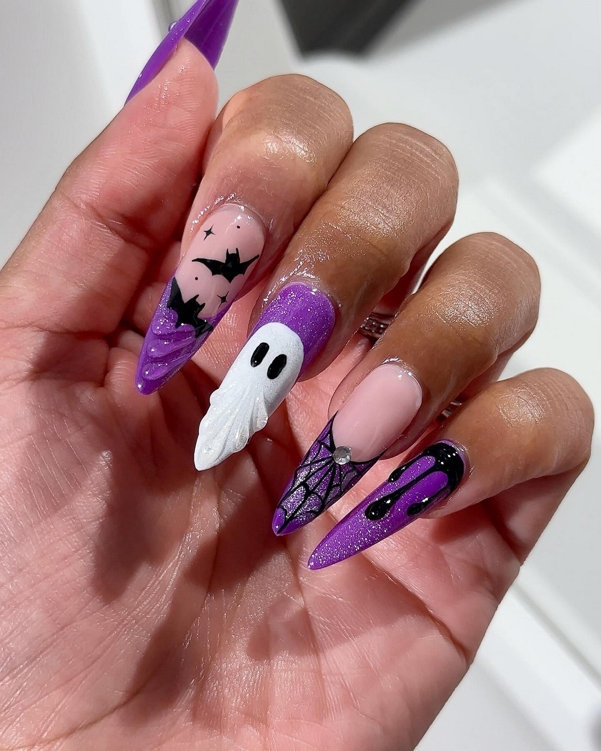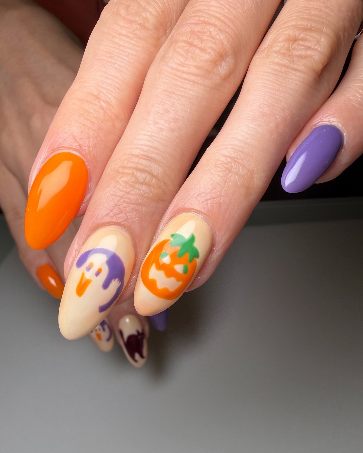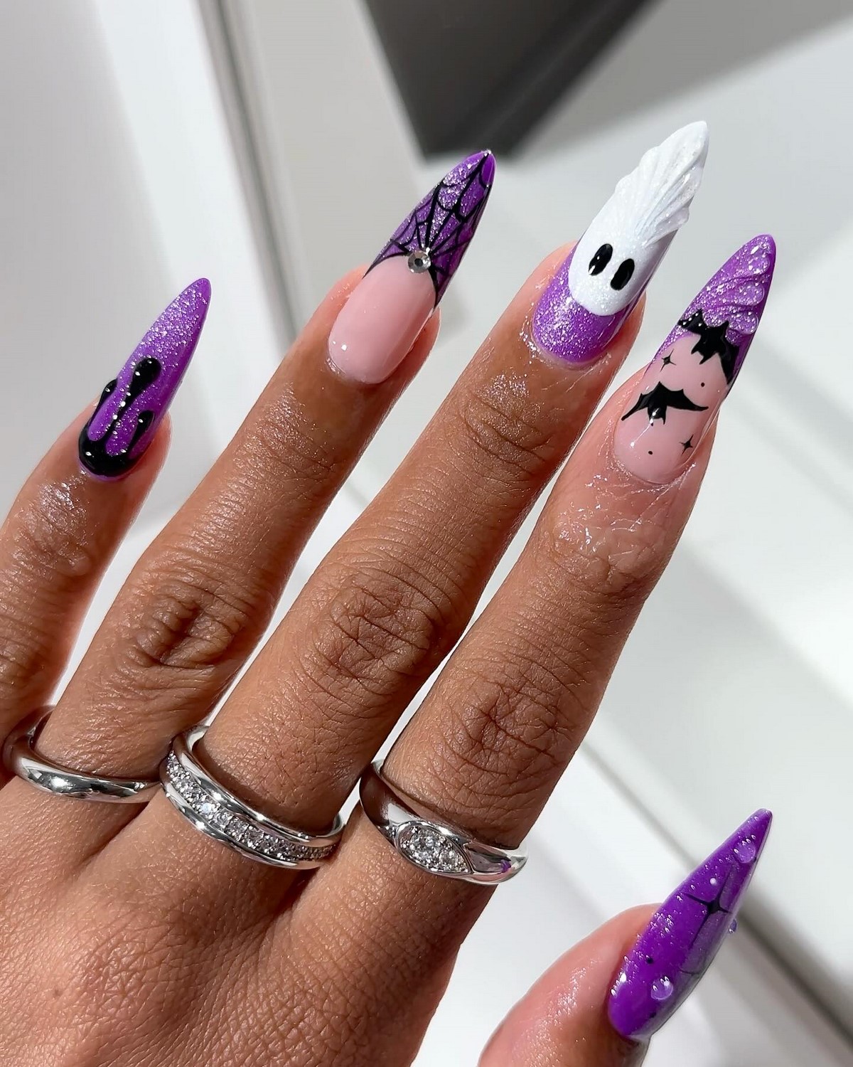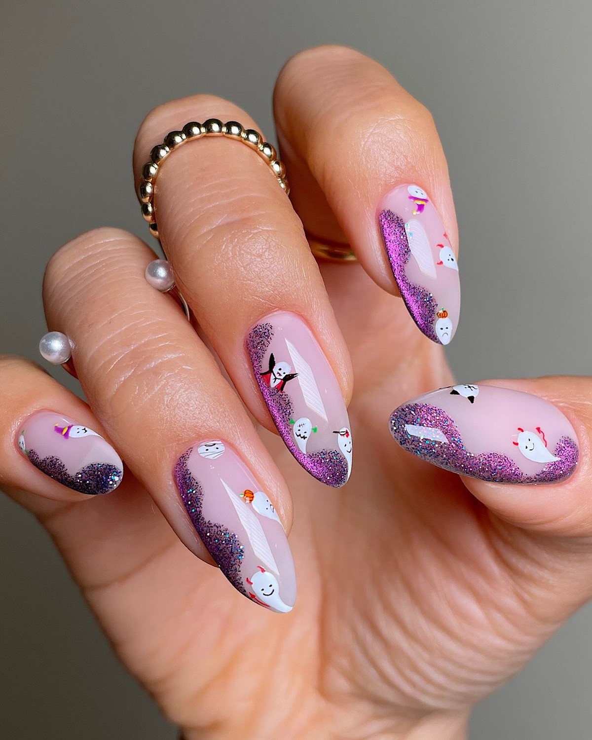Трехмерный нейл-дизайн, где милые привидения с забавными выражениями лиц создаются с помощью объемного геля или акрила, поднимаясь над поверхностью ногтя. Фон выполняется в пастельных оттенках — нежно-голубом или светло-фиолетовом, что смягчает хэллоуинскую тему и делает дизайн более игривым. Такой маникюр особенно нравится молодежи и тем, кто ценит творчество в нейл-арте.