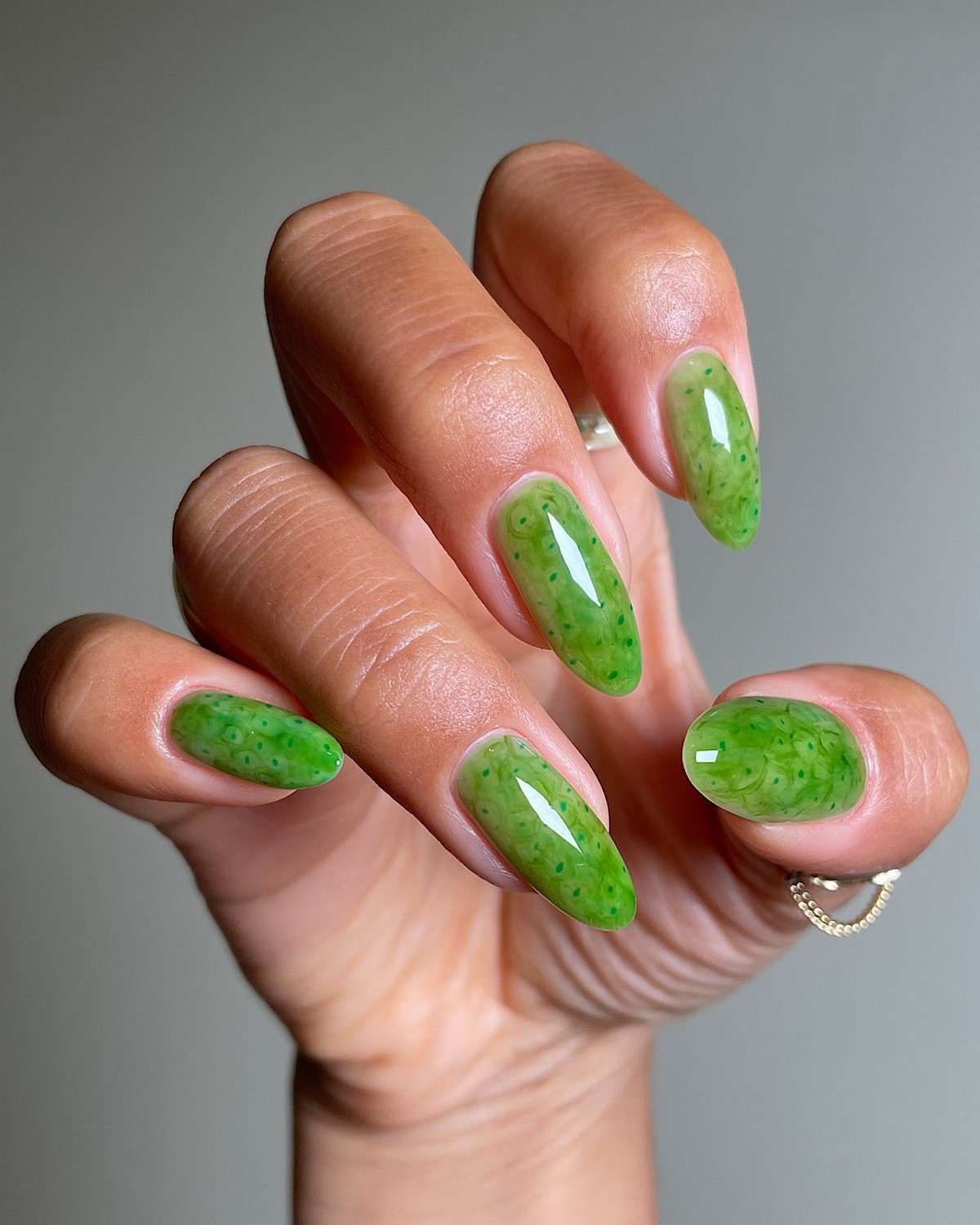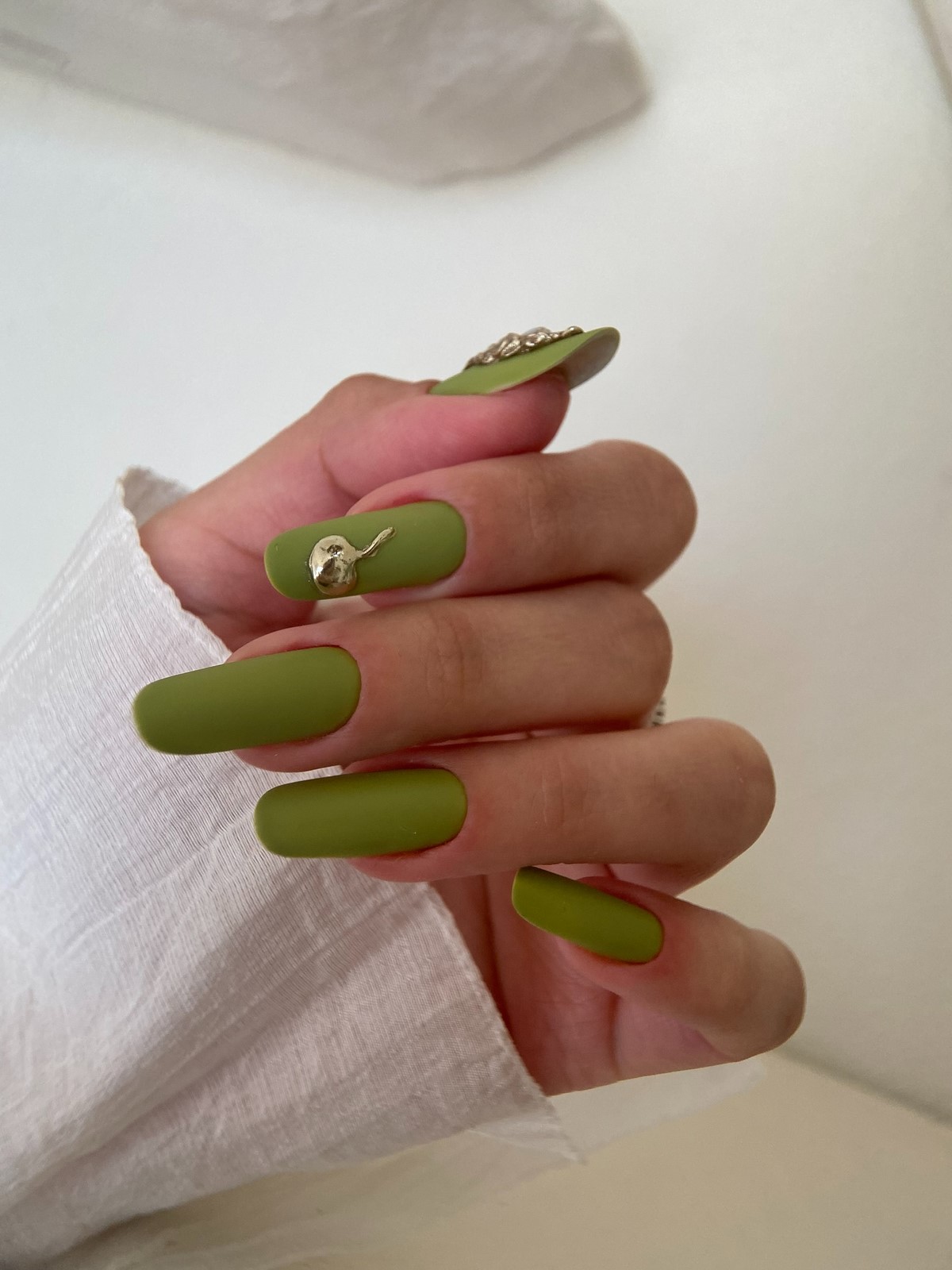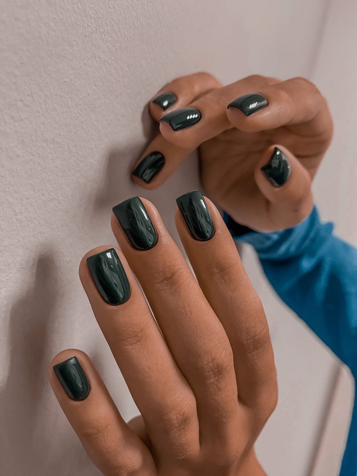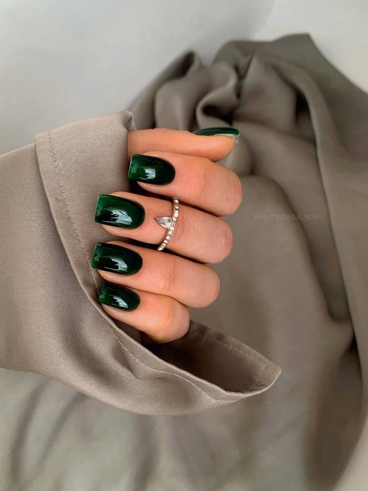 Изумрудный цвет становится абсолютным хитом холодного сезона, воплощая в себе роскошь и элегантность драгоценных камней. Этот глубокий зеленый оттенок идеально дополняет осенне-зимний гардероб, создавая изысканный контраст с нейтральными тонами одежды. Изумрудный маникюр особенно эффектно смотрится на длинных ногтях овальной или миндалевидной формы. Для создания более сложного дизайна можно добавить золотые или серебряные акценты в виде тонких линий или геометрических узоров.