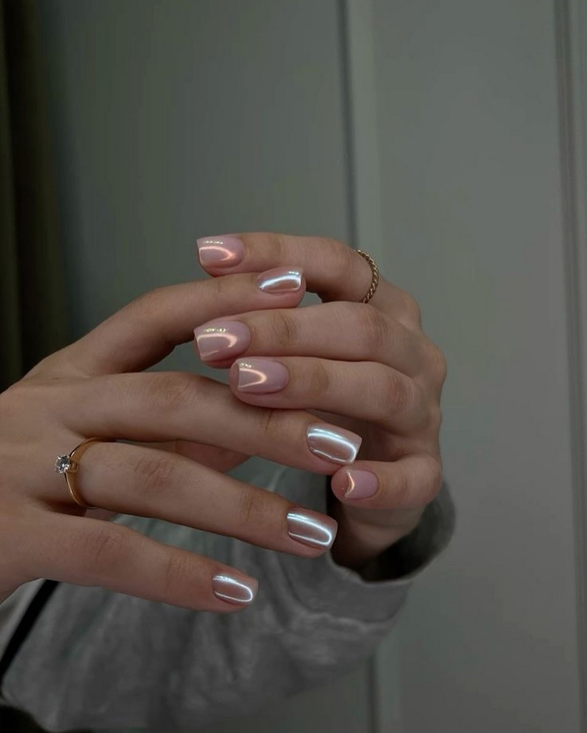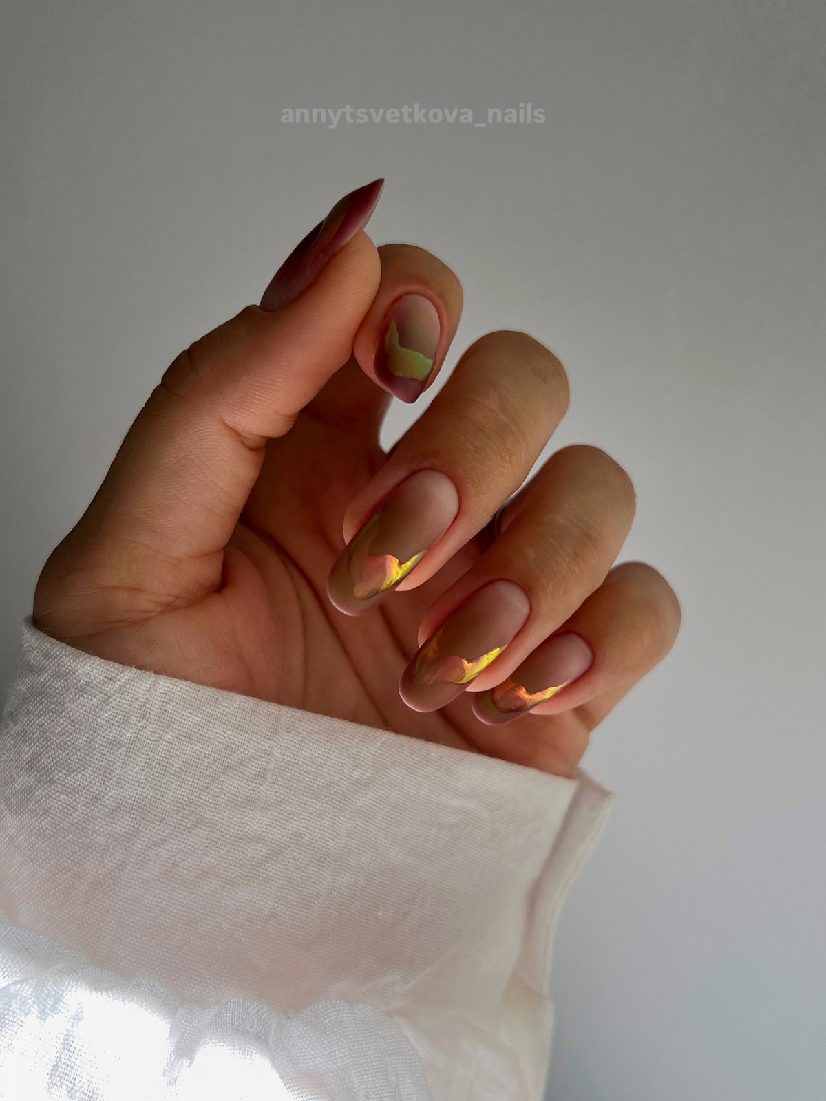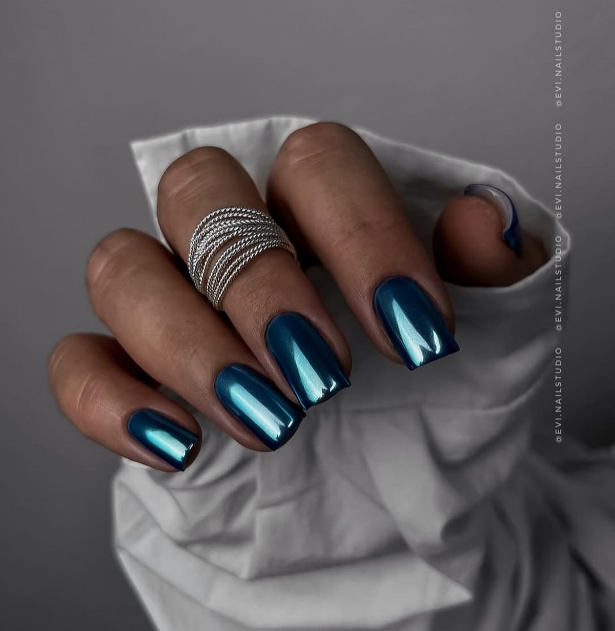 Металлические оттенки — серебро, золото, медь, бронза — добавляют маникюру футуристичности и роскоши. Эти цвета прекрасно отражают свет, создавая эффектные переливы и привлекая внимание к рукам. Металлический маникюр может быть выполнен как в виде сплошного покрытия, так и в качестве акцентов на отдельных ногтях. Особенно трендовыми считаются техники, сочетающие несколько металлических оттенков или комбинирующие металлик с матовыми цветами.