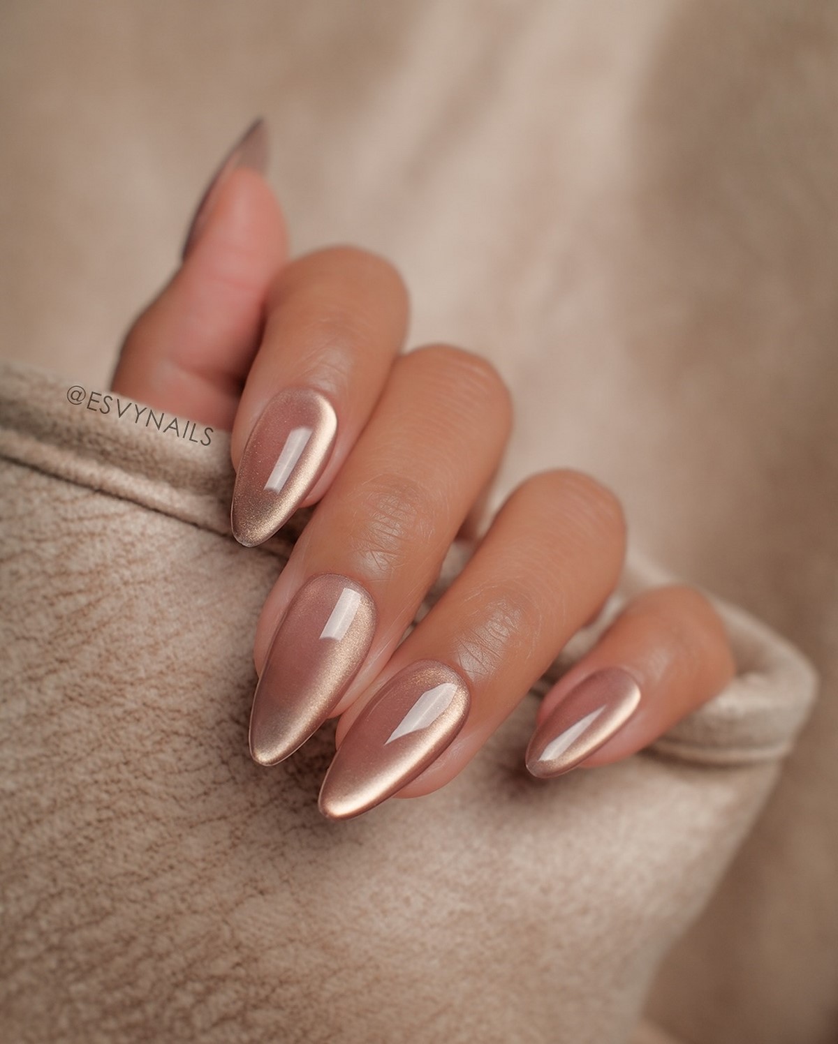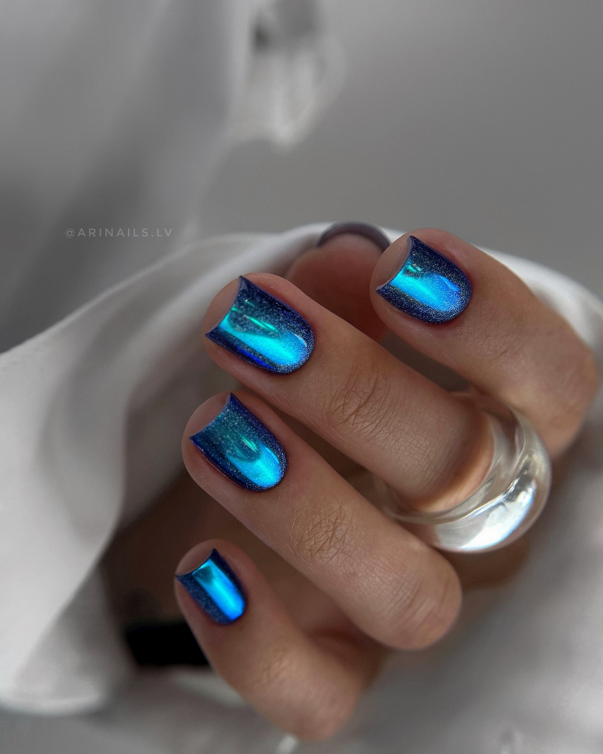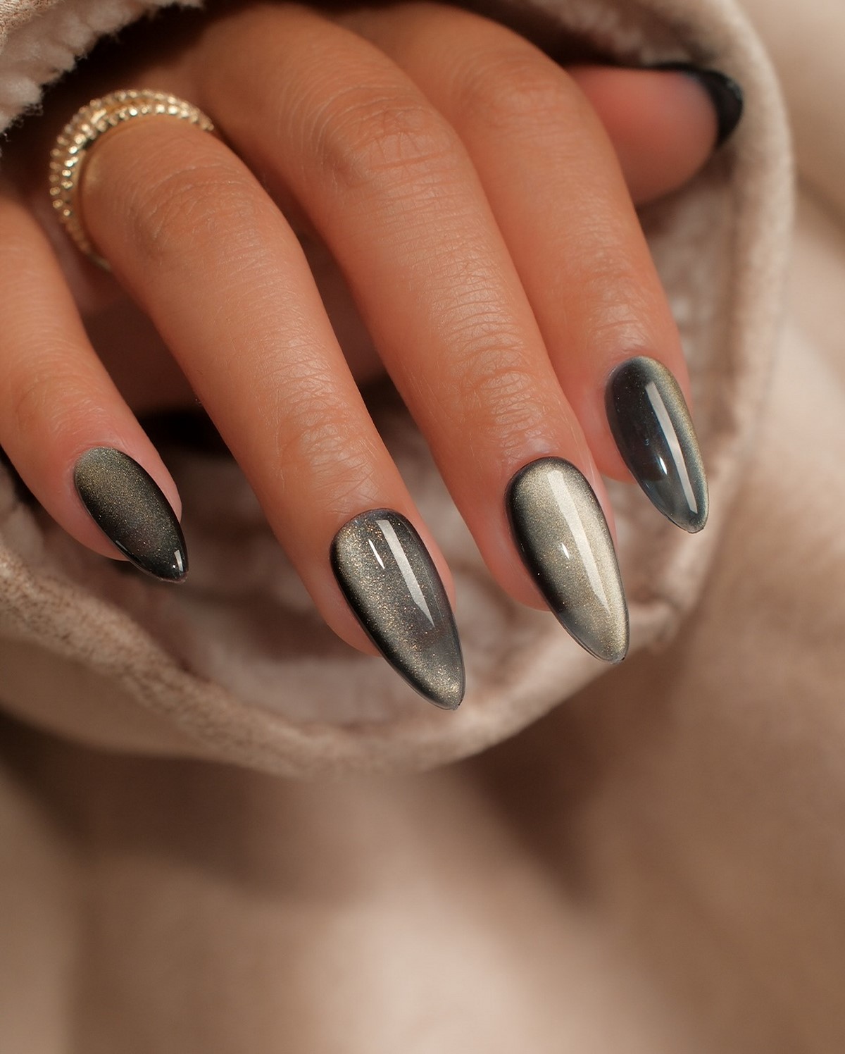 Металлические оттенки — серебро, золото, медь, бронза — добавляют маникюру футуристичности и роскоши. Эти цвета прекрасно отражают свет, создавая эффектные переливы и привлекая внимание к рукам. Металлический маникюр может быть выполнен как в виде сплошного покрытия, так и в качестве акцентов на отдельных ногтях. Особенно трендовыми считаются техники, сочетающие несколько металлических оттенков или комбинирующие металлик с матовыми цветами.