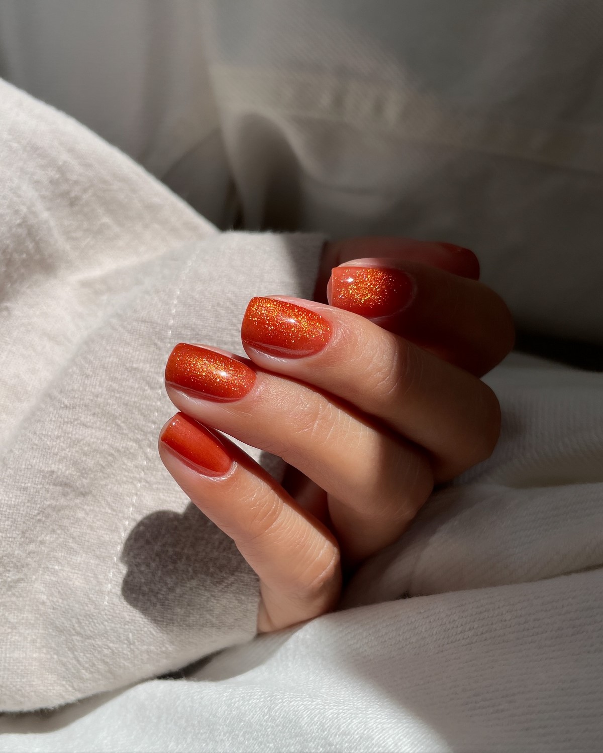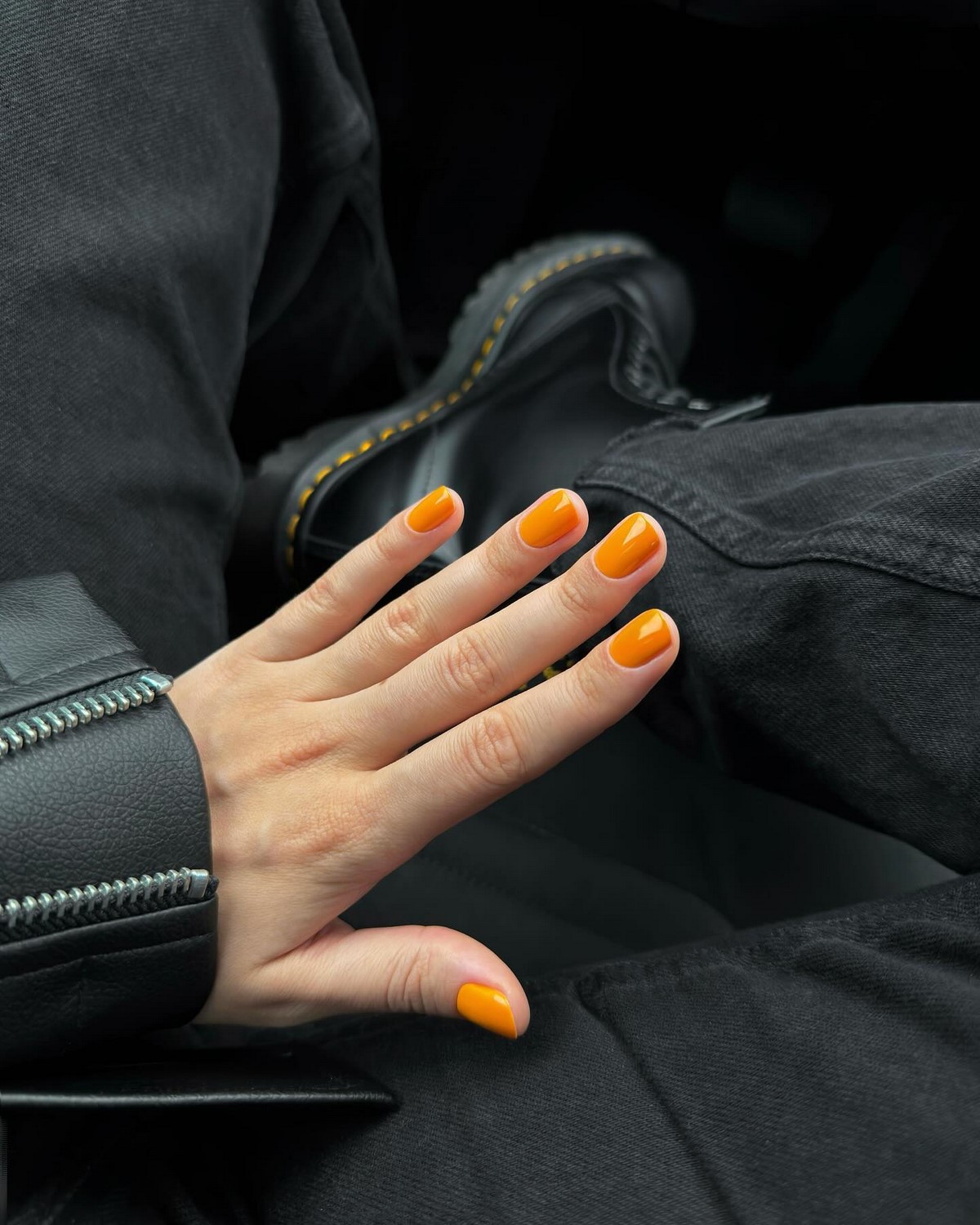 Теплые оранжевые оттенки — от нежного персикового до насыщенного тыквенного — привносят в осенне-зимний маникюр нотки уюта и тепла. Эти цвета особенно актуальны в начале осени, когда хочется сохранить летнее настроение. Оранжевый маникюр прекрасно сочетается с коричневыми и нюдовыми оттенками одежды, создавая гармоничные образы. Для более сдержанного варианта можно выбрать приглушенные терракотовые или коралловые оттенки.