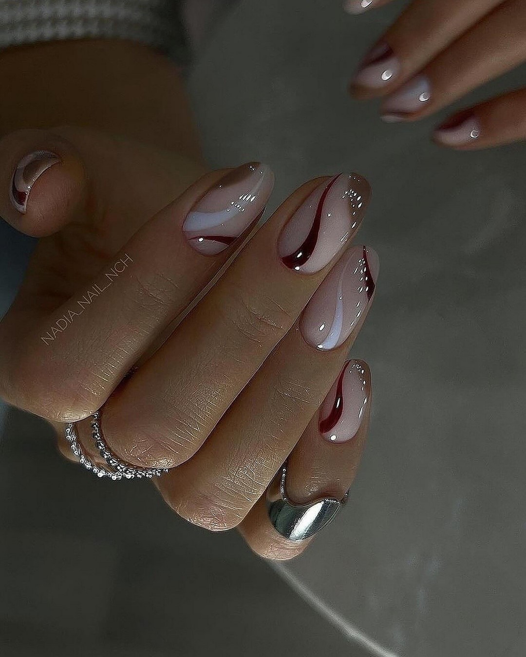 Зеркальный маникюр, металлические полоски и детали – ещё один хит декабря. Такой стиль сочетается как с деловыми образами, так и с праздничными нарядами.