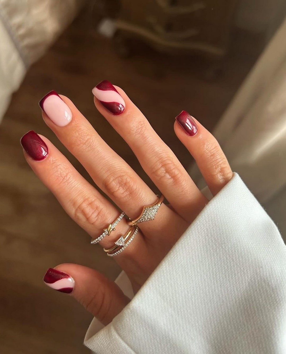 Бордовый, темно-зеленый, насыщенный синий и черный оттенки идеально подойдут для холодного времени года. Их можно дополнить блестками, глиттером или металлическими акцентами для создания праздничного эффекта. Матовые покрытия добавляют таким цветам благородства и изысканности.