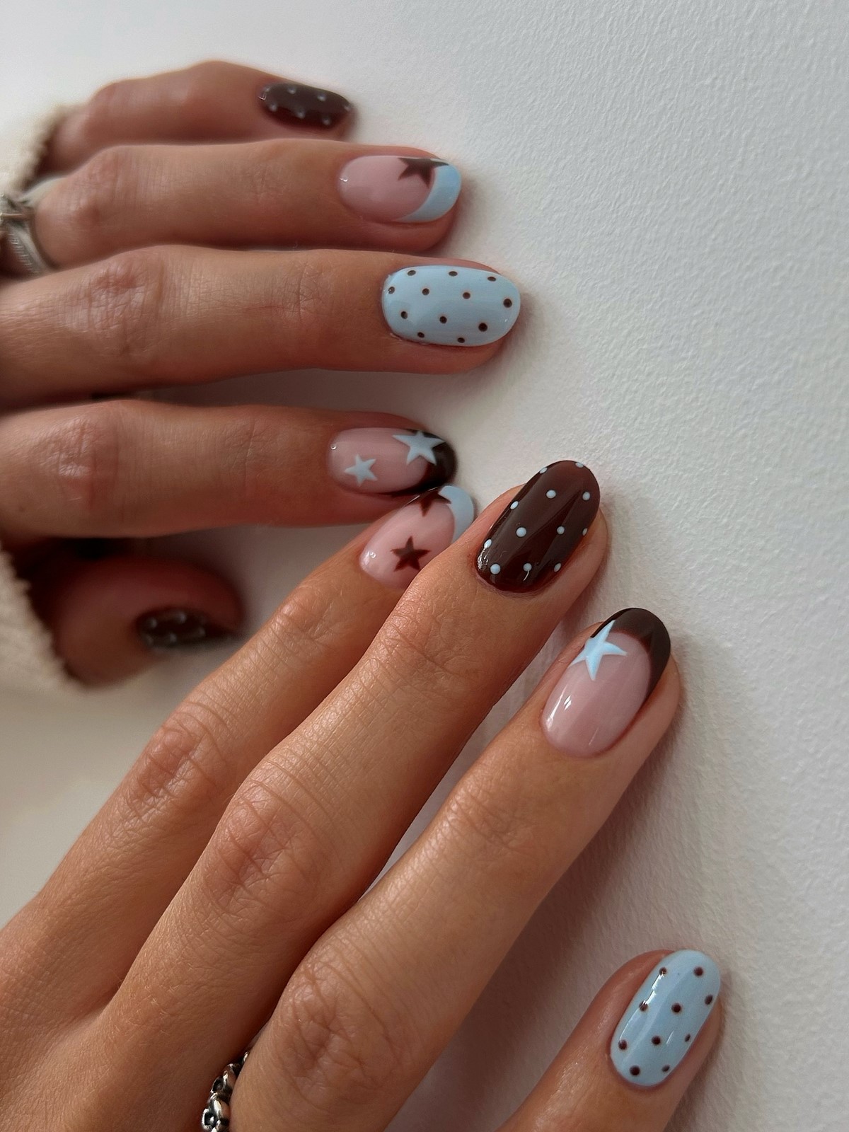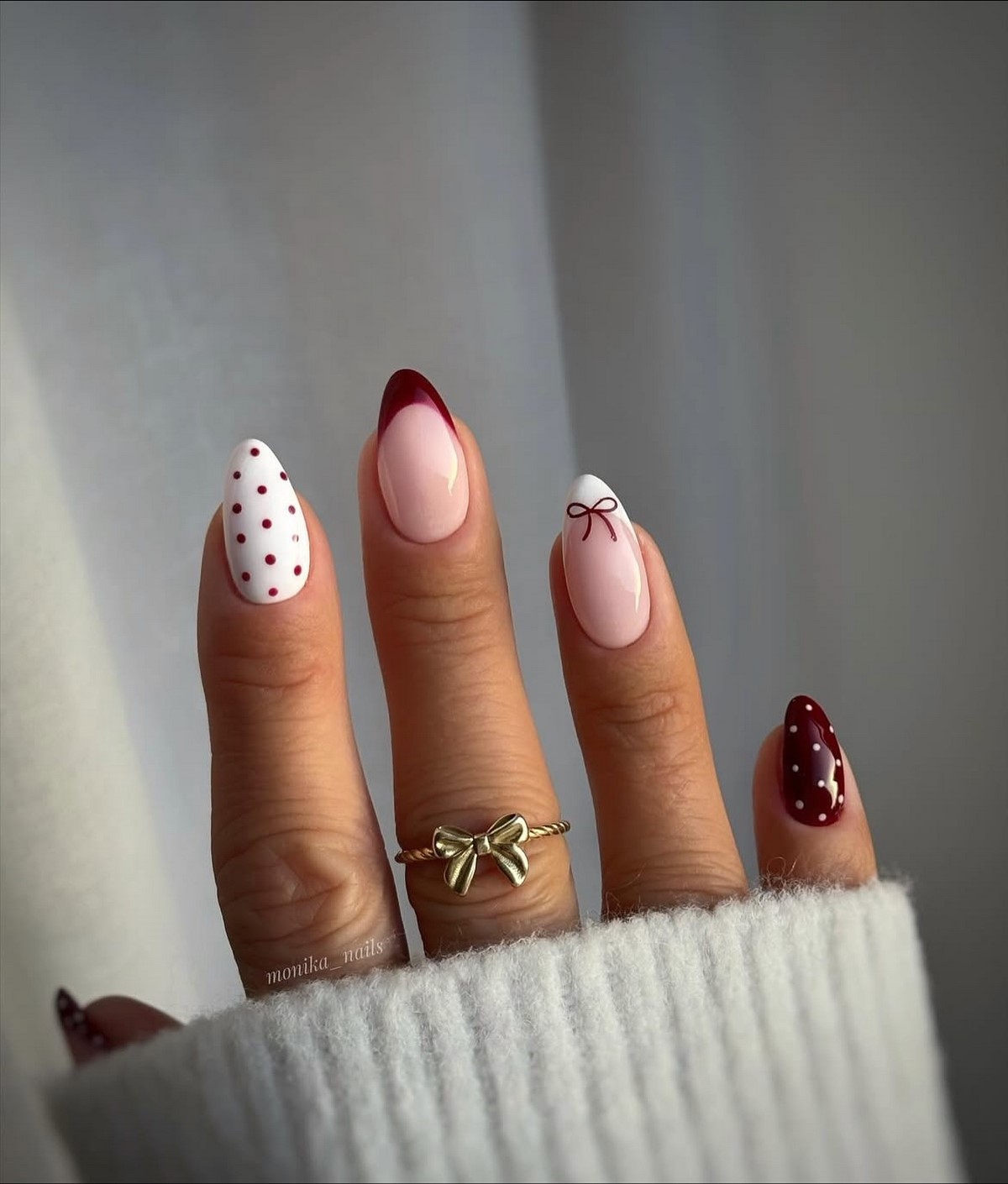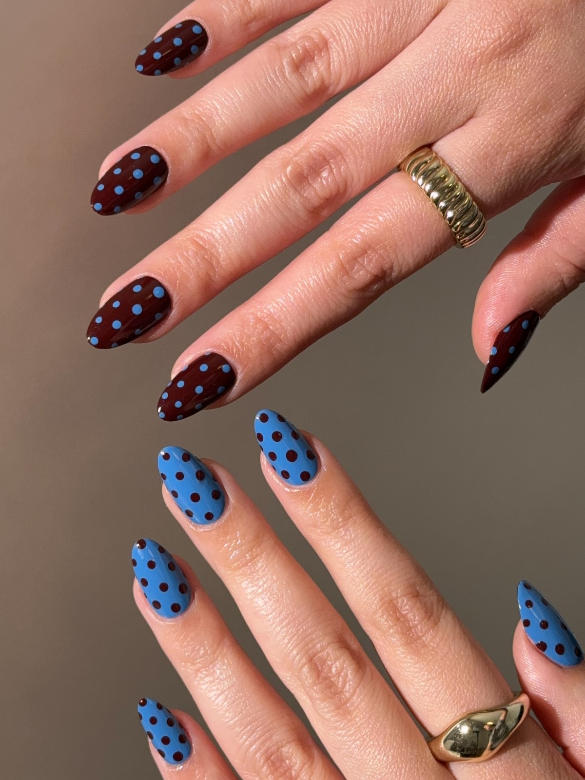Mix&Match — это микс разных текстур, цветов и размеров точек. Например, на одном ногте — крупные контрастные круги, на другом — крошечные точки, имитирующие снежинки. Такая игра делает маникюр необычным и динамичным. В зимнем исполнении стоит выбирать спокойную палитру: белый, серый, винный, шоколадный, синие тона.