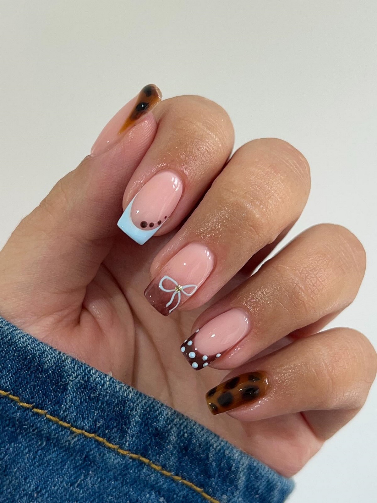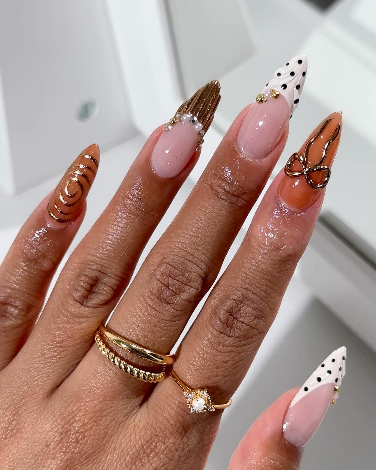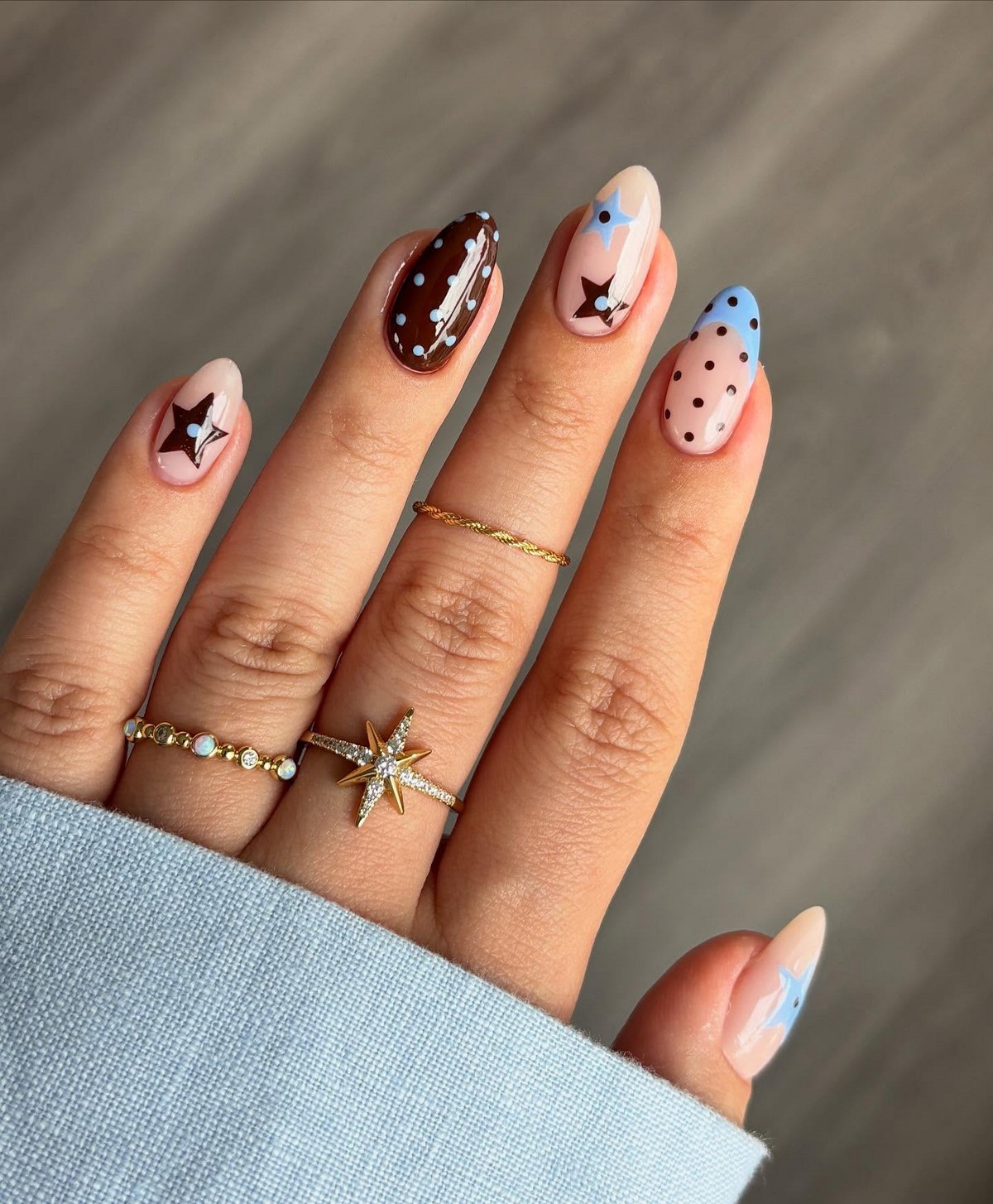 Mix&Match — это микс разных текстур, цветов и размеров точек. Например, на одном ногте — крупные контрастные круги, на другом — крошечные точки, имитирующие снежинки. Такая игра делает маникюр необычным и динамичным. В зимнем исполнении стоит выбирать спокойную палитру: белый, серый, винный, шоколадный, синие тона.