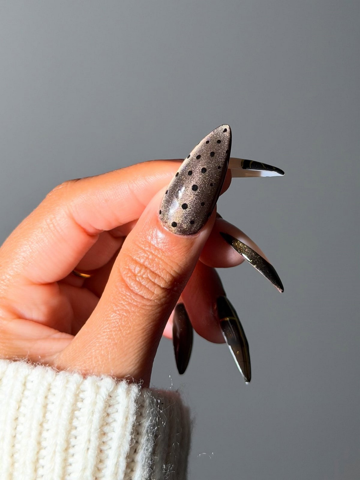 Металлический блеск стал одним из главных трендов 2025 года, и Polka Dots с металлическими акцентами выглядит футуристично. На матовой базе — серебряные, золотые или хромированные точки, создающие эффект 3D. Этот дизайн гармонирует с украшениями и зимними аксессуарами, добавляя блеска в повседневный образ.