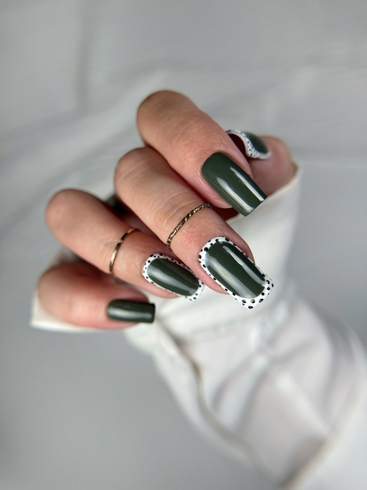 Для тех, кто любит заметные решения, подойдёт маникюр с крупным горохом. Одна или две крупные точки на ногтевой пластине — это уже арт-дизайн. Зимой особенно эффектно смотрятся комбинации насыщенных оттенков: бордо с золотом, синий с белым, темно-зеленый с серебром. Такой маникюр становится самостоятельным акцентом образа.