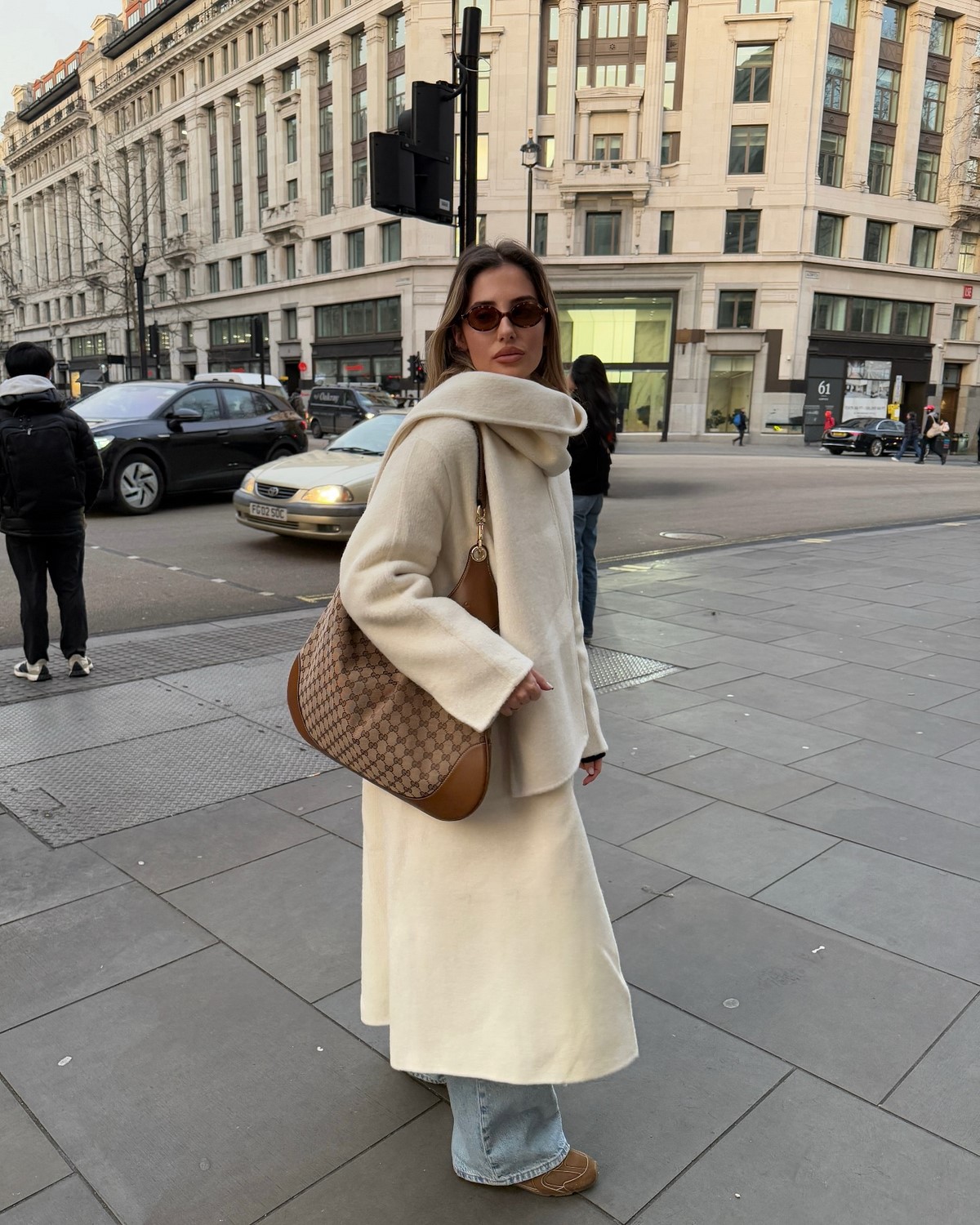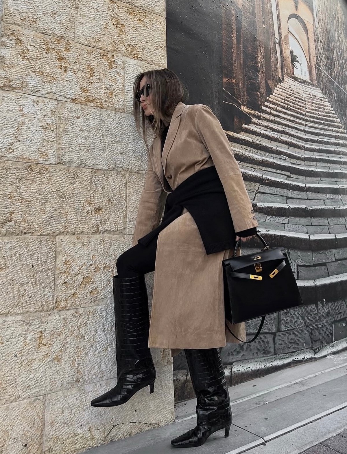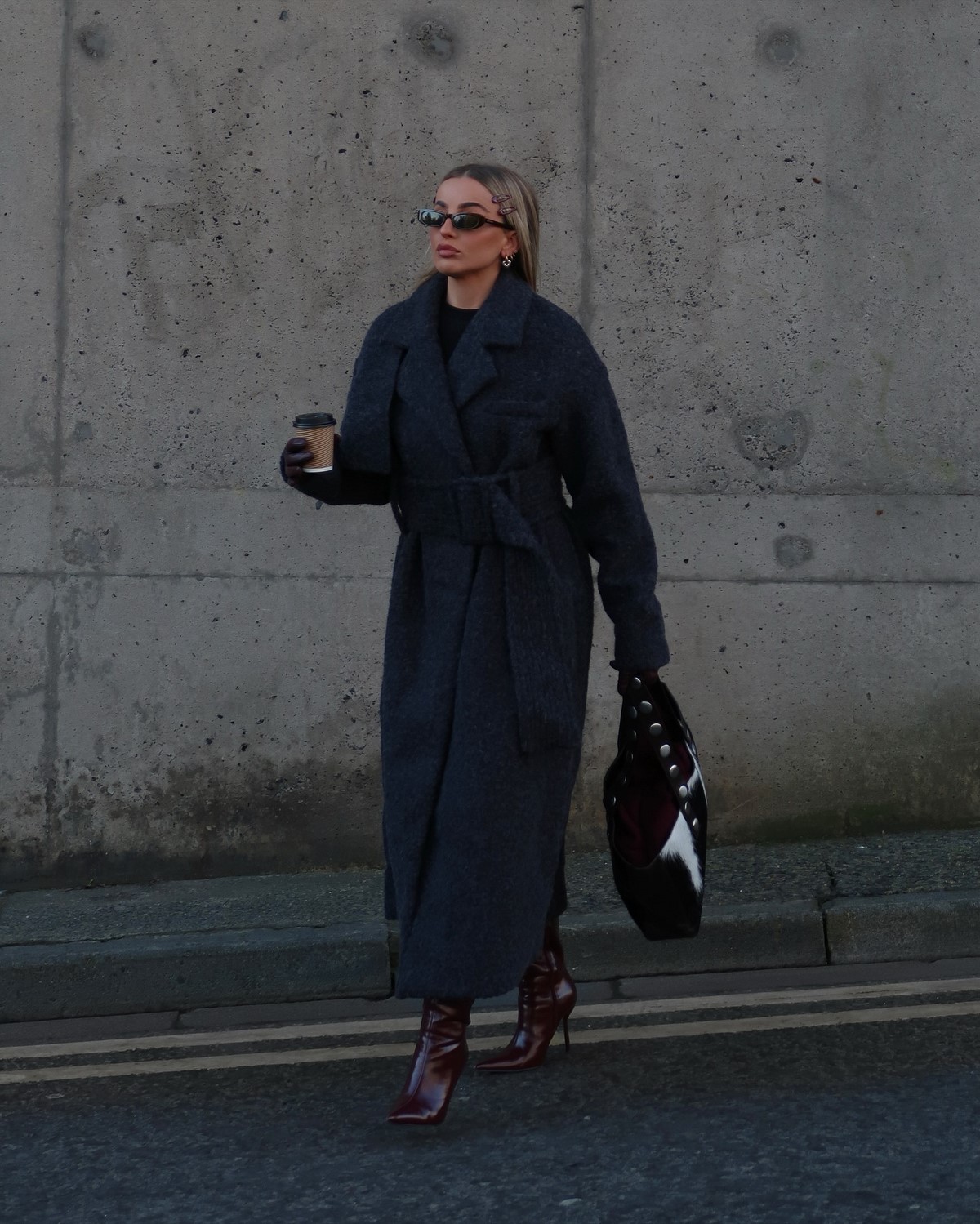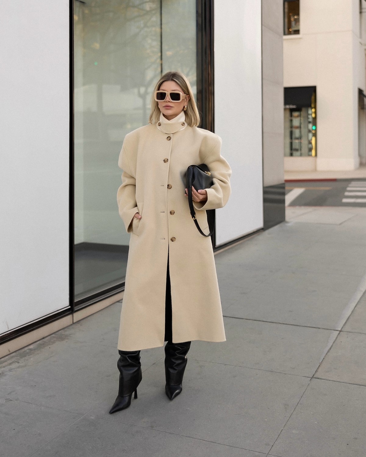 Современное пальто легко адаптируется под любой стиль. В дуэте с высокими сапогами и кожаными перчатками оно создаст элегантный образ в духе old money. С джинсами, массивными ботинками и худи — подчеркнет кэжуал-шик.