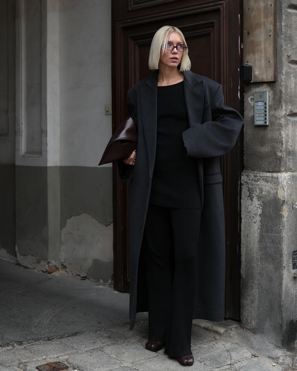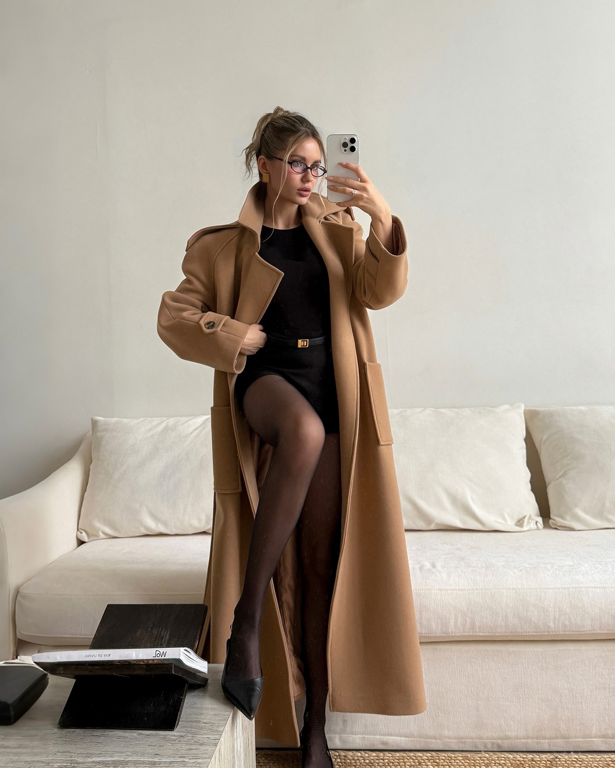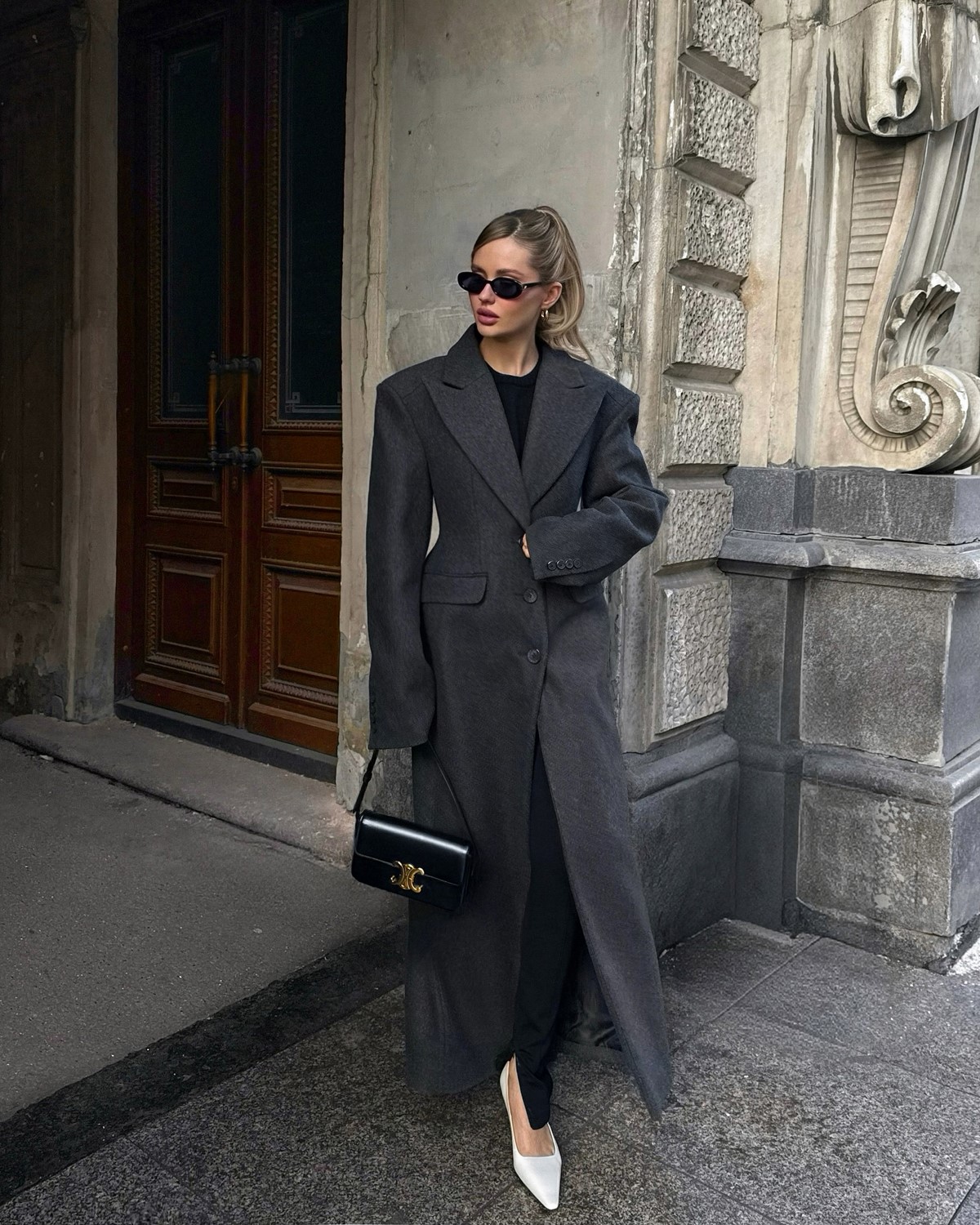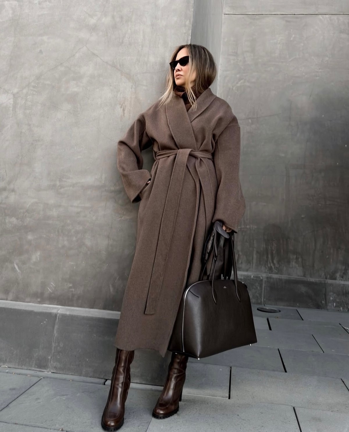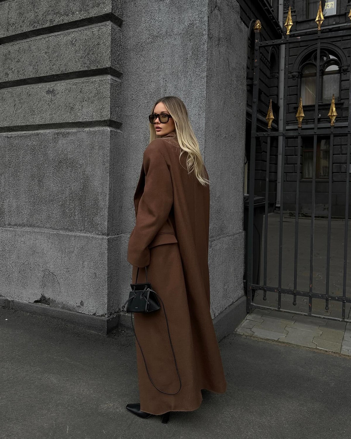 Длина до пола или щиколоток — фаворит сезона. Макси-пальто смотрится драматично и утонченно, особенно в сочетании с сапогами на каблуке или кроссовками для контраста. Модели с прямым силуэтом и мягким поясом создают элегантную вертикаль, вытягивая силуэт.
