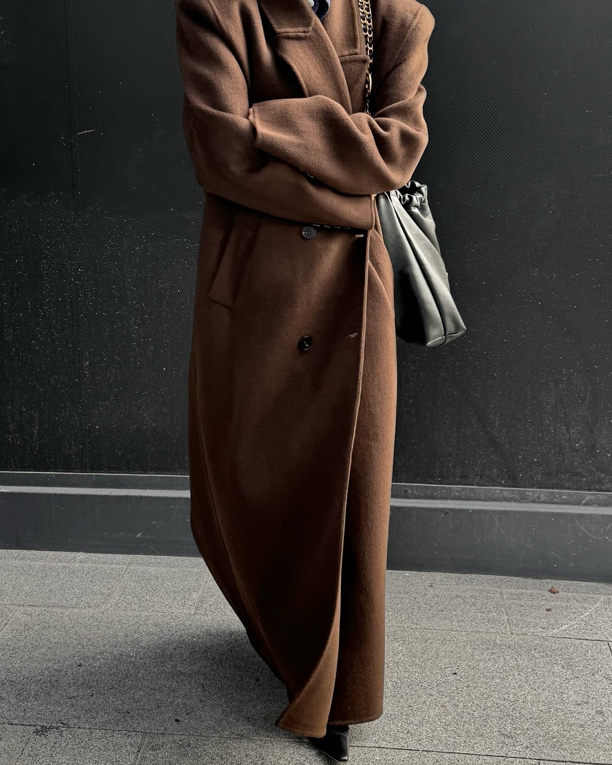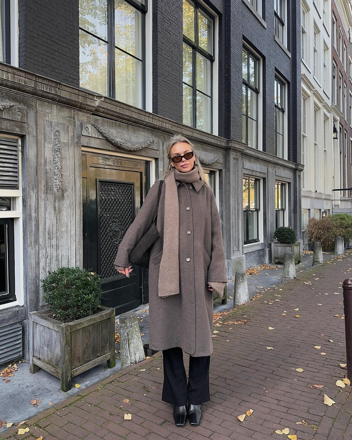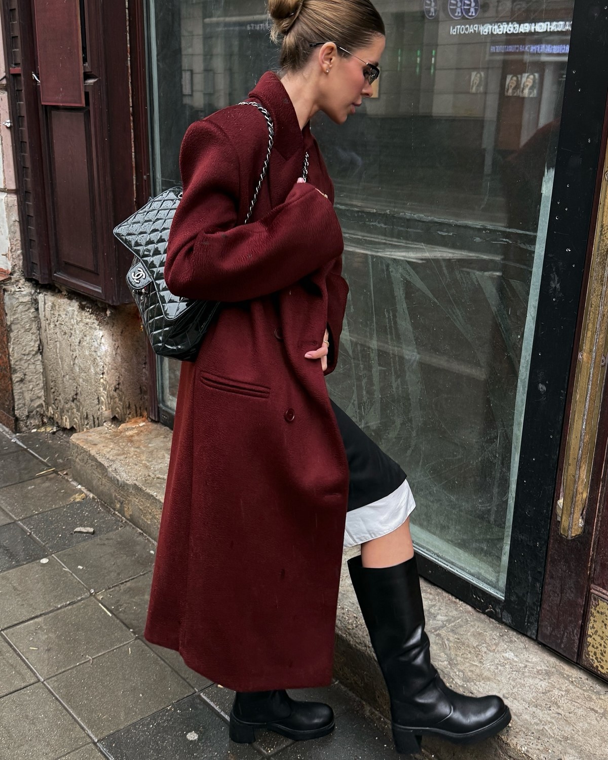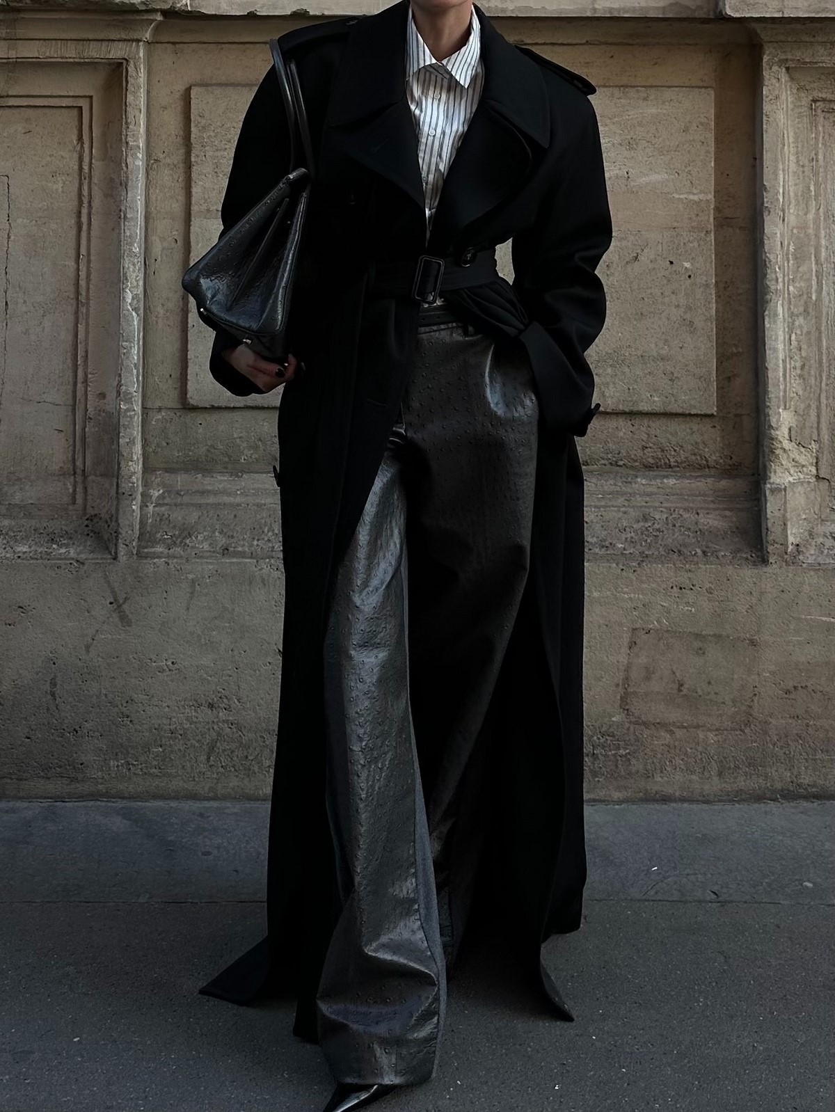 Длина до пола или щиколоток — фаворит сезона. Макси-пальто смотрится драматично и утонченно, особенно в сочетании с сапогами на каблуке или кроссовками для контраста. Модели с прямым силуэтом и мягким поясом создают элегантную вертикаль, вытягивая силуэт.