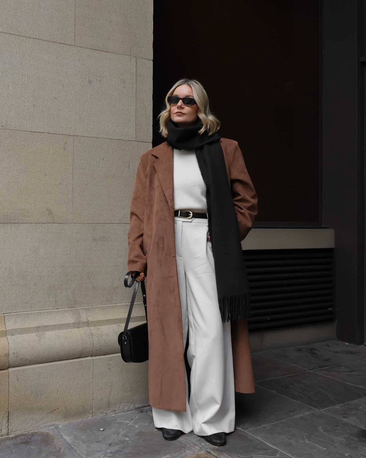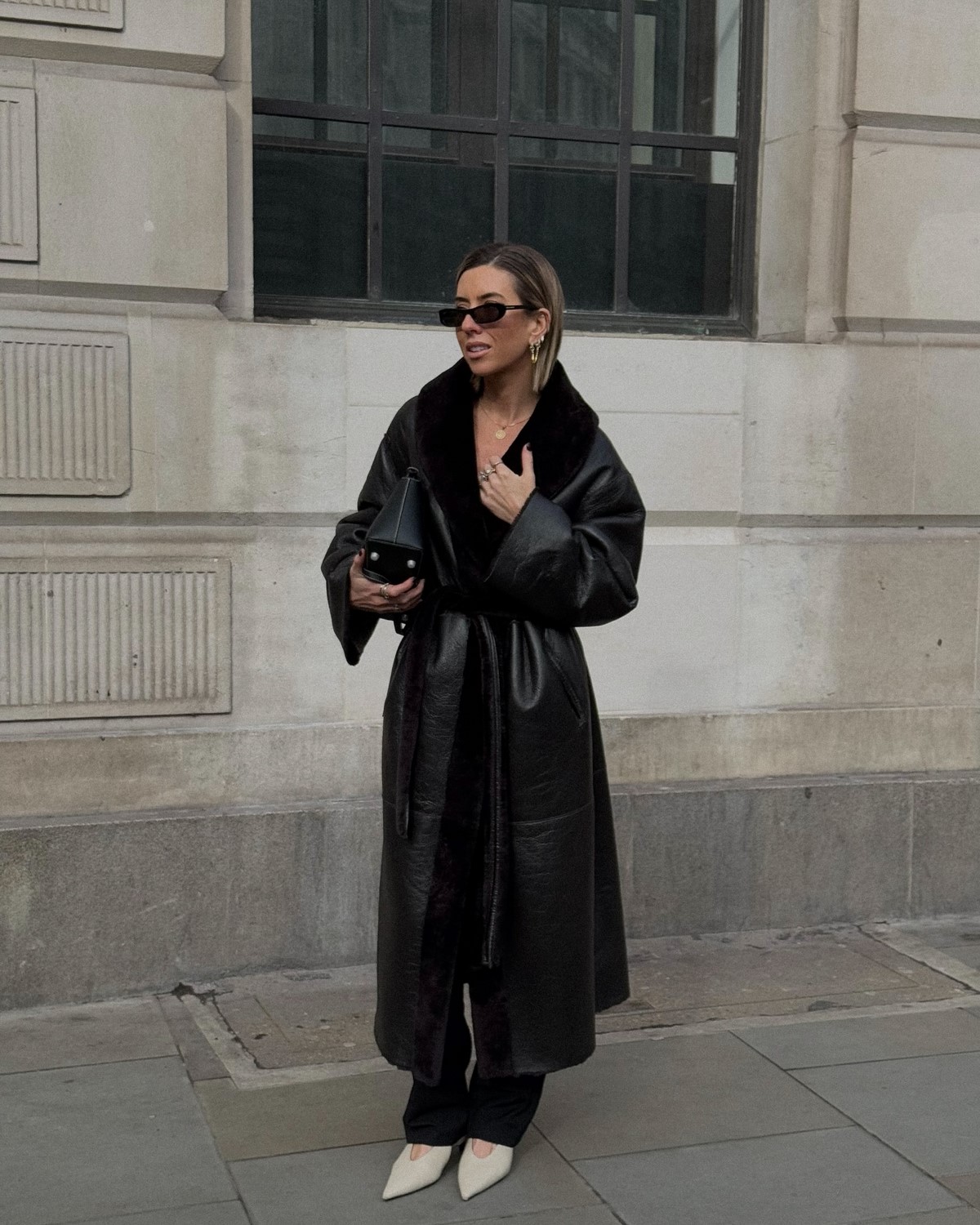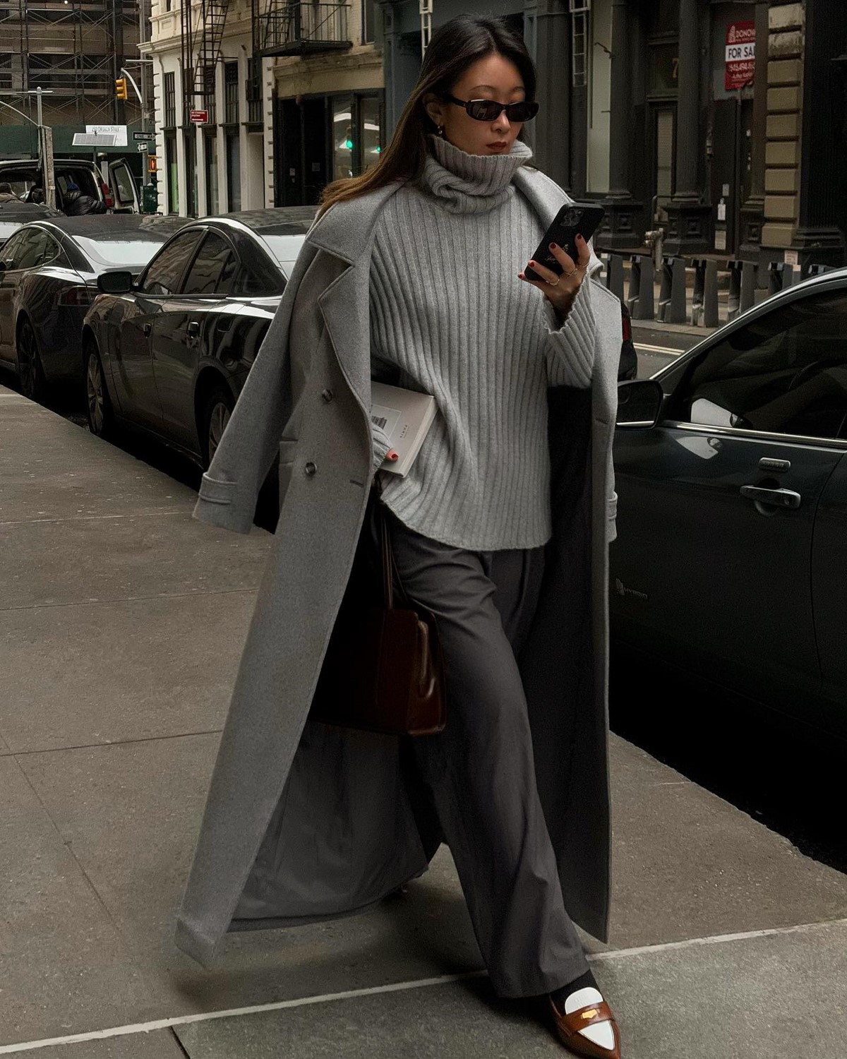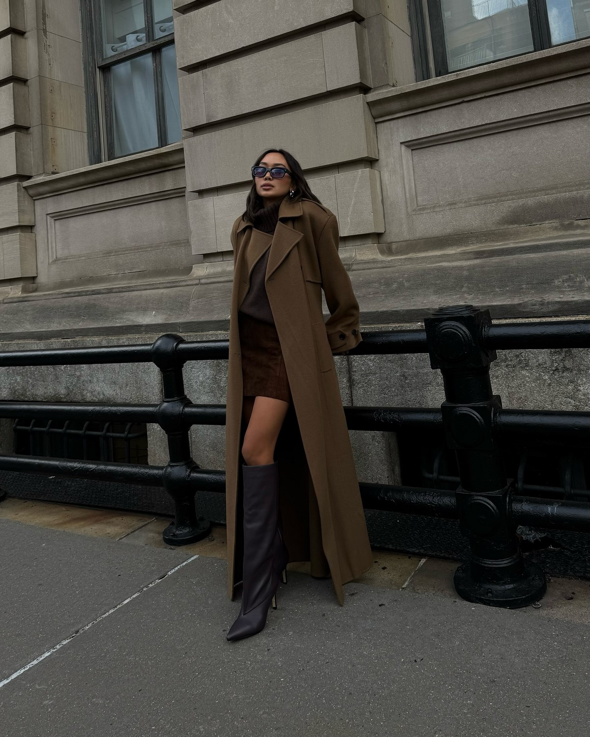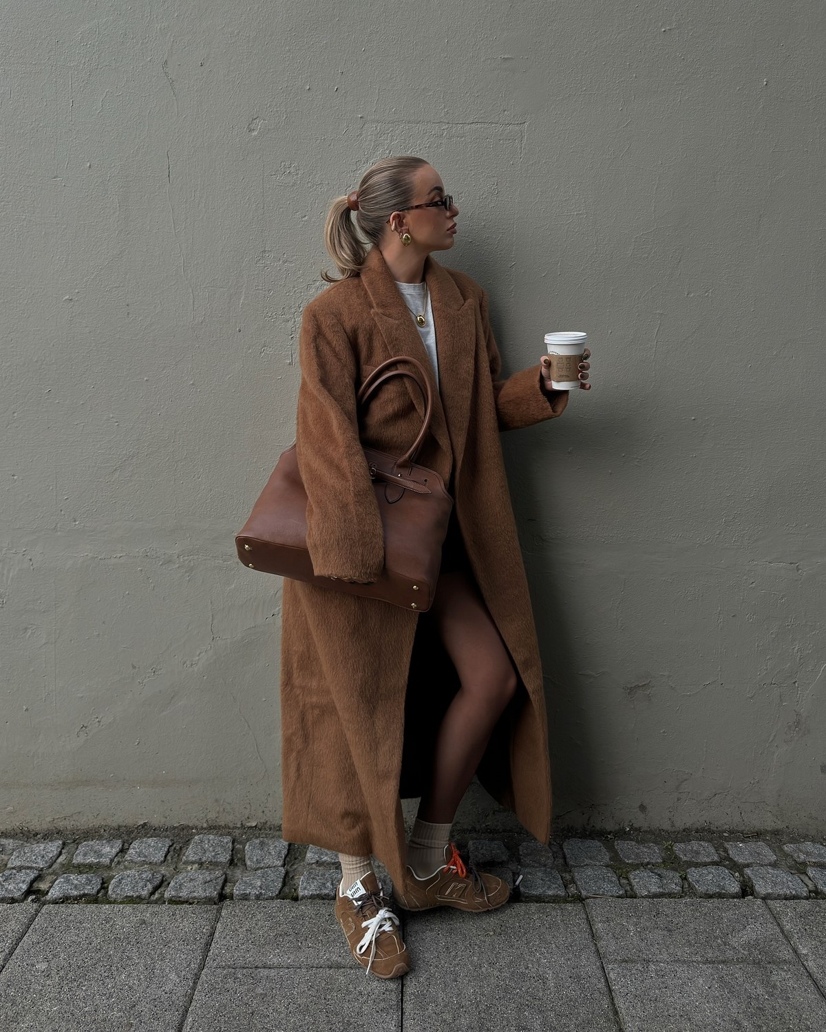Длина до пола или щиколоток — фаворит сезона. Макси-пальто смотрится драматично и утонченно, особенно в сочетании с сапогами на каблуке или кроссовками для контраста. Модели с прямым силуэтом и мягким поясом создают элегантную вертикаль, вытягивая силуэт.