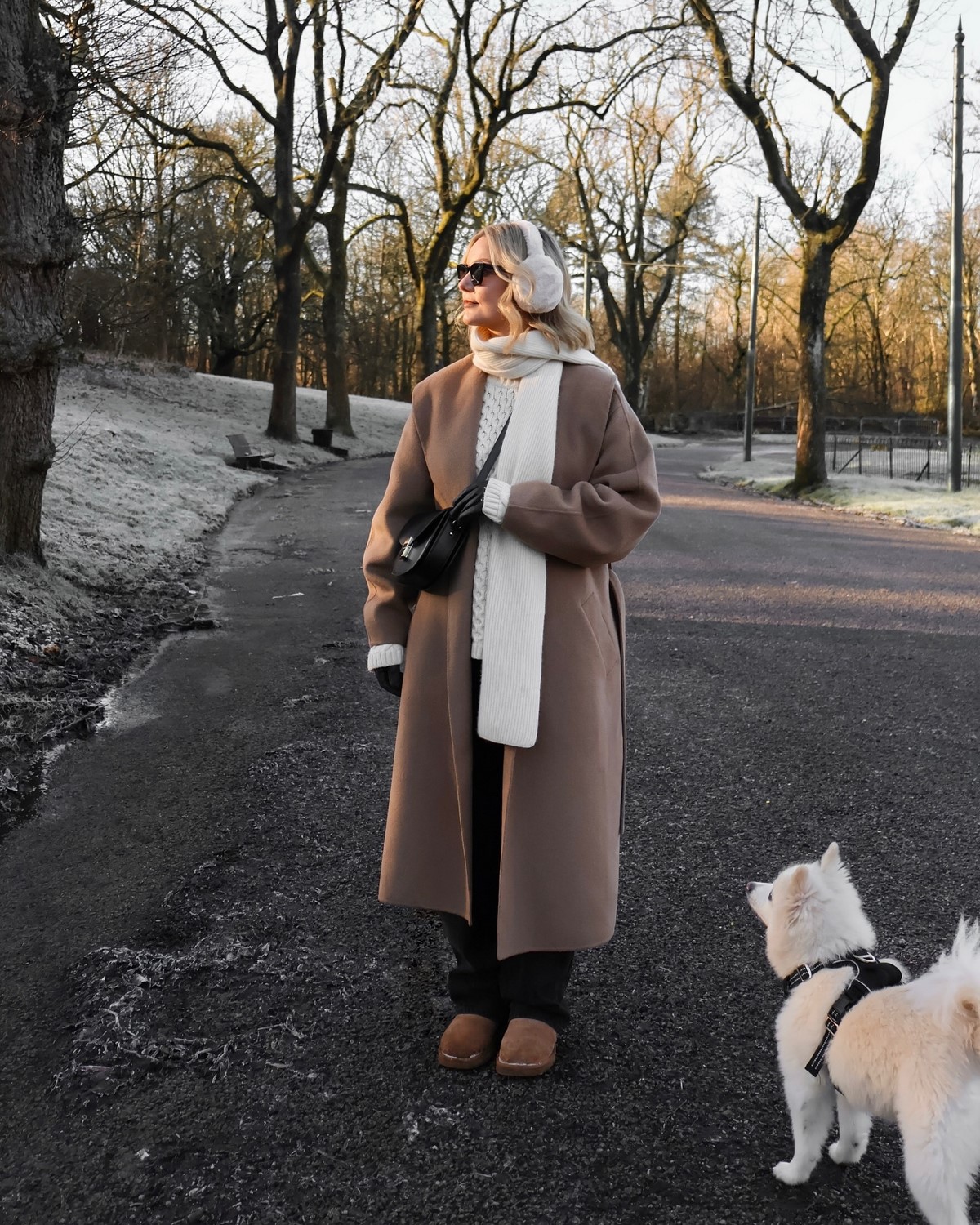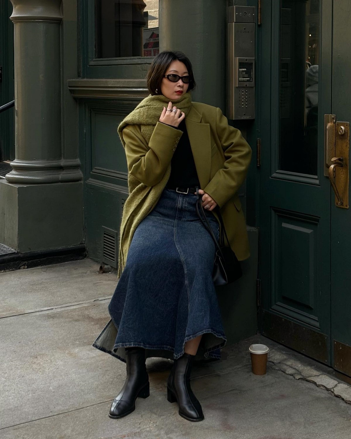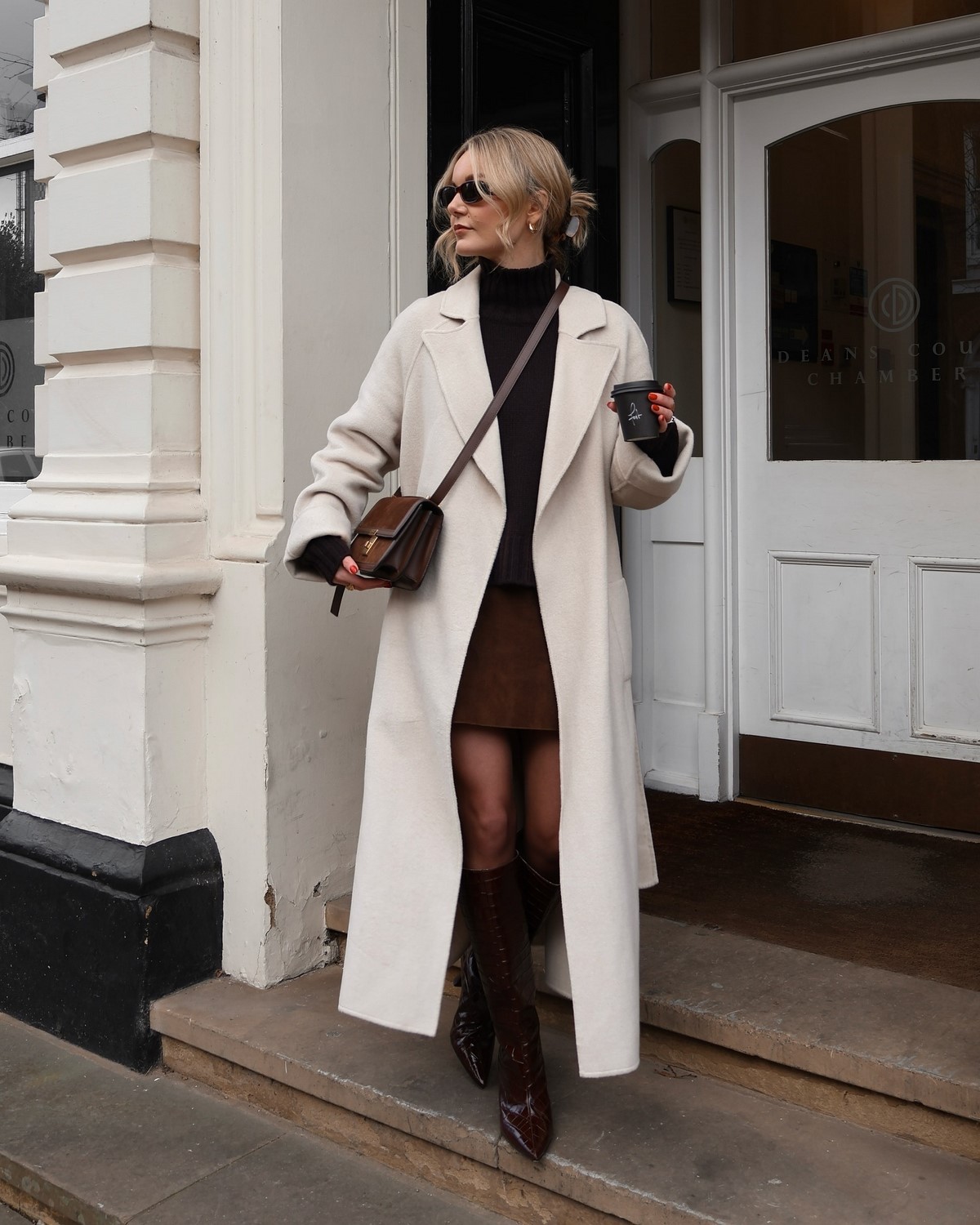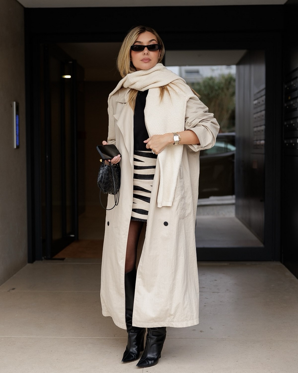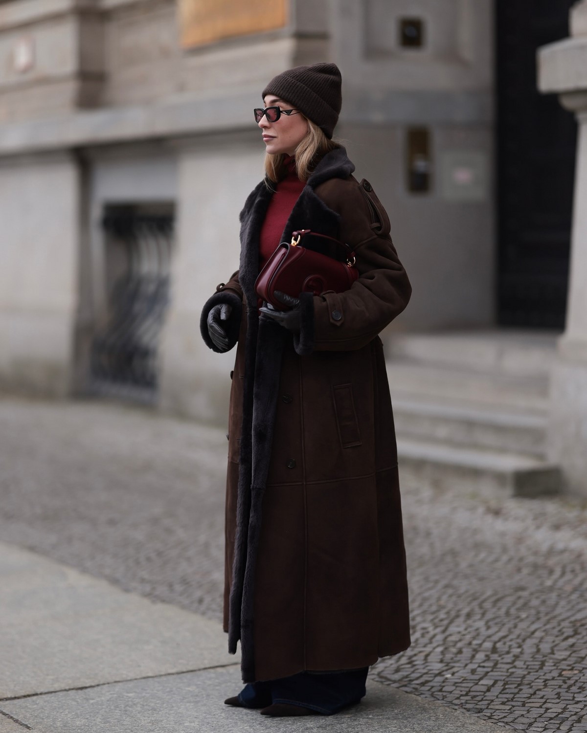 Длина до пола или щиколоток — фаворит сезона. Макси-пальто смотрится драматично и утонченно, особенно в сочетании с сапогами на каблуке или кроссовками для контраста. Модели с прямым силуэтом и мягким поясом создают элегантную вертикаль, вытягивая силуэт.