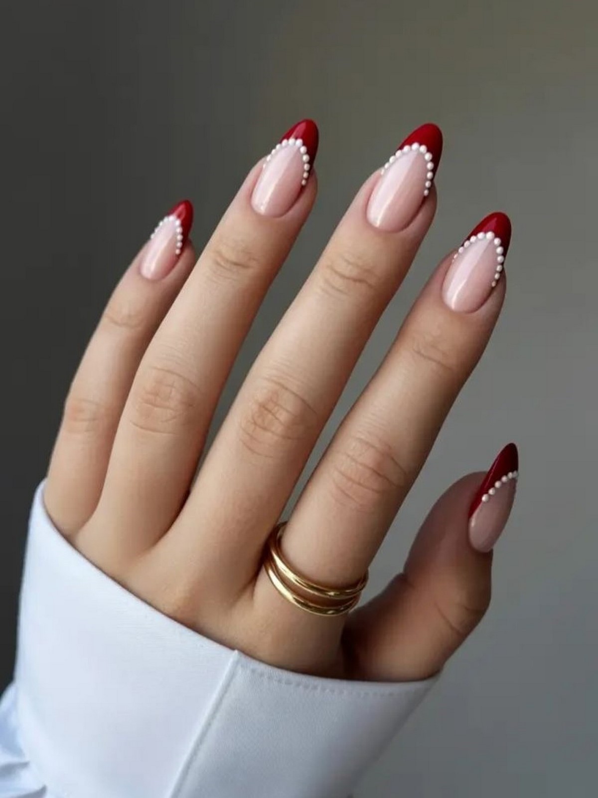Красный френч в зимнем сезоне 2026 приобретает более благородный характер. В моде оттенки бордо, кармина, темной вишни и граната, которые создают эффект дорогого лака. Контраст с прозрачной или молочной базой делает дизайн выразительным, но не перегруженным.