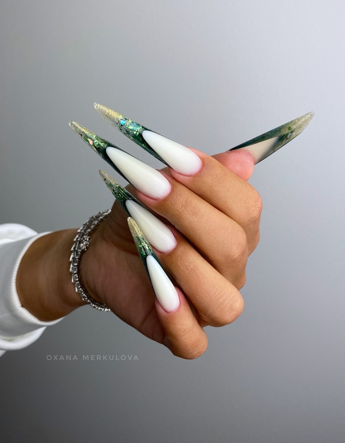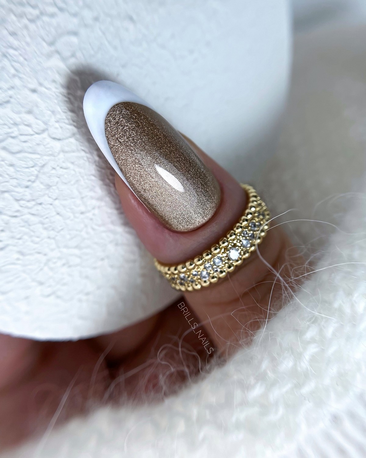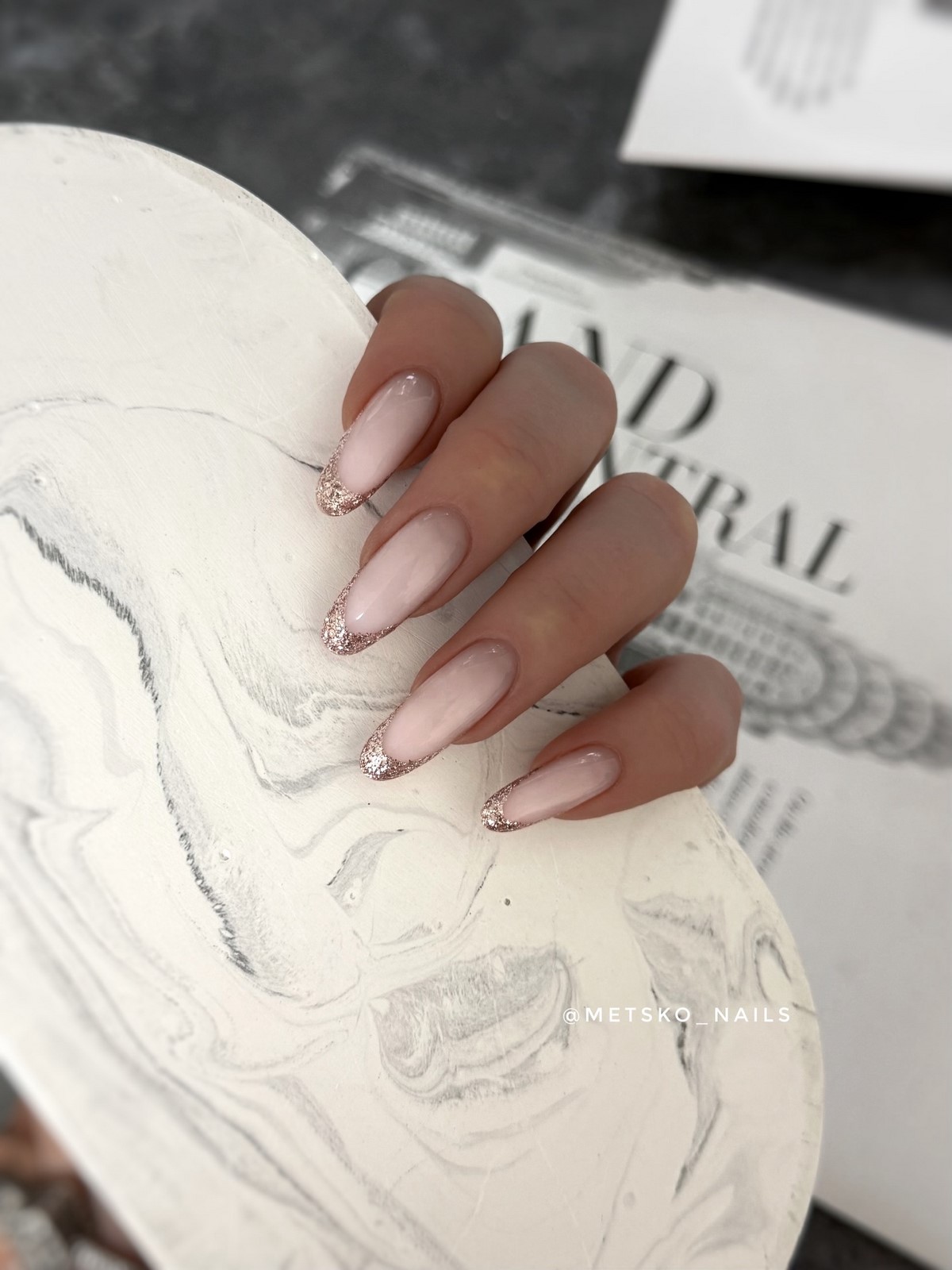 Металлический френч зимой 2026 года выглядит особенно эффектно благодаря холодному свечению. Серебро, платина, мягкое золото или хромированное шампанское добавляют дизайну визуальную глубину. Такой френч идеально сочетается с нюдовой базой и минималистичной формой ногтей.
