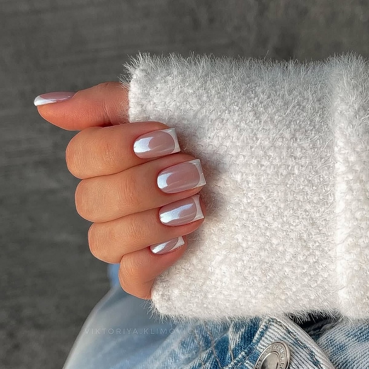 Френч с втиркой становится воплощением современной роскоши. Перламутровые, жемчужные и ледяные эффекты создают мягкое свечение, которое выглядит особенно изысканно в зимнем свете. База при этом остается максимально нейтральной.