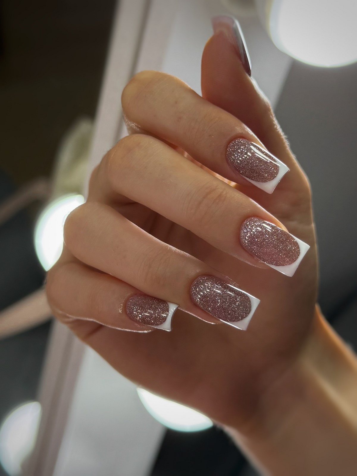 Френч с блестками зимой 2026 года выглядит сдержанно и утонченно. В моде мелкий шиммер и деликатное сияние, а не крупные глиттеры. Блестки чаще всего используются только на линии улыбки.