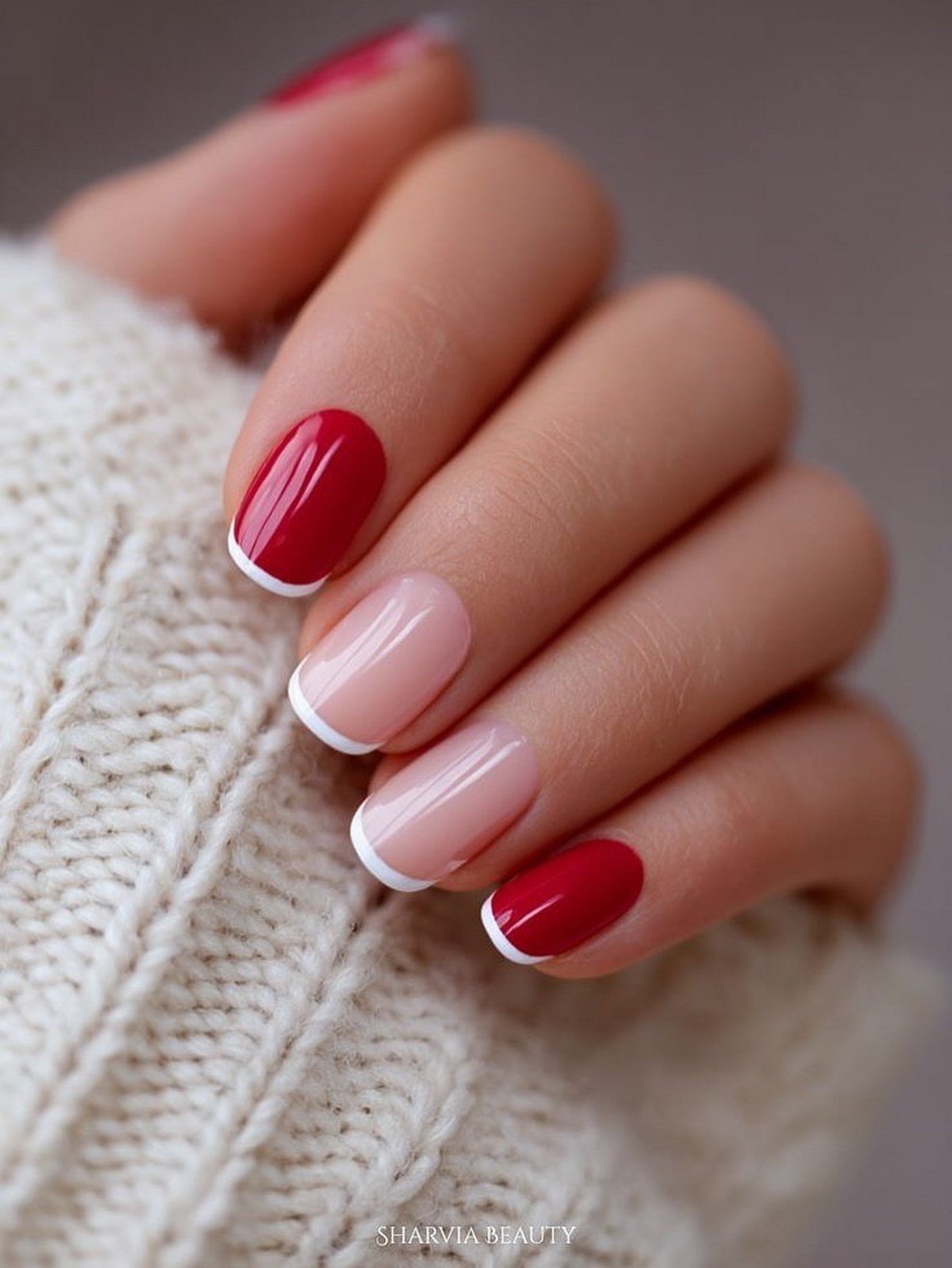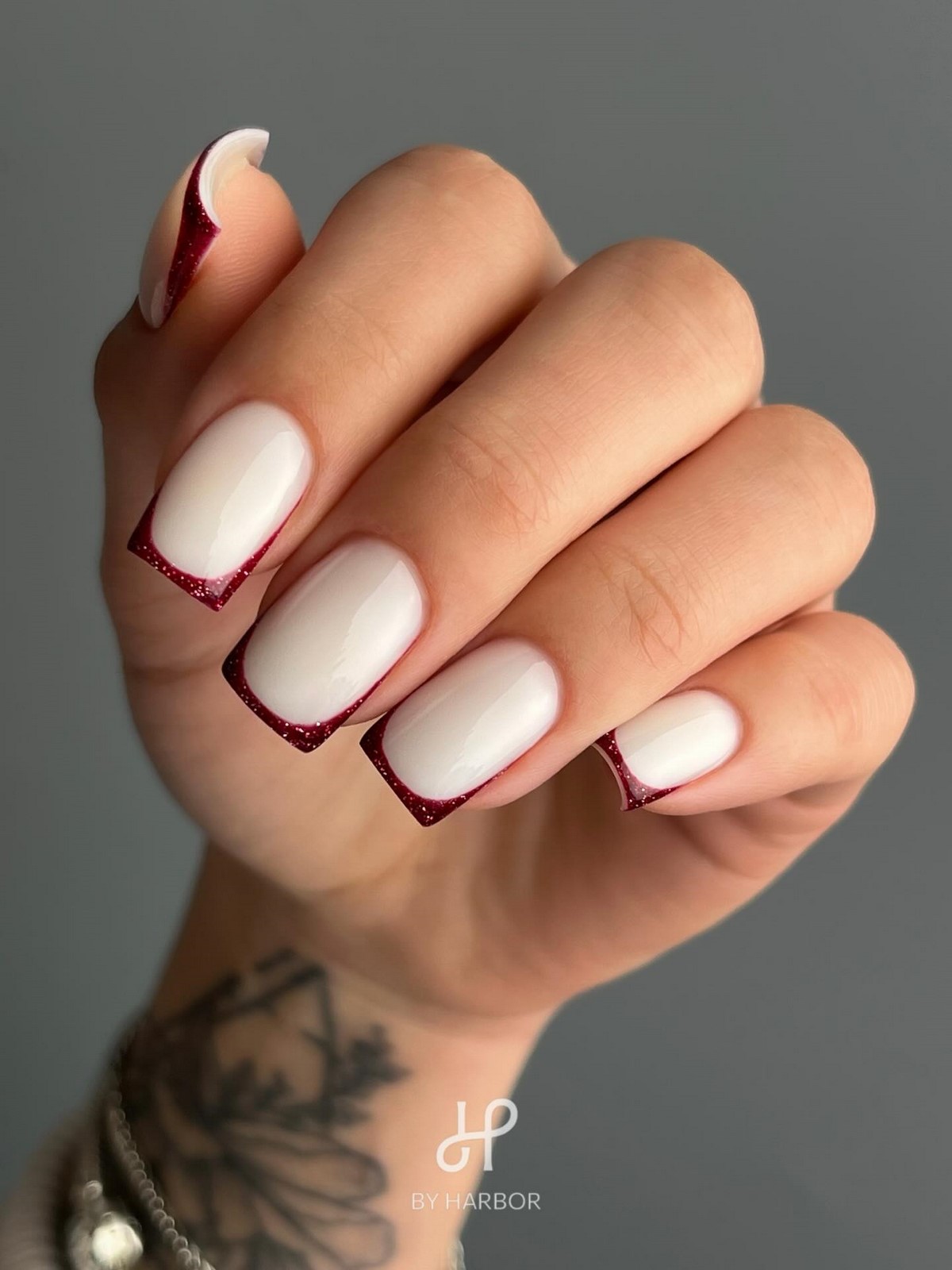 Красный френч в зимнем сезоне 2026 приобретает более благородный характер. В моде оттенки бордо, кармина, темной вишни и граната, которые создают эффект дорогого лака. Контраст с прозрачной или молочной базой делает дизайн выразительным, но не перегруженным.