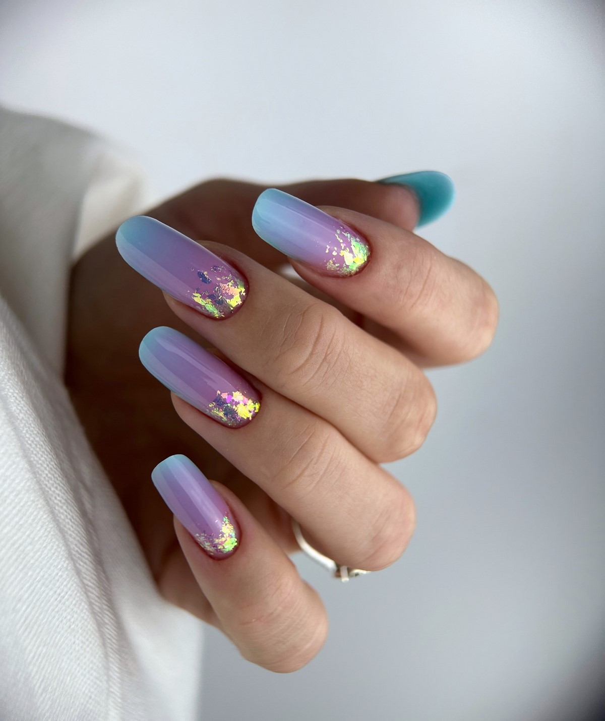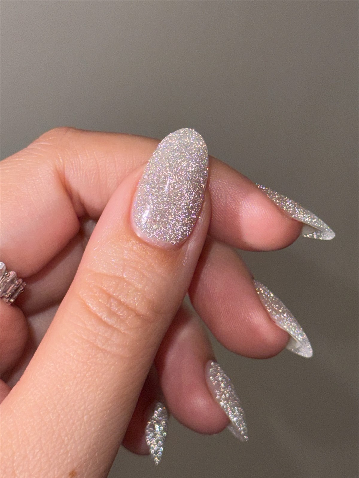 Один из самых утонченных трендов сезона это мягкий переход глиттера от кутикулы к центру ногтя. Такой эффект создает ощущение легкого свечения и визуально удлиняет ногтевую пластину. Основой чаще всего служат холодные нюдовые или молочные оттенки.