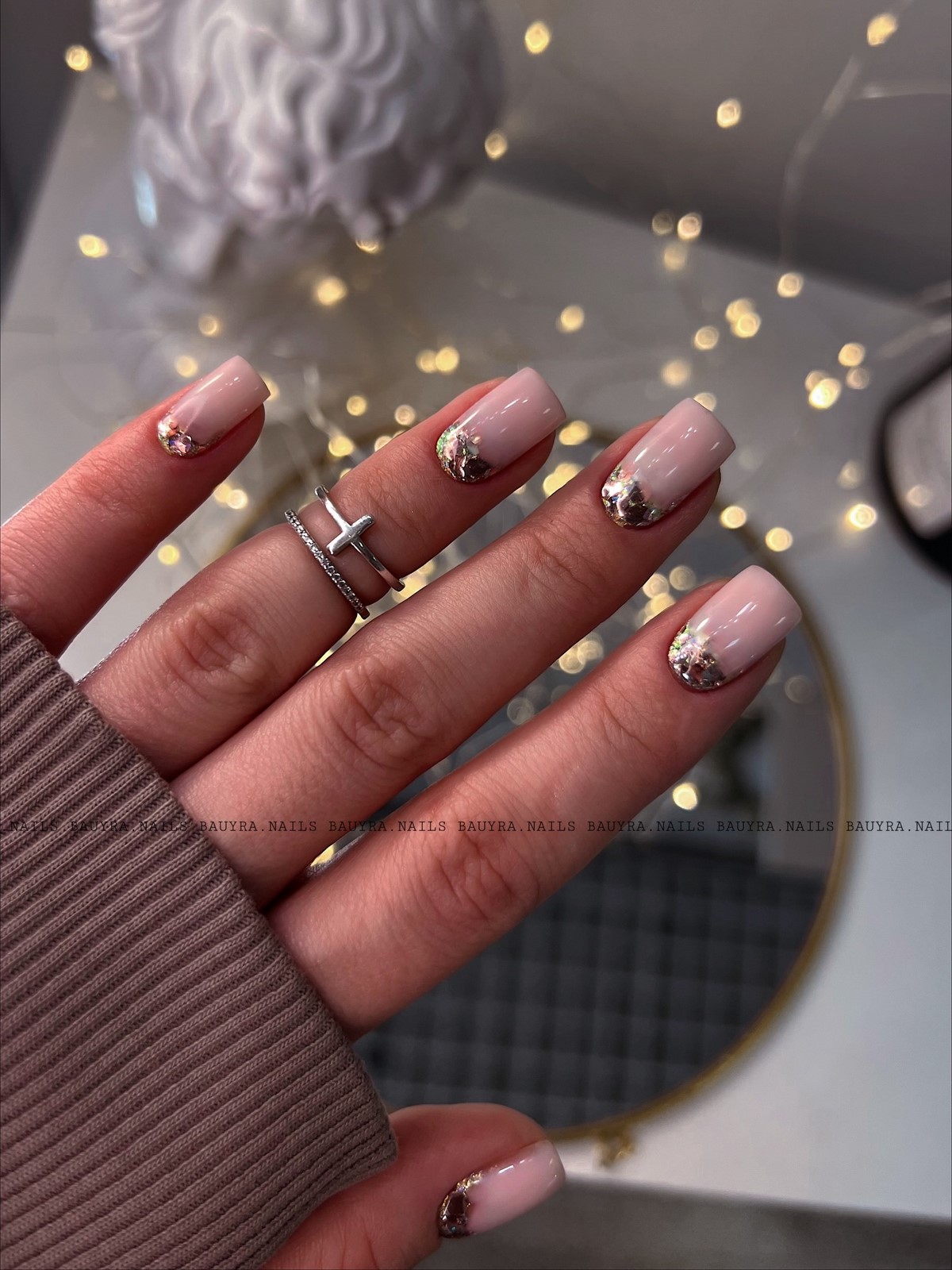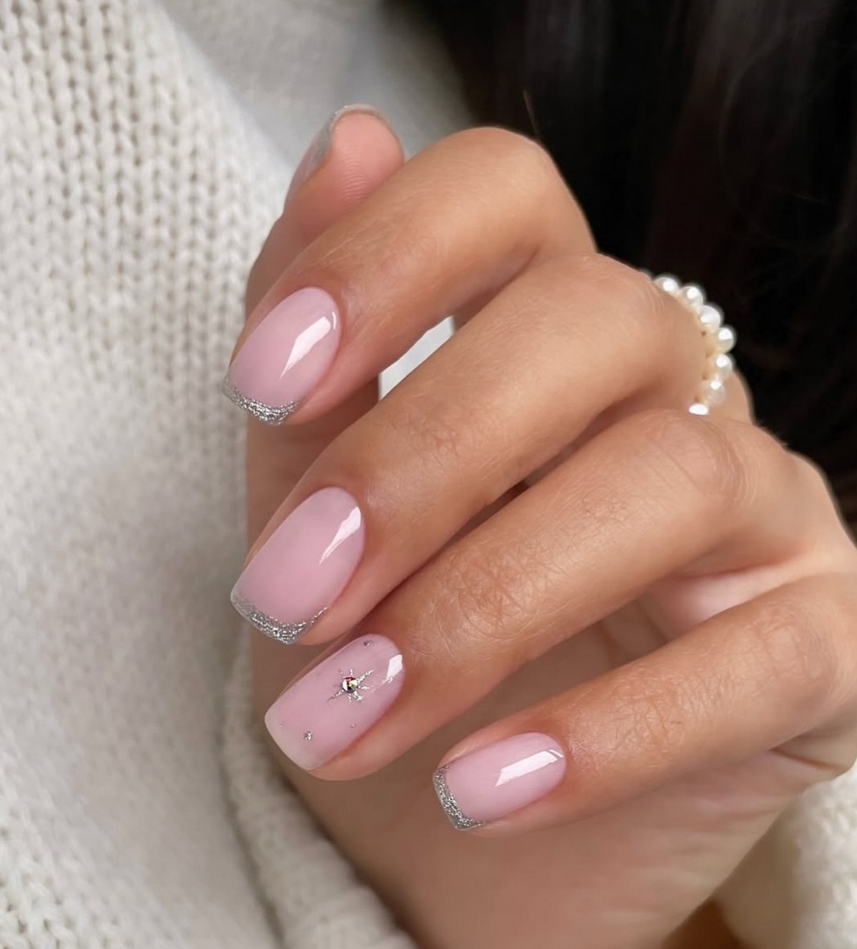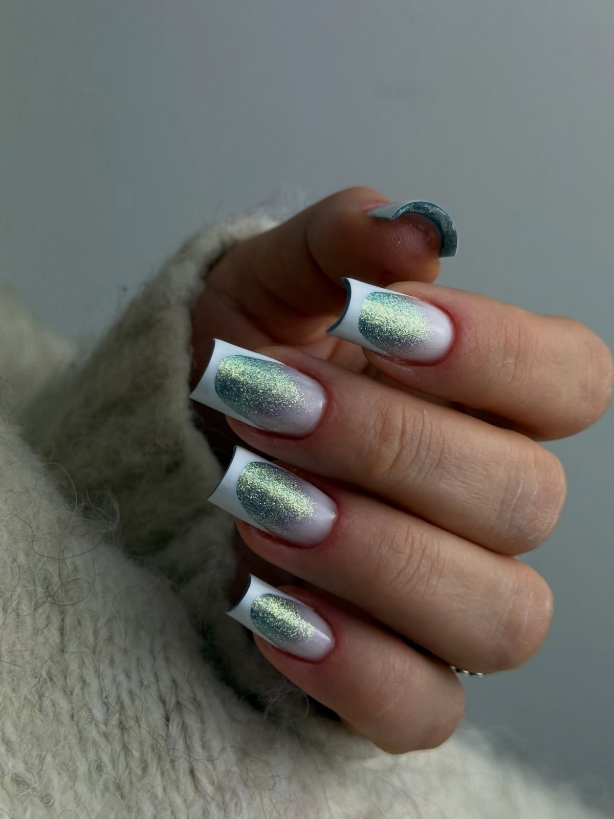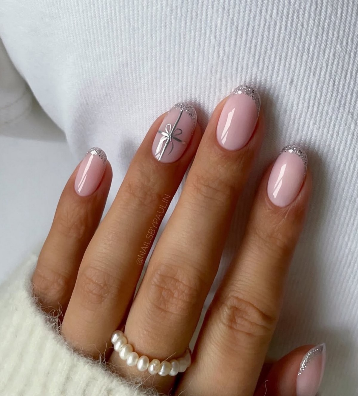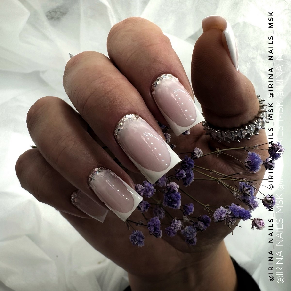 Френч с глиттером особенно красиво смотрится на ногтях средней длины и в сочетании с нюдовой базой. Он подходит для тех, кто ценит классику, но хочет добавить зимнего настроения.