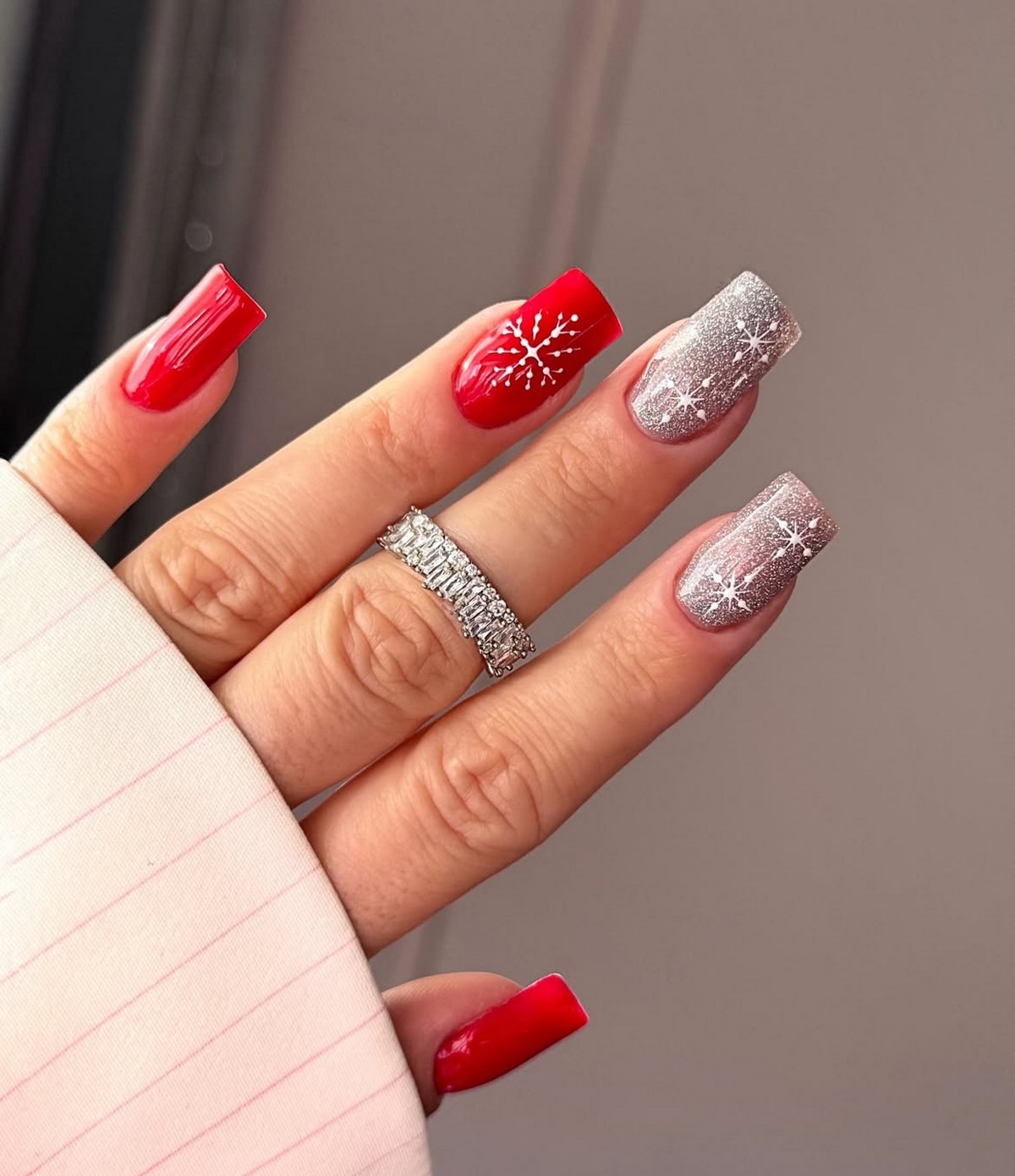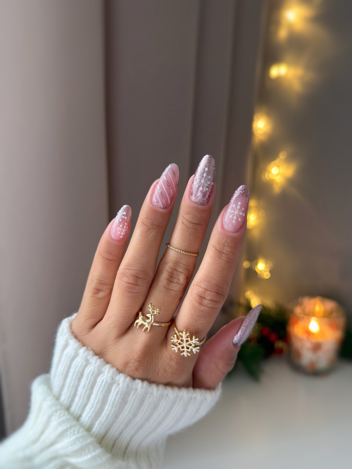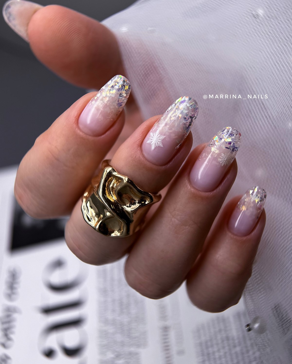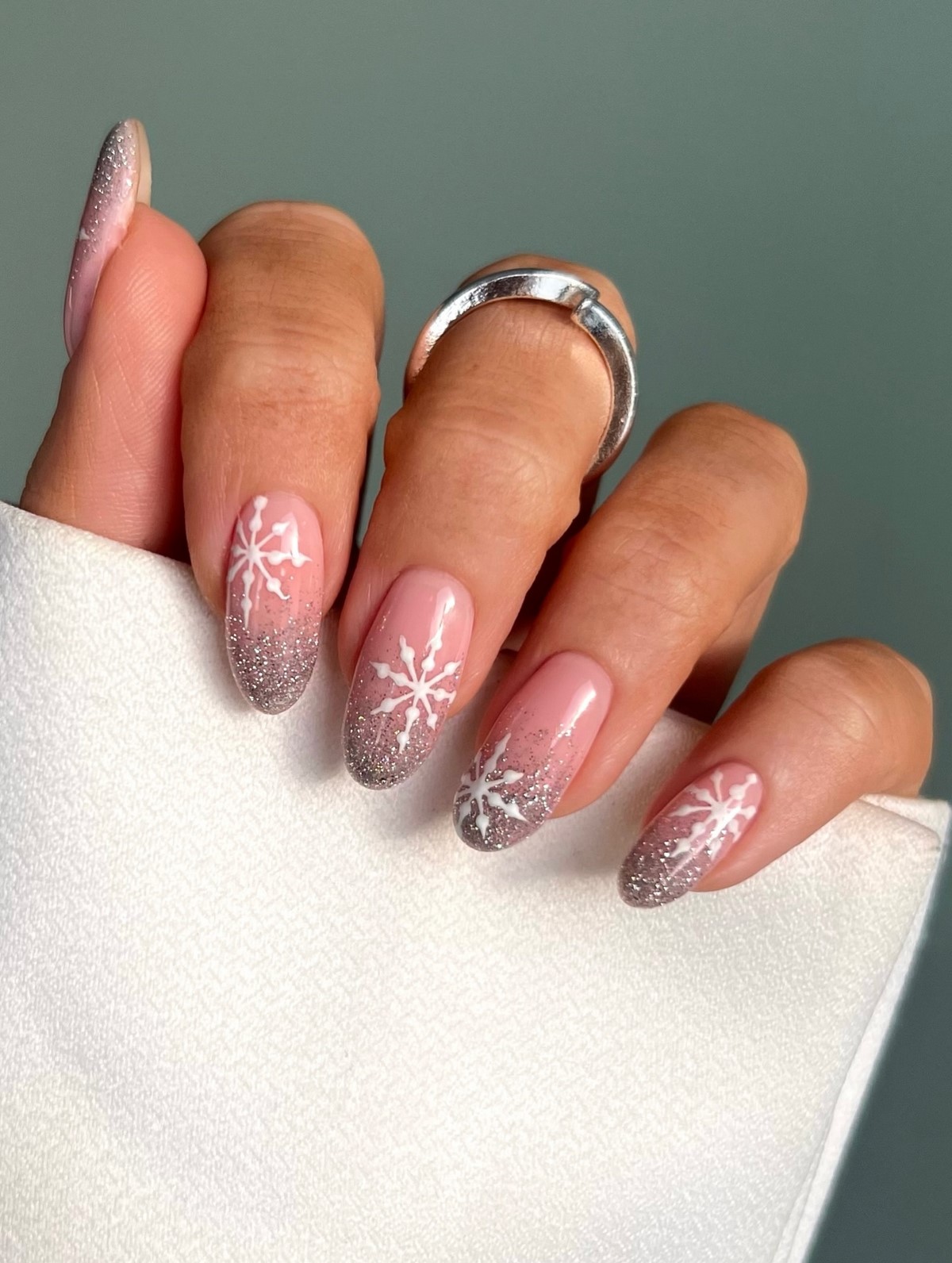 Чаще всего используются прозрачные или молочные базы, а глиттер наносится точечно. Снежинки выполняются в минималистичном стиле, без лишних деталей.