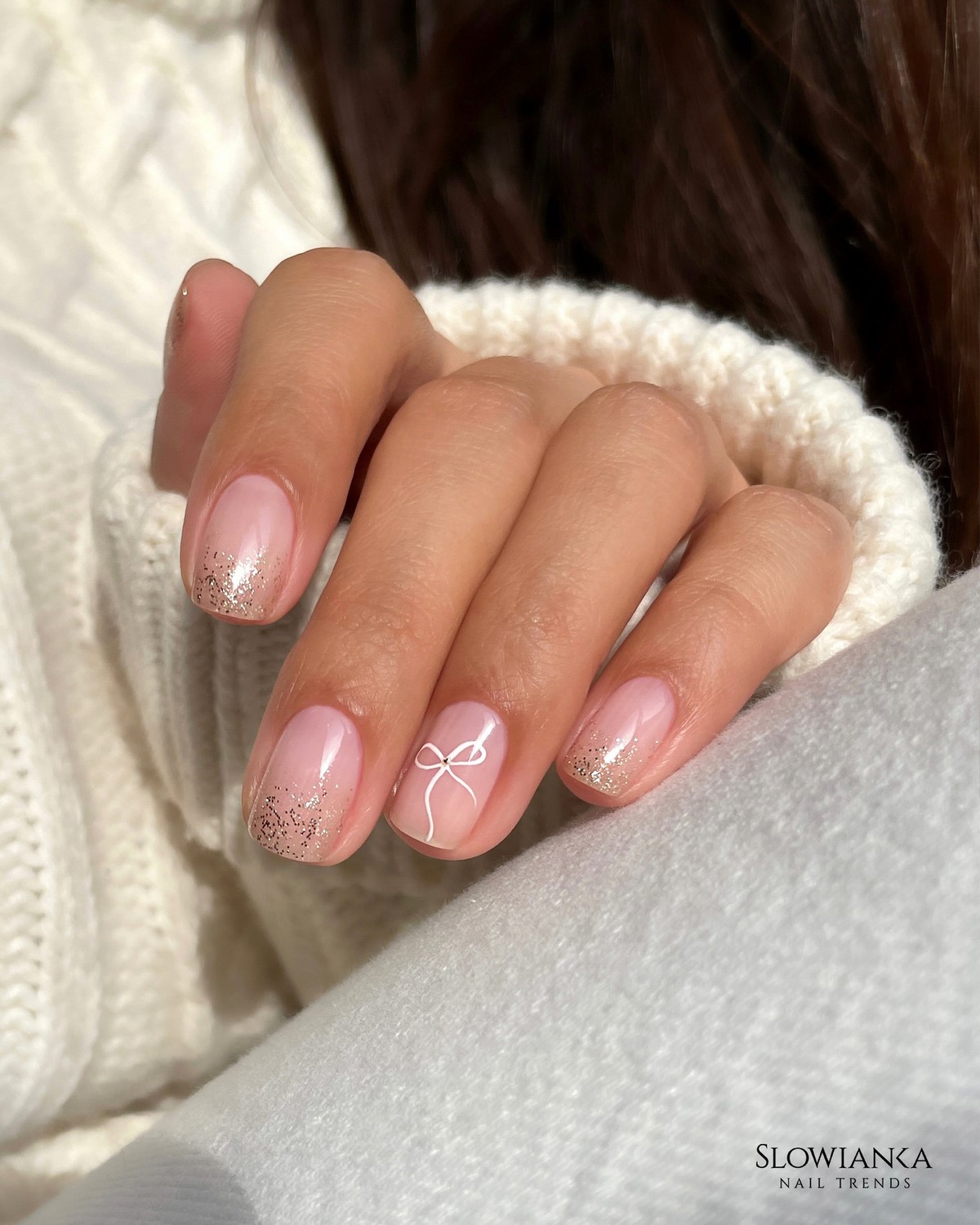 Нюдовый маникюр с глиттером остается фаворитом зимы 2026 благодаря своей универсальности. Минимальное количество блесток добавляет глубину и делает покрытие более выразительным. Особенно актуальны полупрозрачные базы с микроглиттером.