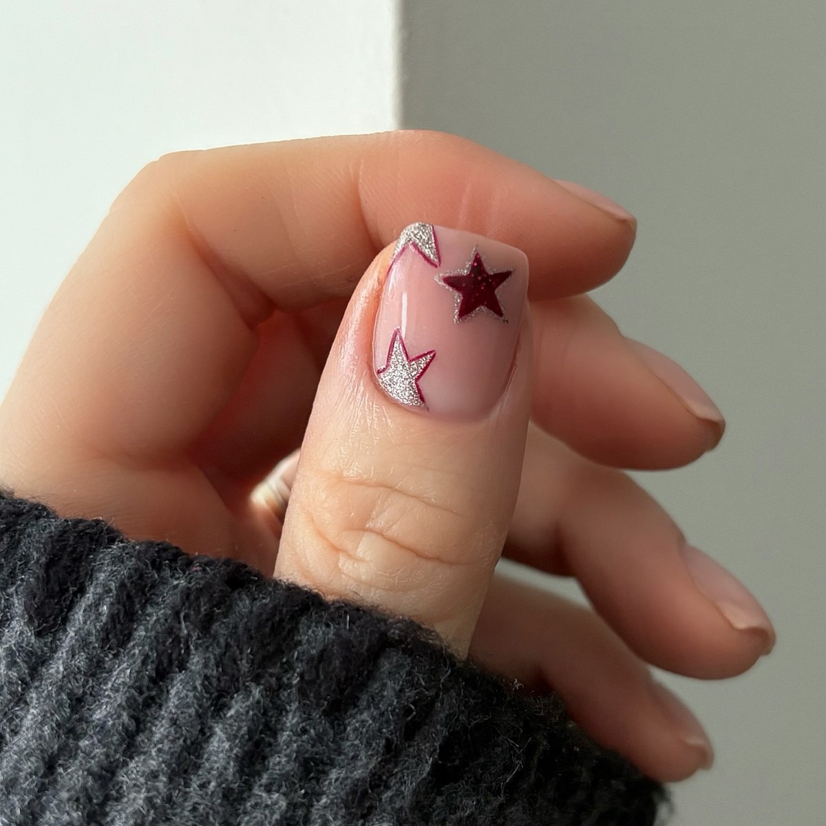 Звездные мотивы возвращаются в зимний маникюр 2026 в более утонченном виде. Небольшие глиттерные звезды размещаются на нейтральной базе и создают эффект зимнего неба. Такой дизайн смотрится сказочно, но не перегруженно.