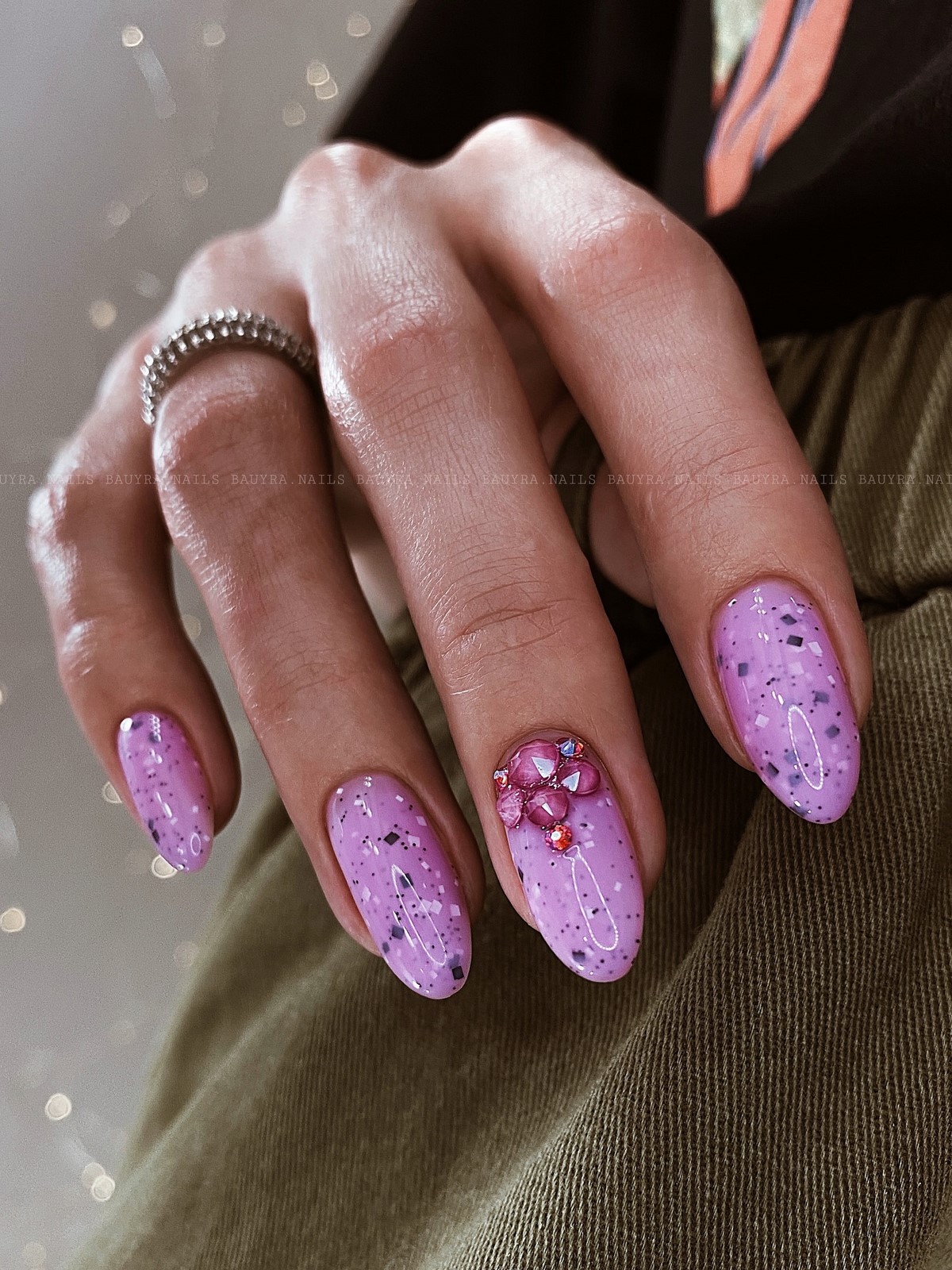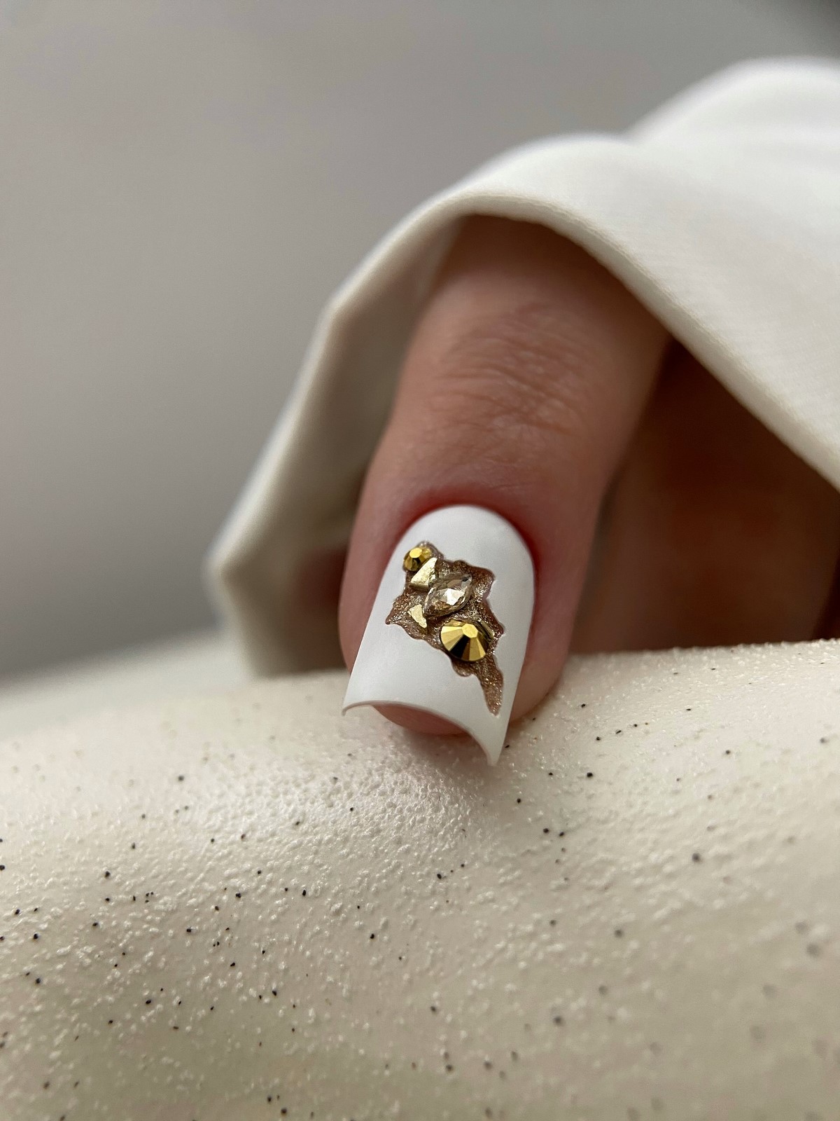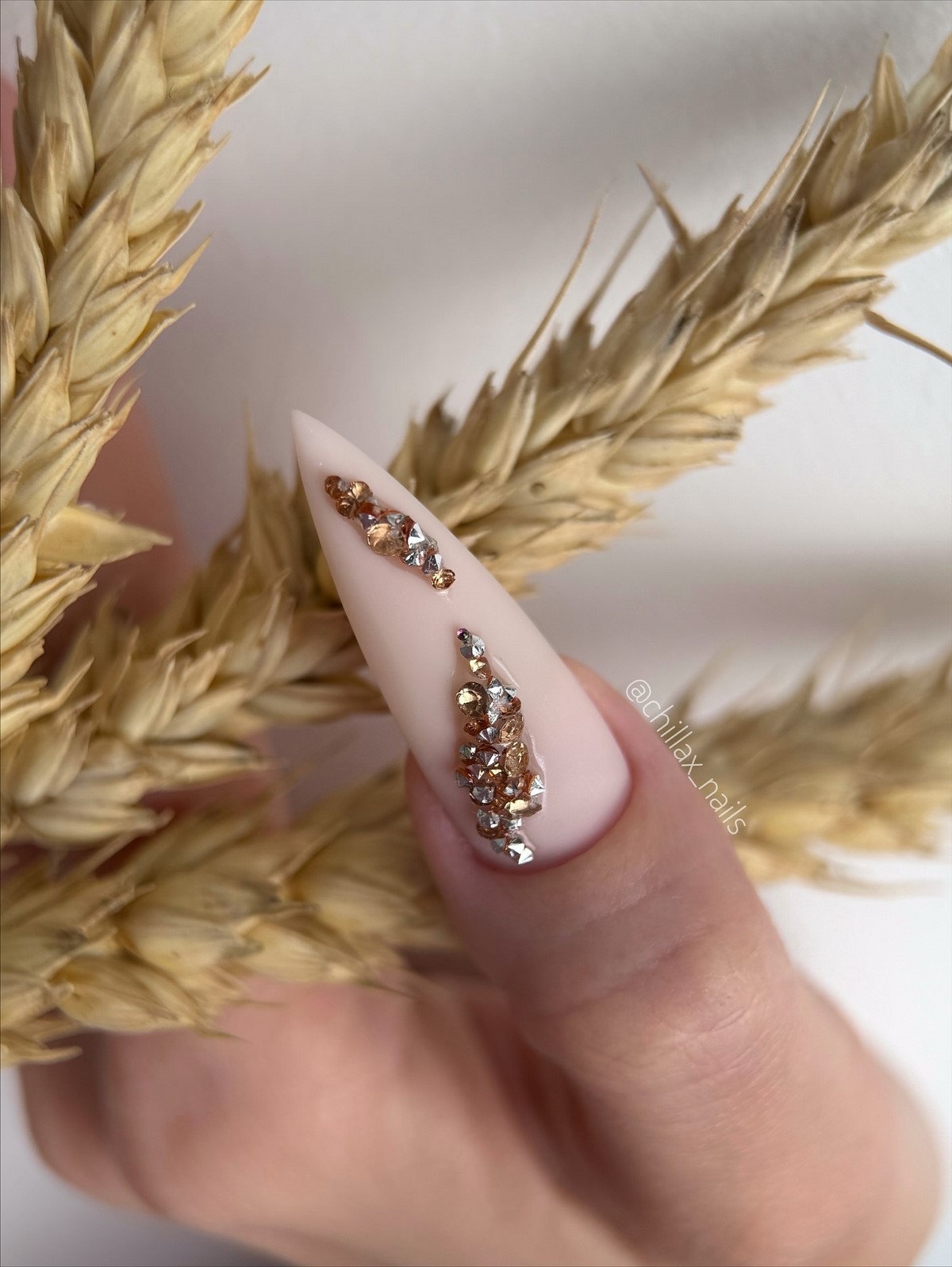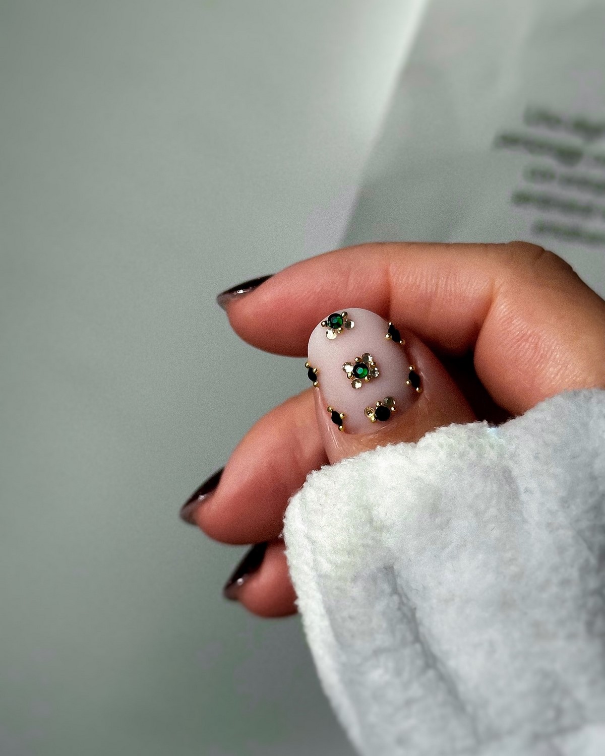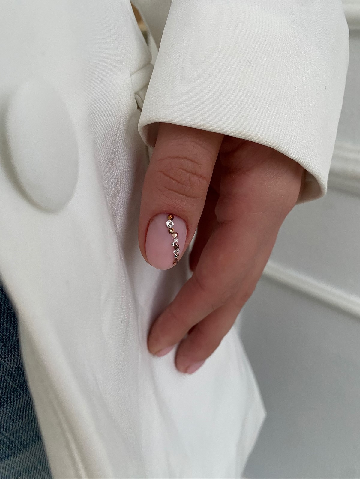 Стразы, подобранные в тон основного покрытия, — тренд, который отличается сдержанностью и стилем. Такой вариант выглядит более гармонично и утончённо, чем контрастные камни, создавая ощущение единого цветового поля. Особенно эффектно этот дизайн раскрывается на глубоких зимних оттенках — бордо, сапфировом, кофейном и изумрудном.