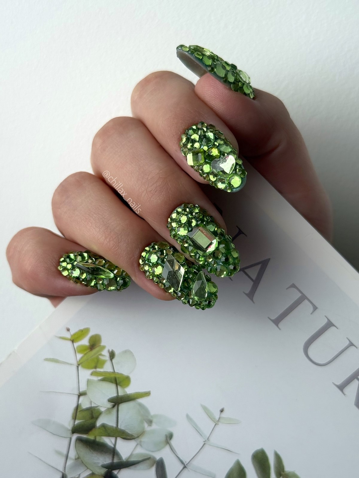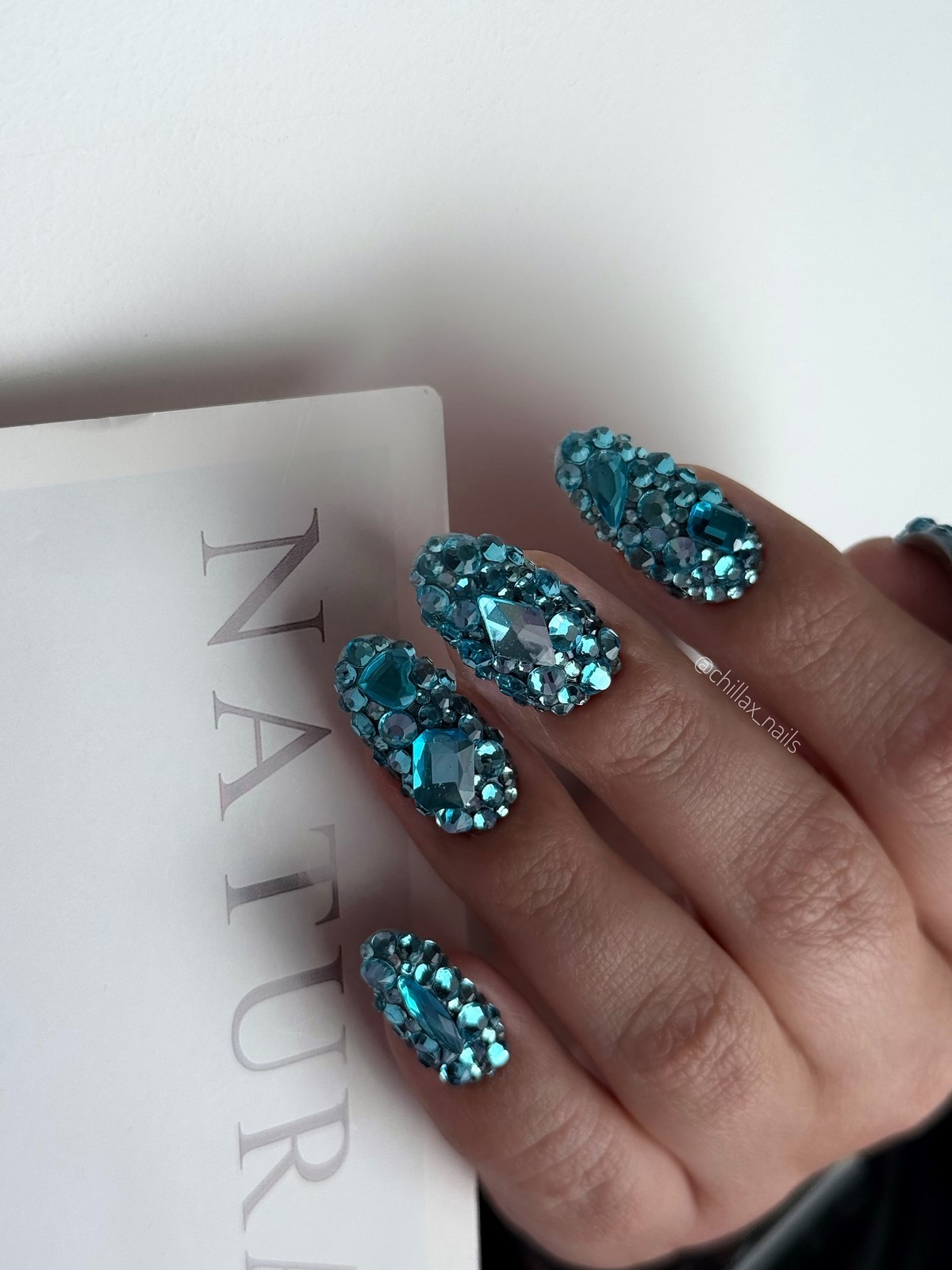 Смелый и по-настоящему зимний тренд — полностью украшенные стразами ногти. Такой маникюр выглядит как мини-арт-объект: мерцающий, праздничный и ультра-гламурный. Он подходит для тех, кто не боится яркого блеска и хочет создать по-настоящему звездный образ.