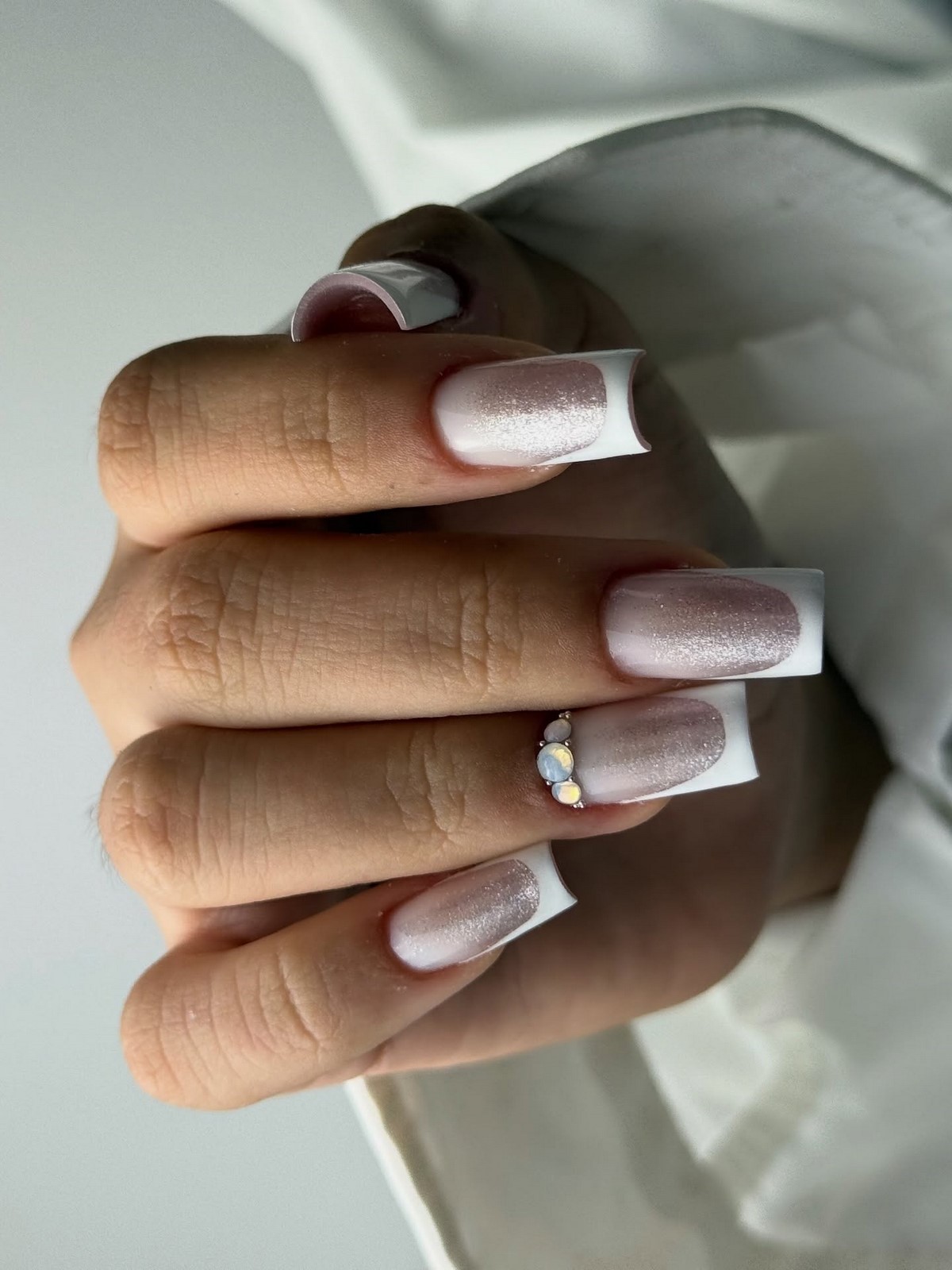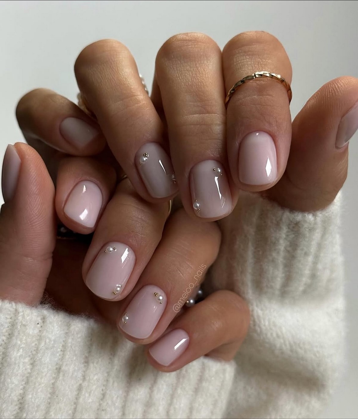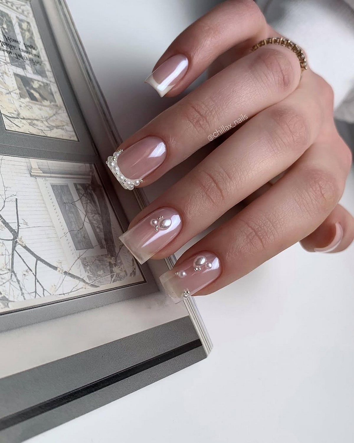 В этом сезоне жемчуг отлично сочетается с молочными и пастельными оттенками, а также с прозрачной базой. Мастера часто комбинируют жемчуг с серебристыми акцентами или тонким мерцающим градиентом, создавая мягкое «снежное» сияние.