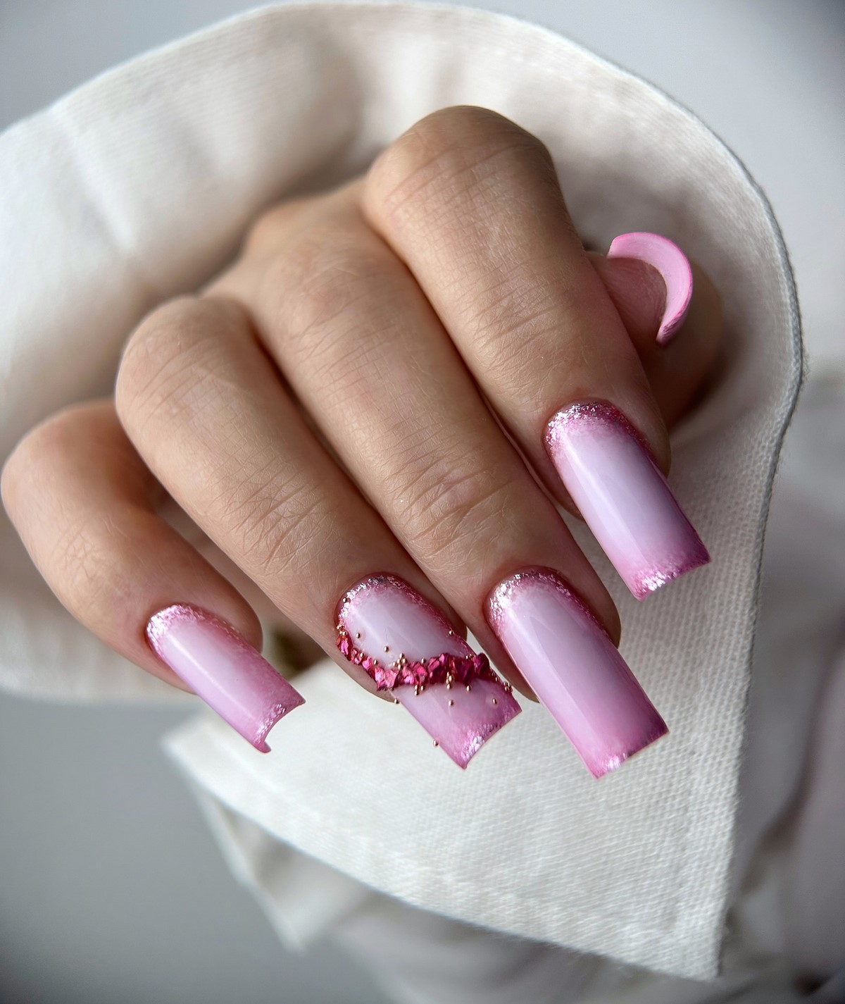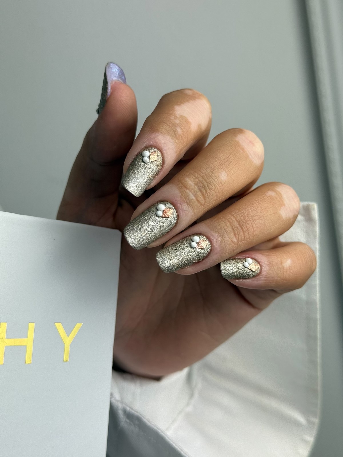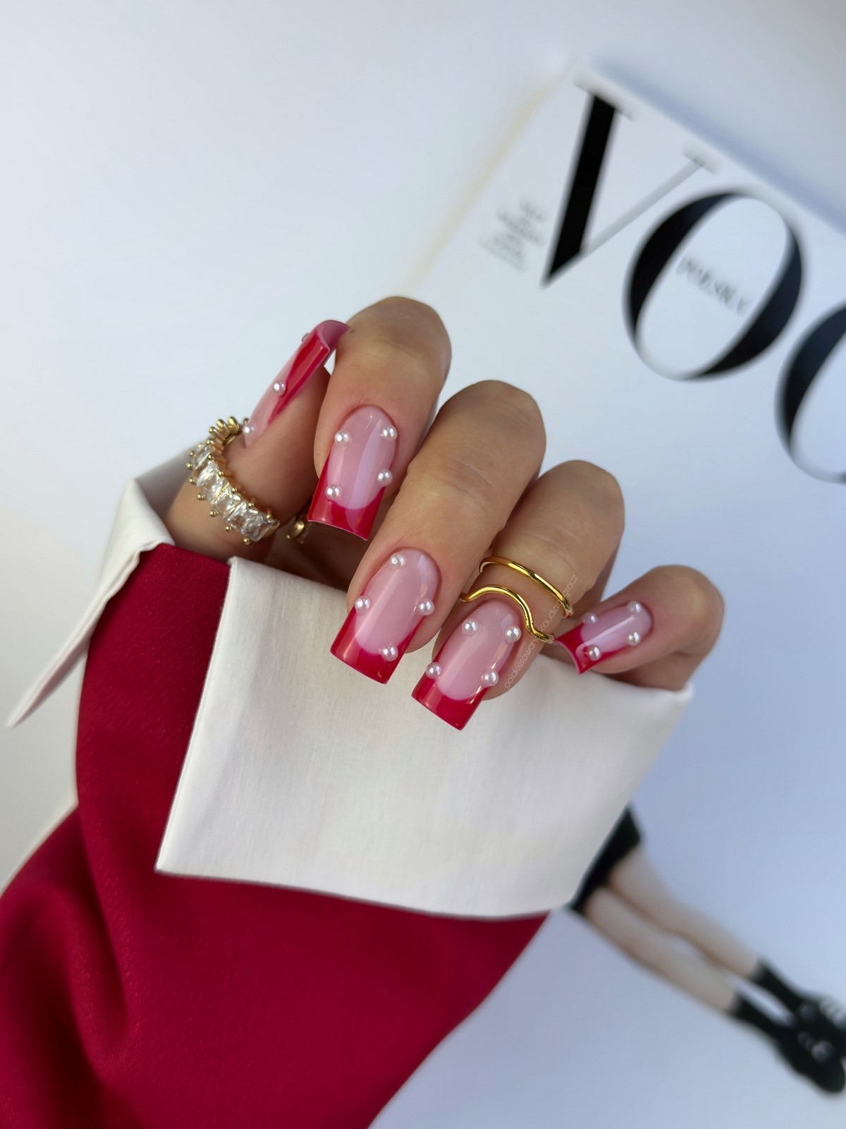 В этом сезоне жемчуг отлично сочетается с молочными и пастельными оттенками, а также с прозрачной базой. Мастера часто комбинируют жемчуг с серебристыми акцентами или тонким мерцающим градиентом, создавая мягкое «снежное» сияние.
