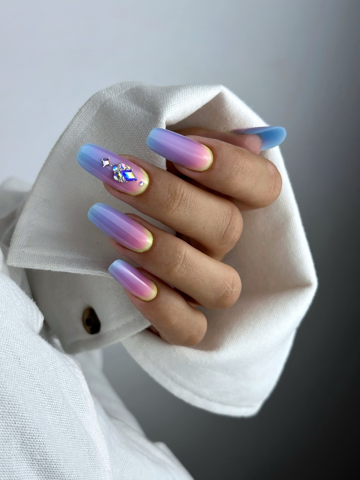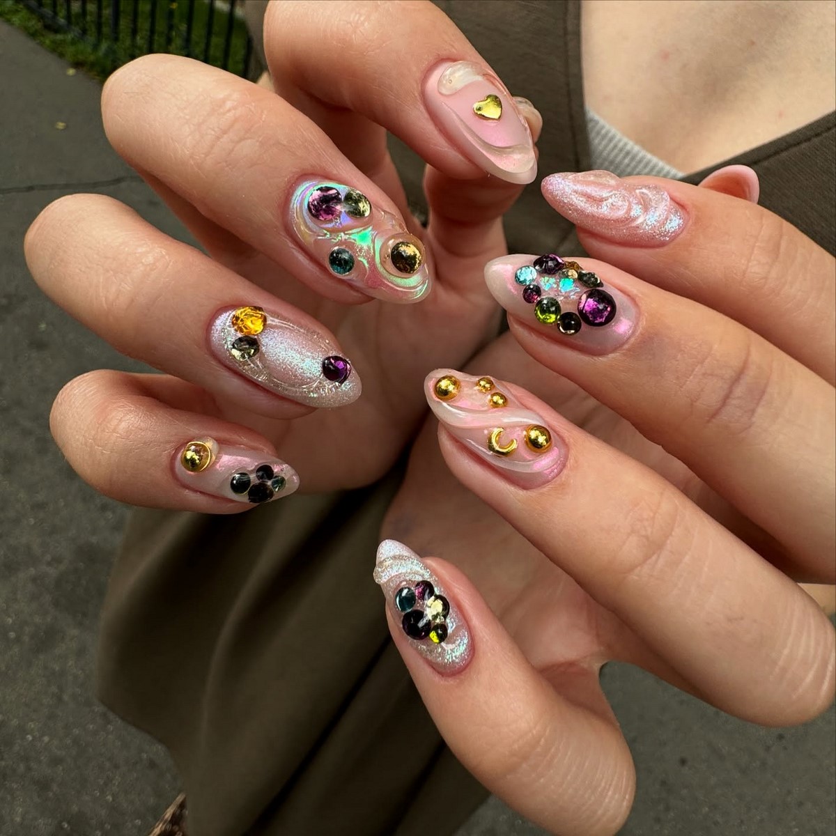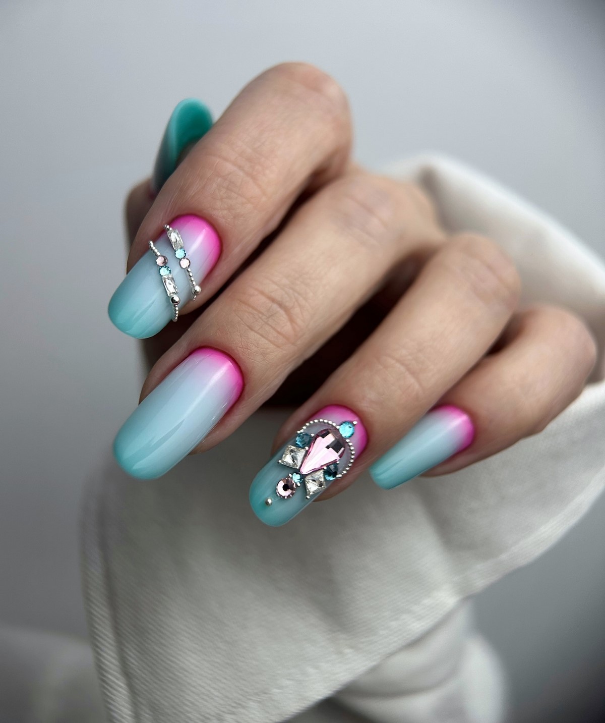 Этот тренд хорош тем, что подходит как для ежедневного образа, так и для праздничного, не вызывая ощущение «перебора». Цветные стразы привносят мягкое сияние и обеспечивают эффект дорогой текстуры.