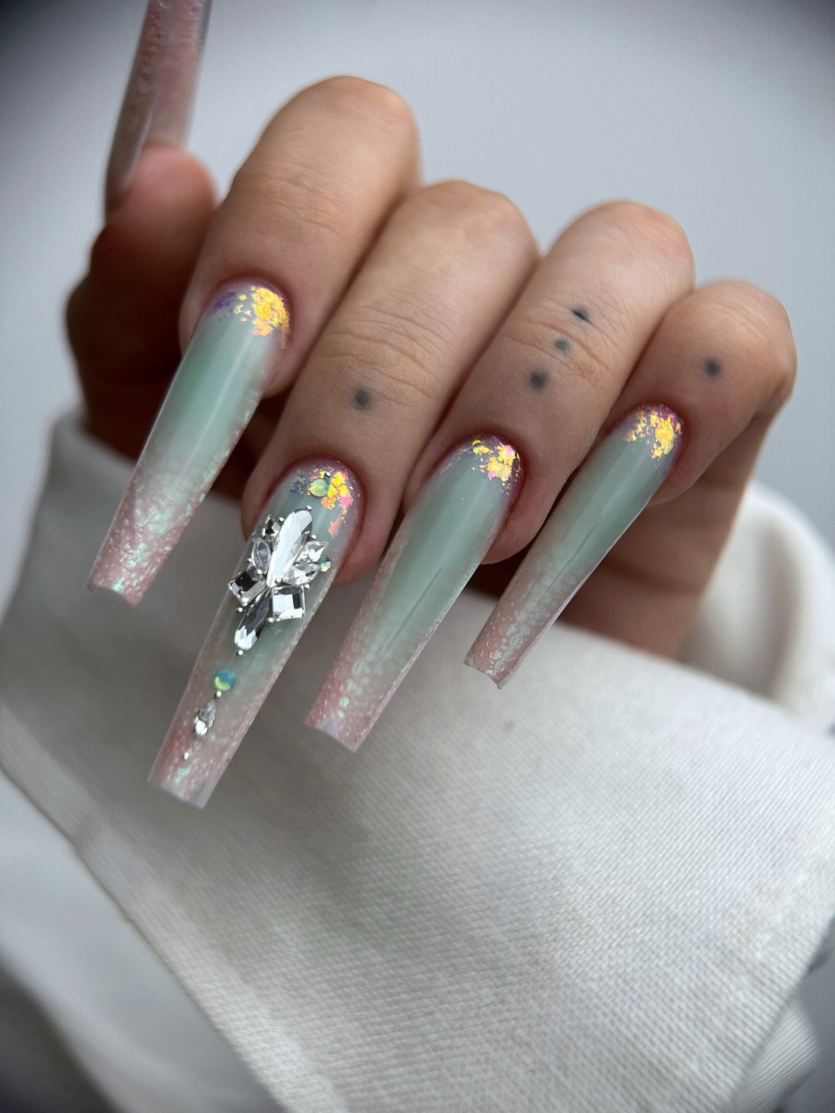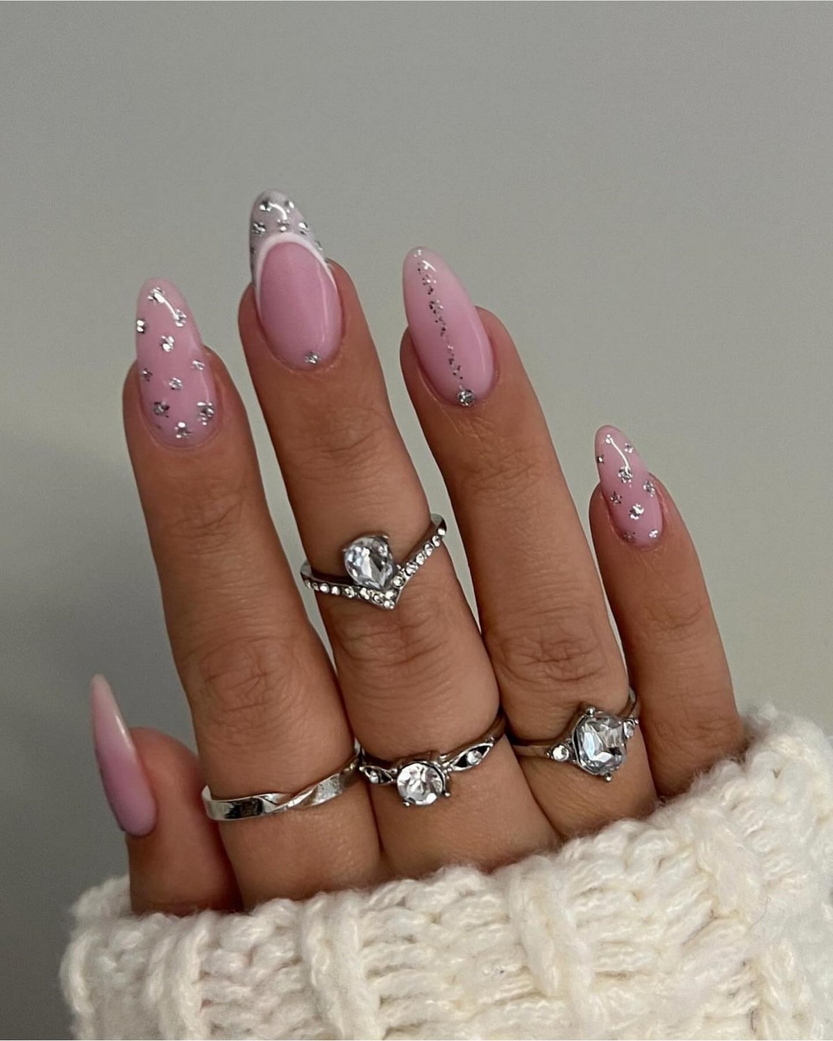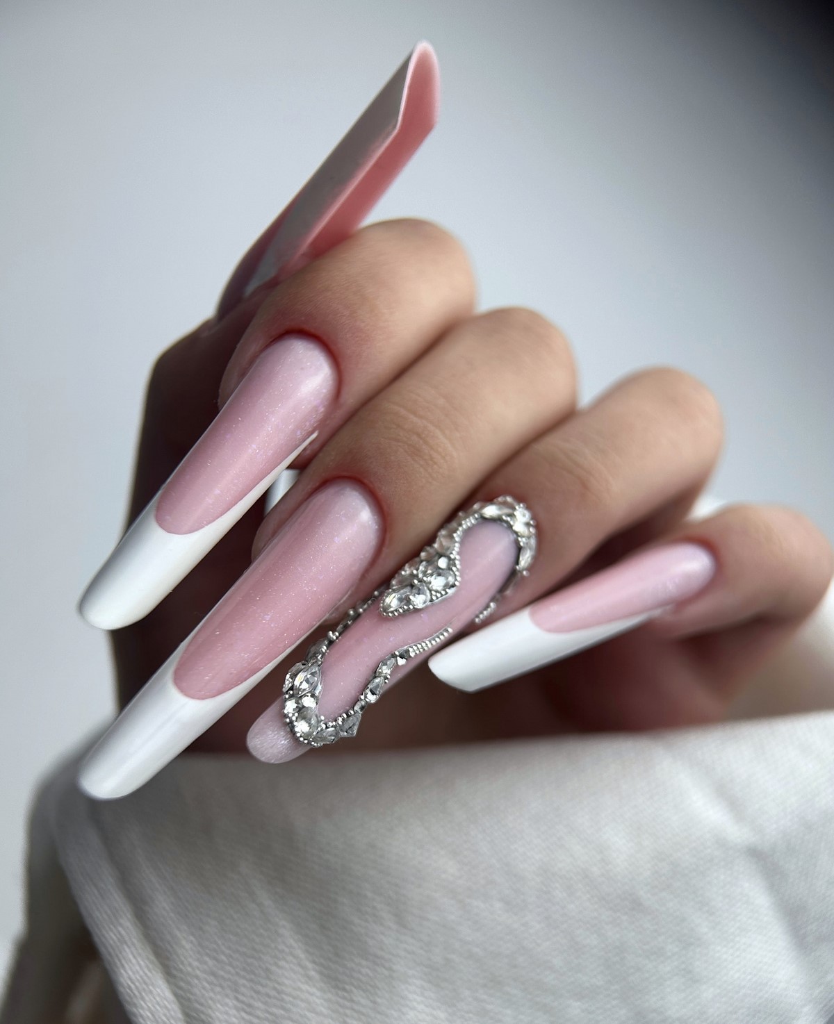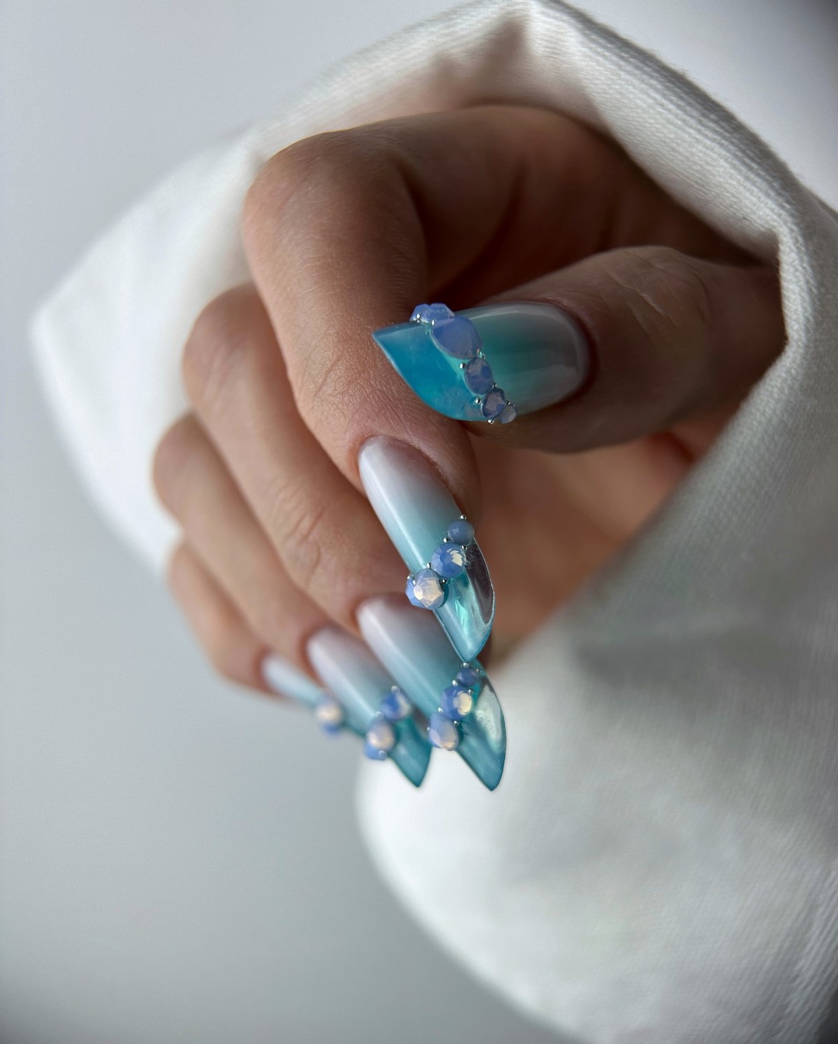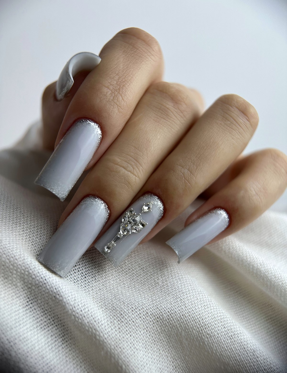 В 2025-2026 сезоне мастера делают ставку на мелкие и средние стразы, равномерно распределённые по поверхности ногтя. Эффект получается воздушным и многомерным, особенно если использовать камни серебристых, ледяных или перламутровых оттенков. Такой маникюр идеально дополнит вечерний наряд, меховые аксессуары или праздничные платья.