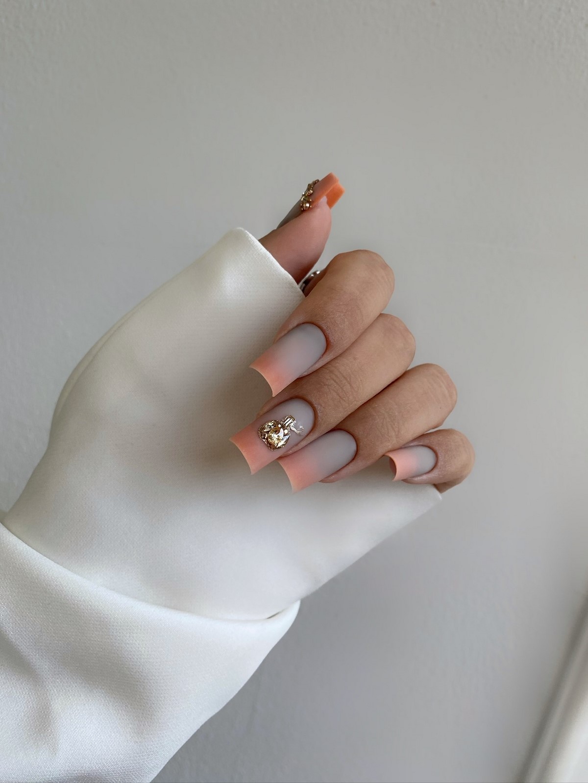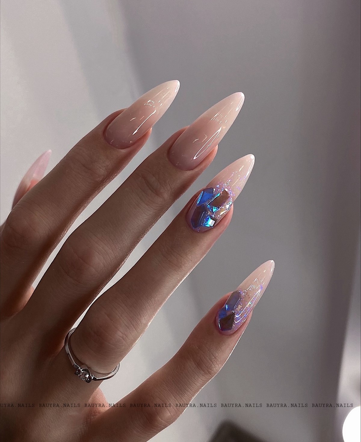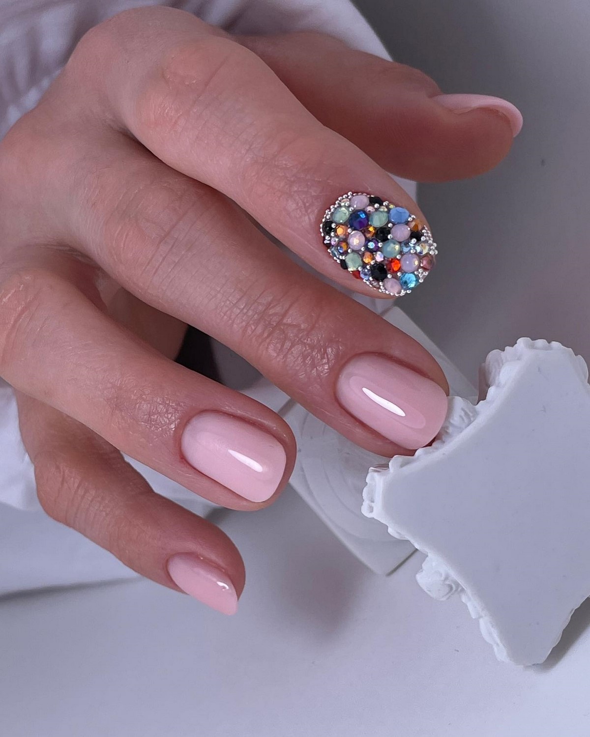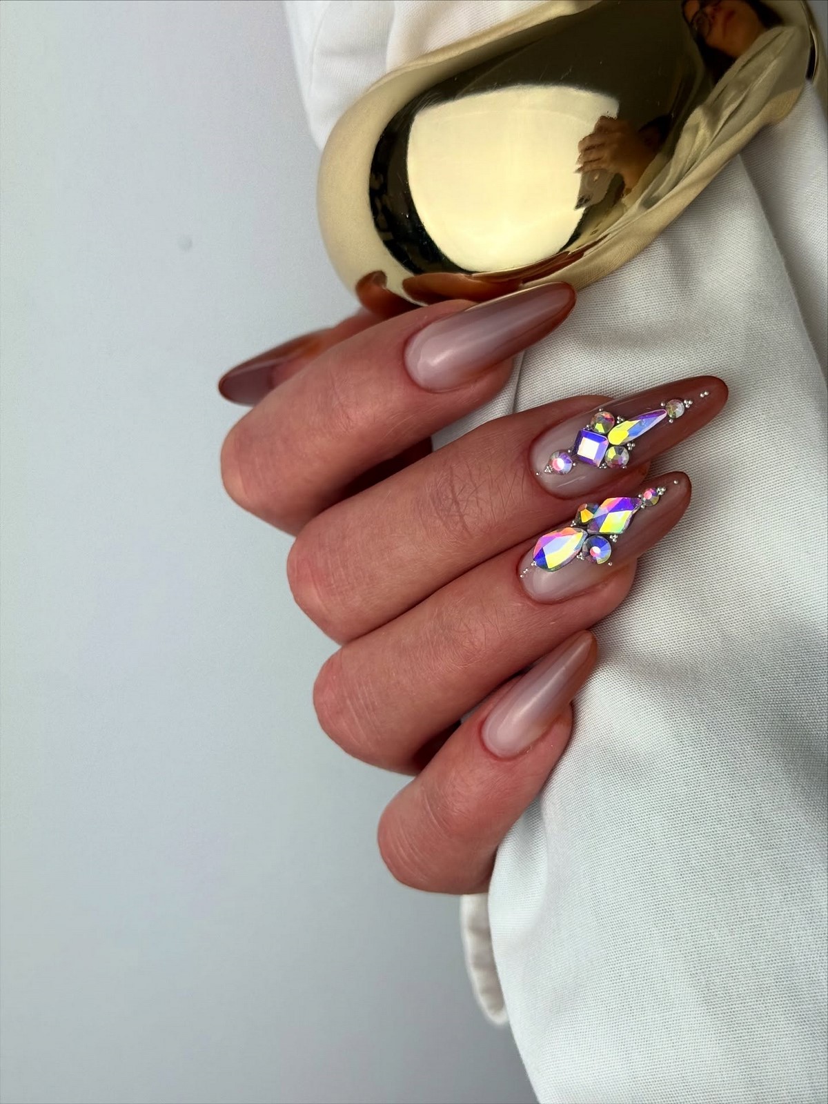 В 2025-2026 году особенно популярны крупные одиночные камни, размещённые на одном-двух ноготках. Это позволяет сделать маникюр выразительным, но не перегруженным. Дополнять такие элементы принято мягкими базовыми оттенками — молочным, нюдовым, серым или дымчато-голубым.