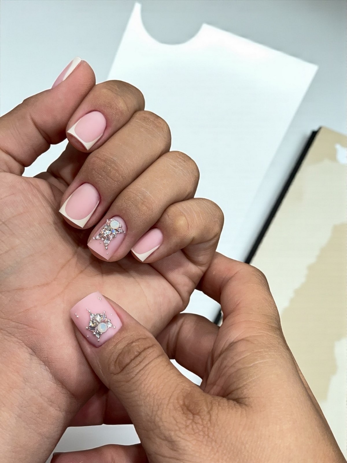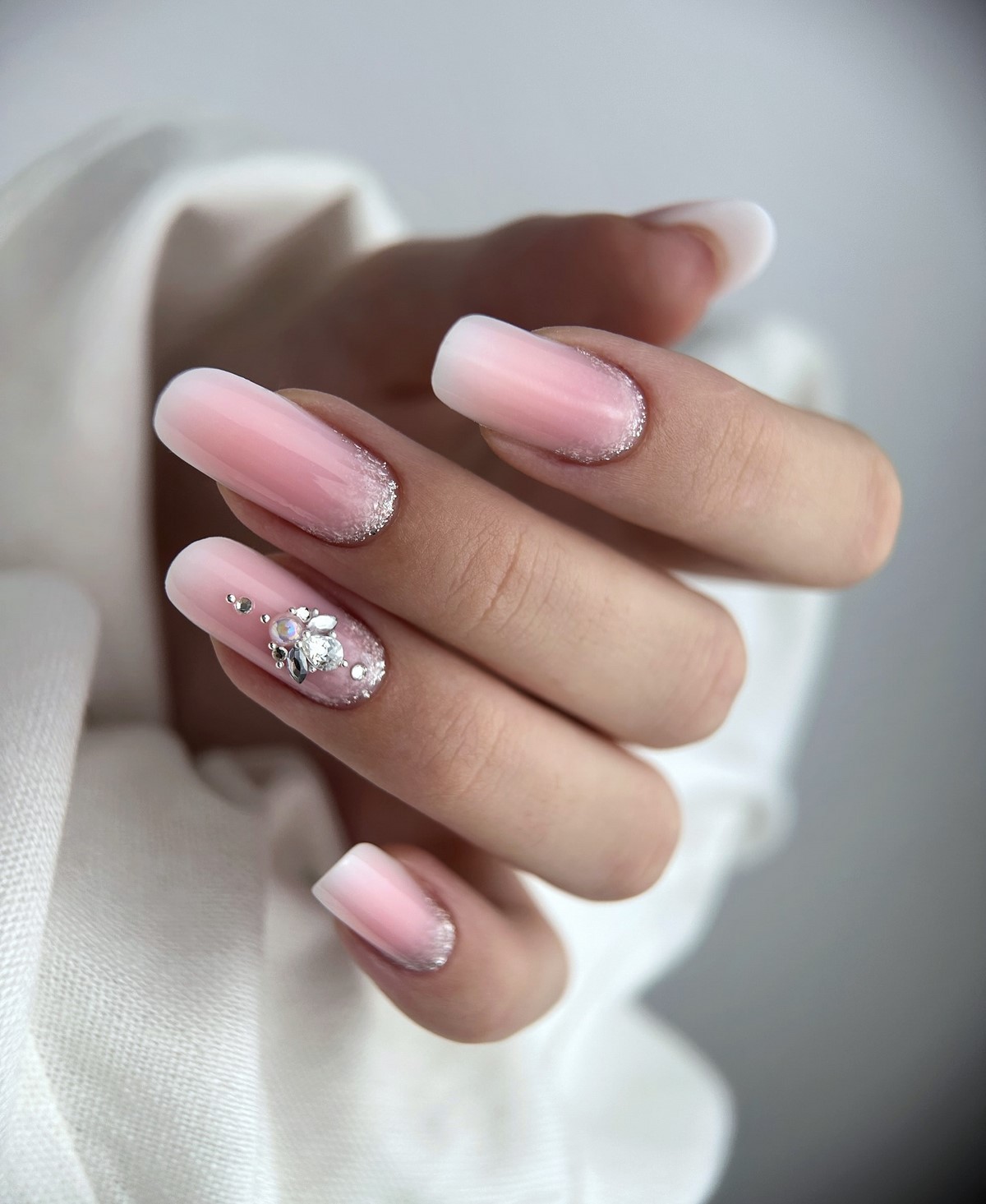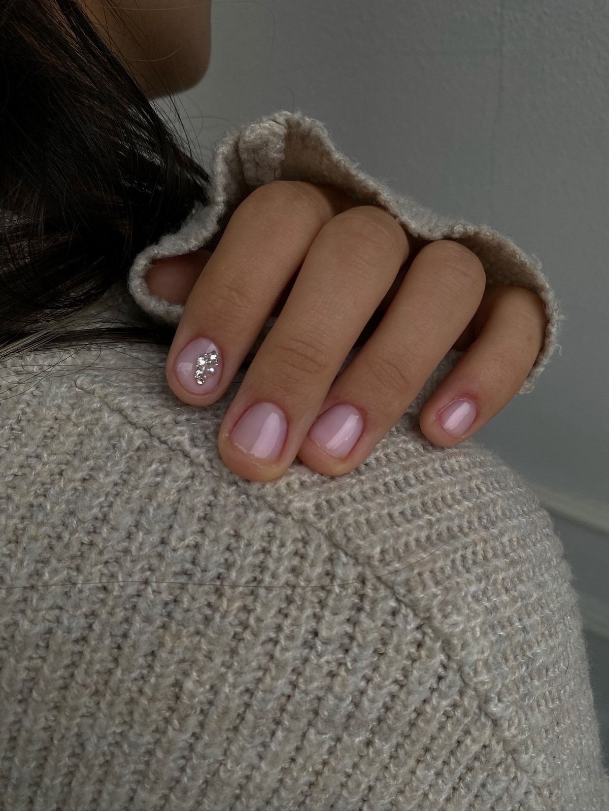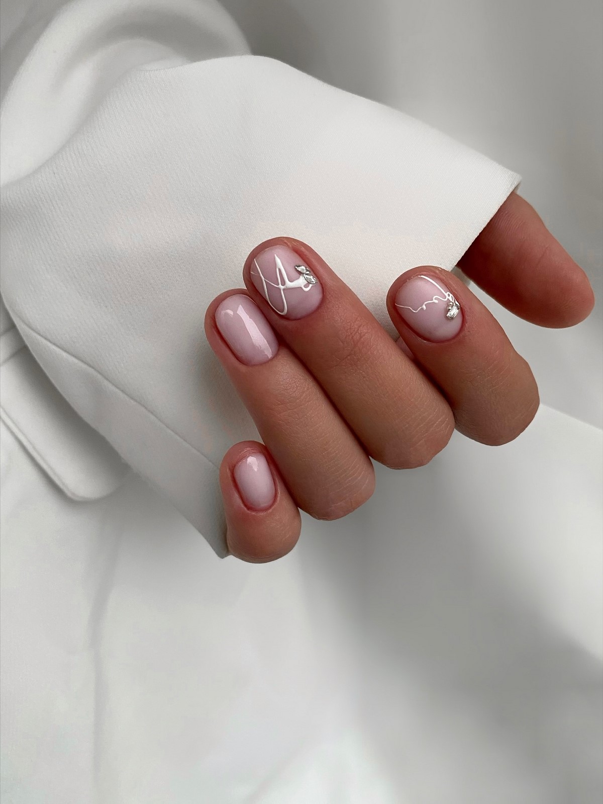 Один-два маленьких камня на нескольких ноготках, тонкие линии со стразами или миниатюрная жемчужная точка у основания ногтя — всё это смотрится утончённо и современно. В 2025-2026 году такие дизайны актуальны в сочетании с мягкими оттенками: сливочным, бежевым, пыльно-розовым и голубым.