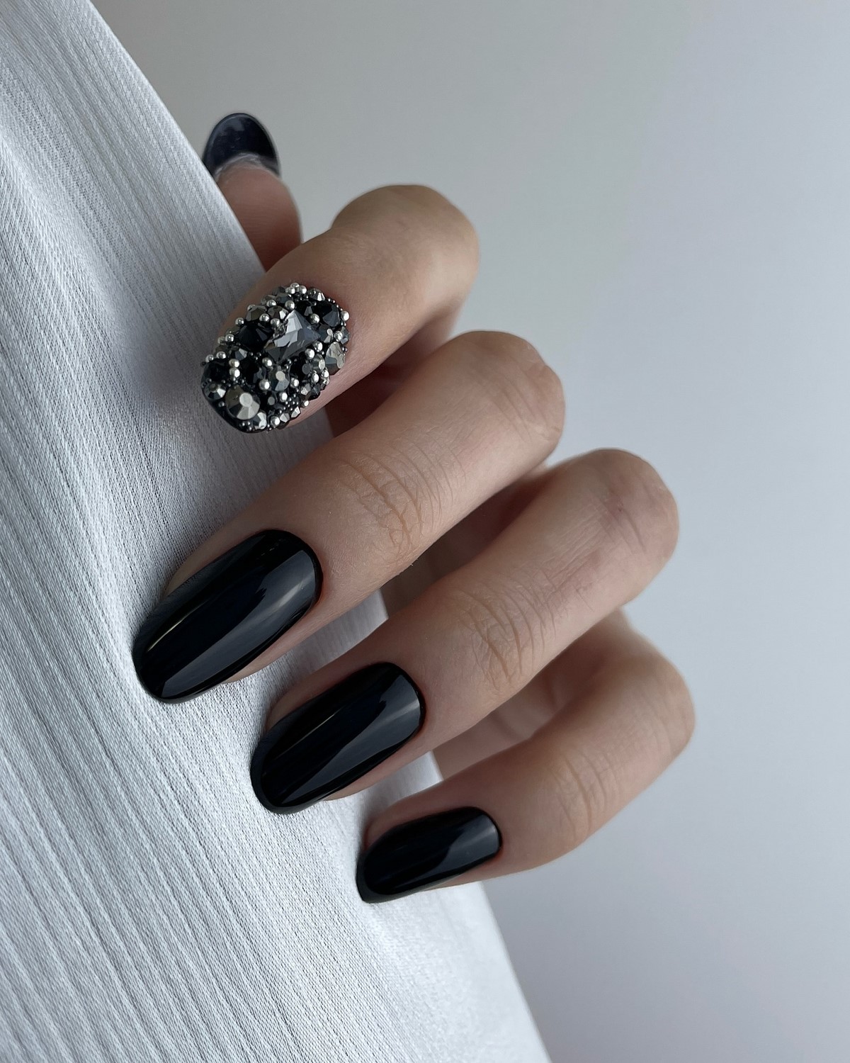 Крупные стразы уверенно удерживают позиции среди главных зимних трендов. Они создают эффект «ювелирного» ногтя, привлекая максимум внимания. Такой дизайн идеально подходит для особых выходов: он выглядит роскошно, дорого и может стать акцентом всего образа.